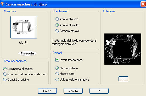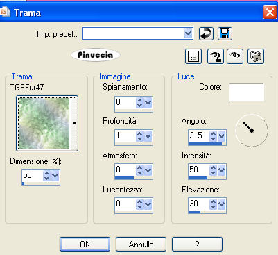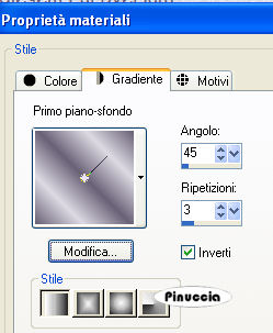 qui puoi trovare qualche risposta ai tuoi dubbi. Se l'argomento che ti interessa non è presente, ti prego di segnalarmelo. Questo tutorial è stato creato con PSP 9, ma può essere eseguito anche con le altre versioni di PSP. Per tradurlo, ho usato PSP X. Questo tutorial è una creazione di ©Sille e non può essere copiato su altri siti nè essere offerto per il download. Lo stesso vale per la mia traduzione. Occorrente: Un tube a scelta. Il resto del materiale qui Il tube che ho usato è di Angie. Filtri: FM Tile Tools - Blend Emboss qui Graphics Plus - Cross Shadow qui Metti l'ornamento "Sparkelsilver" nella cartella Ornamenti. Metti l'immagine TGSFur45 nella cartella Trame. Metti la maschera tde71 nella cartella Maschere. 1. Apri una nuova immagine trasparente 650 x 550 pixels. Scegli due colori dai tuoi tubes. Imposta il colore chiaro come colore di primo piano, e il colore scuro come colore di sfondo. Riempi l'immagine trasparente con il colore scuro.Livelli>Nuovo livello raster. Riempi con il colore chiaro.Livelli>Carica/Salva maschera>Carica maschera da disco. Cerca e carica la maschera tde71: ![]() Livelli>Elimina e rispondi sì alla domanda Unire la maschera nel livello corrente. Livelli>Unisci>Unisci gruppo. Effetti>Plugins>FM Tile Tools - Blend Emboss, con i settaggi standard. ![]() Effetti>Effetti 3D>Sfalsa ombra: ![]() 2. Attiva il livello inferiore. Effetti>Effetti di trama>Trama - seleziona la trama TGSFur45, con i seguenti settaggi: ![]() (naturalmente, se preferisci, puoi usare un'altra trama) Effetti>Plugins>Graphics Plus - Cross Shadow: ![]() 3. Attiva lo strumento Selezione , rettangolo,e traccia una selezione dentro la cornice della maschera: ![]() (rimani però posizionato sul livello inferiore). Livelli>Nuovo livello raster. Passa il colore di primo piano a Gradiente di primo piano/sfondo: ![]() Riempi la selezione con il gradiente.Regola>Sfocatura>Sfocatura gaussiana - raggio 30: ![]() Apri il tube con la scala - "detrap" - e vai a Modifica>Copia. Torna al tuo lavoro e vai a Modifica>Incolla nella selezione. Selezione>Deseleziona. 4. Attiva il livello superiore. Apri il tuo tube e vai a Modifica>Copia. Torna al tuo lavoro e vai a Modifica>Incolla come nuovo livello. Immagine>Ridimensiona, se e quanto necessario. Effetti>Effetti 3D>Sfalsa ombra, con i settaggi precedenti. Posiziona il tube nell'angolo in basso a destra.5. Immagine>Aggiungi bordatura, 3 pixels, simmetriche, con il colore chiaro. Immagine>Aggiungi bordatura, 3 pixels, simmetriche, con il colore scuro. Immagine>Aggiungi bordatura, 3 pixels, simmetriche, con il colore chiaro. Aggiungi il tuo nome e/o il tuo watermark; se vuoi, aggiungi un testo all'immagine. Livelli>Unisci>Unisci visibile. 6. Livelli>Duplica, 2 volte. Nascondi questi due livelli e attiva il livello inferiore. Attiva lo strumento Ornamento ![]() cerca e seleziona l'ornamento Sparkelsilver. Applica delle stelle usando varie dimensioni (io ho usato per alcune la scala 80, per altre la scala 100). Quando hai fatto, chiudi questo livello, e attiva il livello successivo. Ripeti l'applicazione delle stelle. Quando hai fatto, chiudi questo livello e attiva il successivo ripetendo l'applicazione dell'ornamento. 7. Per finire, riapri tutti i livelli: Livelli>Visualizza>Tutto. Salva in formato pspimage. 8. Apri Animation Shop e apri il file che hai appena salvato e che sarà composto da tre fotogrammi. Clicca sul primo fotogramma per selezionarlo e vai a Modifica>Seleziona tutto. Animazione>Proprietà fotogramma e imposta la velocità a 30. ![]() Controlla il risultato cliccando su e salva in formato gif.Variante senza l'animazione. ![]() Se hai problemi o dubbi, o trovi un link non funzionante, o anche soltanto per un saluto, scrivimi. 22 Novembre 2008 |