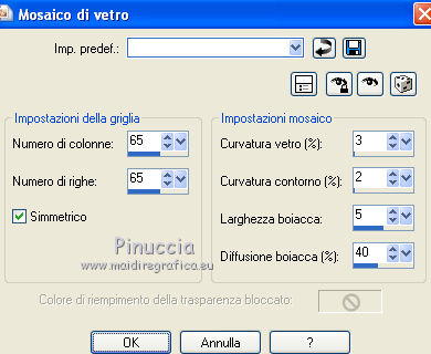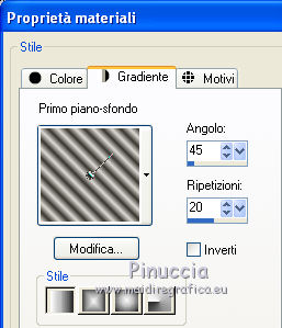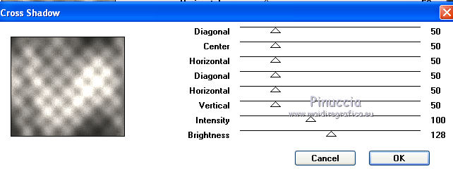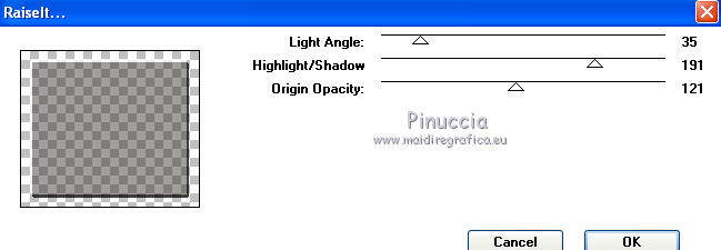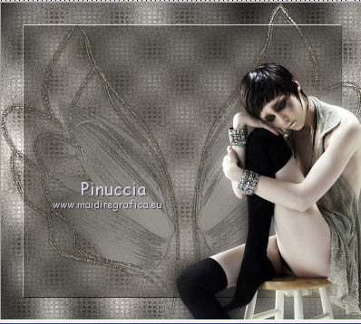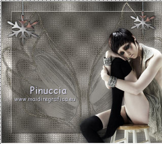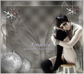 Se intendi usare il font, aprilo e minimizzalo. Lo troverai nella lista dei font disponibili quando ti servirà. ![]() 1. Apri una nuova immagine trasparente 800 x 700 pixels. Scegli due colori dai tuoi tubes. Per il mio esempio ho usato come colore di primo piano il colore chiaro #ddd9d4, e come colore di sfondo il colore scuro #38352e. Passa il colore di primo piano a Gradiente. ![]() Riempi l'immagine trasparente con il gradiente.Livelli>Duplica. Immagine>Rifletti. Abbassa l'opacità di questo livello al 50%. Livelli>Unisci>Unisci giù. Effetti>Effetti di trama>Mosaico di vetro. ![]() Effetti>Plugins>Graphics Plus - Cross Shadow. ![]() 2. Livelli>Nuovo livello raster. Selezione>Seleziona tutto. Apri il tube "deco_010" e vai a Modifica>Copia. Torna al tuo lavoro e vai a Modifica>Incolla nella selezione. Selezione>Deseleziona. Immagine>Rifletti. Effetti>Effetti di bordo>Aumenta. Effetti>Effetti 3D>Sfalsa ombra. ![]() Rinomina questo livello "ali". 3. Livelli>Nuovo livello raster. Selezione>Seleziona tutto. Selezione>Modifica>Contrai - 50 pixels. ![]() Riempi la selezione con il colore scuro di sfondo.Selezione>Deseleziona. Effetti>Plugins>DC Layer - RaiseIt ![]() 4. Apri il tuo tube della donna e vai a Modifica>Copia. Torna al tuo lavoro e vai a Modifica>Incolla come nuovo livello. Immagine>Ridimensiona, se e quanto necessario. Per il mio esempio all'80%, tutti i livelli non selezionato. Regola>Messa a fuoco>Metti a fuoco. Posiziona correttamente il tube.Livelli>Duplica e attiva il livello sottostante dell'originale. Regola>Sfocatura>Sfocatura gaussiana - raggio 20. ![]() Attiva il livello superiore. Livelli>Unisci>Unisci giù. ![]() 5. Apri il tube "calguisdecornoel1119". Attiva il livello "Copie(2) sur Raster1" e vai a Modifica>Copia. Torna al tuo lavoro e vai a Modifica>Incolla come nuovo livello. Spostalo in alto a sinistra.Effetti>Effetti 3D>Sfalsa ombra. ![]() Livelli>Duplica. Immagine>Ridimensiona, all'80%, tutti i livelli non selezionato. ![]() Regola>Messa a fuoco>Metti a fuoco. Sposta questo tube in alto a destra.![]() 6. Apri il tube con la pallina di natale "chrismist_hol06_sepia - o una decorazione a tua scelta, e vai a Modifica>Copia. Torna al tuo lavoro e vai a Modifica>incolla come nuovo livello. Immagine>Ridimensiona, se e quanto necessario. Per il mio esempio al 70%, tutti i livelli non selezionato. Regola>Messa a fuoco>Metti a fuoco. Poichè questo tube ha tinte forti, non ho aggiunto sfalsa ombra. Dovrai decidere in base al tube che hai scelto. Per il mio esempio ho aggiunto: Regola>Tonalità e saturazione>Viraggio: ![]() Livelli>Duplica. Immagine>Ridimensiona, al 70%, tutti i livelli non selezionato. Regola>Messa a fuoco>Metti a fuoco. Sposta questo duplicato un po' più a destra.Livelli>Disponi>Sposta giù. ![]() 7. Attiva nuovamente il livello superiore. Apri il tube "hummingbirds" e vai a Modifica>Copia. Torna al tuo lavoro e vai a Modifica>incolla come nuovo livello. Immagine>Ridimensiona, al 60%, tutti i livelli non selezionato. Regola>Messa a fuoco>Metti a fuoco. Sposta questo tube al centro dell'immagine.Effetti>Effetti 3D>Sfalsa ombra, con i settaggi precedenti. 8. Livelli>Nuovo livello raster. Selezione>Seleziona tutto. Riempi la selezione con il gradiente del punto 1.Selezione>Modifica>Contrai - 5 pixels. ![]() Premi sulla tastiera il tasto CANC. Selezione>Inverti. Effetti>Plugins>Graphics Plus: ![]() Effetti>Effetti 3D>Smusso a incasso. ![]() Selezione>Deseleziona. 9. Scrivi il tuo testo, o usa il file di testo fornito con il materiale. Aggiungi il tuo nome e/o il tuo watermark su un nuovo livello. 10. Attiva il livello "Wings". Effetti>Plugins>Alien Skin Xenofex - Constellation. ![]() Modifica>Copia Unione. Apri Animation Shop e vai a Modifica>Incolla>Incolla come nuova animazione. Torna in PSP. Modifica>Annulla azione Constellation. Ripeti l'Effetto Constellation con gli stessi settaggi, ma cliccando una volta su Random Seed. ![]() Modifica>Copia Unione. Torna in Animation Shop e vai a Modifica>Incolla>Incolla dopo il fotogramma corrente. Di nuovo in PSP. Modifica>Annulla azione Constellation. Ripeti l'Effetto Constellation con gli stessi settaggi, cliccando una volta su Random Seed. Modifica>Copia Unione. Per finire, in Animation Shop: Modifica>Incolla>Incolla dopo il fotogramma corrente. Controlla il risultato cliccando su Visualizza e salva in formato gif.