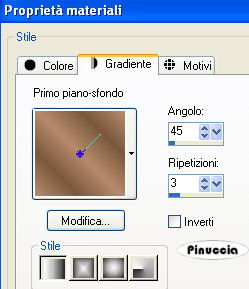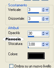qui puoi trovare qualche risposta ai tuoi dubbi. Se l'argomento che ti interessa non è presente, ti prego di segnalarmelo. Questo tutorial è stato creato con PSP 9, ma può essere eseguito anche con le altre versioni di PSP. Per tradurlo, ho usato PSP X. Questo tutorial è una creazione di ©Sille e non può essere copiato su altri siti nè essere offerto per il download. Lo stesso vale per la mia traduzione. Grazie ai creatori dei tubes che mettono a disposizione il loro lavoro in vari gruppi di condivisione. Il materiale scrap usato per questo tutorial è di Simply Irresistible Designz Rispetta il lavoro degli autori, non cambiare il nome del file e non cancellare il watermark. Occorrente: Materiale qui 1. Apri una nuova immagine trasparente 700 x 500 pixels. Scegli due colori dai tuoi tubes. Imposta il colore chiaro come colore di primo piano, e il colore scuro come colore di sfondo. Passa il colore di primo piano a Gradiente di primo piano/sfondo: ![]() Selezione>Seleziona tutto. Apri "Paper3-Extra" e vai a Modifica>Copia. Torna al tuo lavoro e vai a Modifica>Incolla nella selezione. Selezione>Deseleziona. Livelli>Nuovo livello raster. Selezione>Seleziona tutto. Selezione>Modifica>Contrai - 15 pixels. ![]() Apri "Paper7" e vai a Modifica>Copia. Torna al tuo lavoro e vai a Modifica>Incolla nella selezione. Selezione>Deseleziona. Effetti>Effetti 3D>Sfalsa ombra: ![]() Ripeti l'Effetto Sfalsa ombra, cambiando verticale e orizzontale con -5. Immagine>Ruota per gradi - 40 gradi a destra: ![]() Sposta la carta come nel mio esempio.![]() 2. Apri la cornice "CocoaWishesAddon-SID-Frame" e vai a Modifica>Copia. Torna al tuo lavoro e vai a Modifica>Incolla come nuovo livello. Immagine>Ridimensiona, al 70%, tutti i livelli non selezionato. ![]() Regola>Messa a fuoco>Metti a fuoco. Attiva lo strumento Bacchetta magica ![]() e clicca al centro della cornice. Selezione>Modifica>Espandi - 3 pixels. ![]() Livelli>Nuovo livello raster. Riempi con il gradiente.Regola>Sfocatura>Sfocatura gaussiana - raggio 25: ![]() Selezione>Deseleziona. Livelli>Disponi>Sposta giù. Attiva il livello della cornice. Livelli>Unisci>Unisci giù. Effetti>Effetti 3D>Sfalsa ombra, con i settaggi usati al punto 1, compresa la ripetizione a -5. 3. Apri il tube "A fairy by monicakuo" e vai a Modifica>Copia. Torna al tuo lavoro e vai a Modifica>Incolla come nuovo livello. Immagine>Ridimensiona, all'80%, tutti i livelli non selezionato. Posiziona il tube nell'area della cornice.Attiva il livello della cornice. Livelli>Unisci>Unisci giù. Immagine>Ruota per gradi - 15 gradi a sinistra. ![]() Regola>Messa a fuoco>Metti a fuoco. 4. Apri il tube "CocoaWishes-SID-RibbonChain2" e vai a Modifica>Copia. Torna al tuo lavoro e vai a Modifica>Incolla come nuovo livello. Immagine>Ridimensiona, al 60%, tutti i livelli non selezionato. Immagine>ruota per gradi - 25 gradi a sinistra: ![]() Regola>Messa a fuoco>Metti a fuoco. Posiziona il nastro nell'angolo in alto a sinistra.Effetti>Effetti 3D>Sfalsa ombra: ![]() 5. Apri il tube "CocoaWishes-SID-RicRac2" e vai a Modifica>Copia. Torna al tuo lavoro e vai a Modifica>Incolla come nuovo livello. Effetti>Effetti 3D>Sfalsa ombra, con i settaggi precedenti. Livelli>Duplica. Immagine>Ruota per gradi - 90 gradi a sinistra. ![]() Posiziona i nastri come nel mio esempio.![]() 6. Apri il tube "CocoaWishes-SID-Bow5" e vai a Modifica>Copia. Torna al tuo lavoro e vai a Modifica>Incolla come nuovo livello. Immagine>Ridimensiona, al 50%, tutti i livelli non selezionato. Immagine>ruota per gradi - 15 gradi a sinistra. Regola>Messa a fuoco>Metti a fuoco. Effetti>Effetti 3D>Sfalsa ombra, con i settaggi precedenti. Posiziona il fiocco in alto a sinistra, sulla catena del nastro.7. Apri il tube"CocoaWishes-SID-GlitterDoodle1" e vai a Modifica>Copia. Torna al tuo lavoro e vai a Modifica>Incolla come nuovo livello. Immagine>Ridimensiona, al 50%, tutti i livelli non selezionato. Regola>Messa a fuoco>Metti a fuoco. Effetti>Effetti 3D>Sfalsa ombra, con i settaggi precedenti. Posiziona la decorazione nell'angolo in basso a sinistra.![]() 8. Apri il tube "CocoaWishes-SID-Butterfly1" e vai a Modifica>Copia. Torna al tuo lavoro e vai a Modifica>Incolla come nuovo livello. Immagine>Ridimensiona, all'80%, tutti i livelli non selezionato. Regola>Messa a fuoco>Metti a fuoco. Effetti>Effetti 3D>sfalsa ombra, con i settaggi precedenti. Sposta la farfalla a destra (vedi il mio esempio).9. Attiva lo strumento Testo e scrivi un testo sull'immagine, senza dimenticare di aggiungere il tuo nome e/o il tuo watermark.Immagine>Aggiungi bordatura, 1 pixel, con un colore scuro scelto dallo sfondo del tuo lavoro e salva in formato jpg. Se hai problemi o dubbi, o trovi un link non funzionante, o anche soltanto per un saluto, scrivimi. 14 Febbraio 2009 |