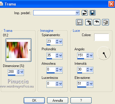 Effetti>Effetti di trama>Trama - seleziona la trama "012" con i seguenti settaggi.