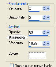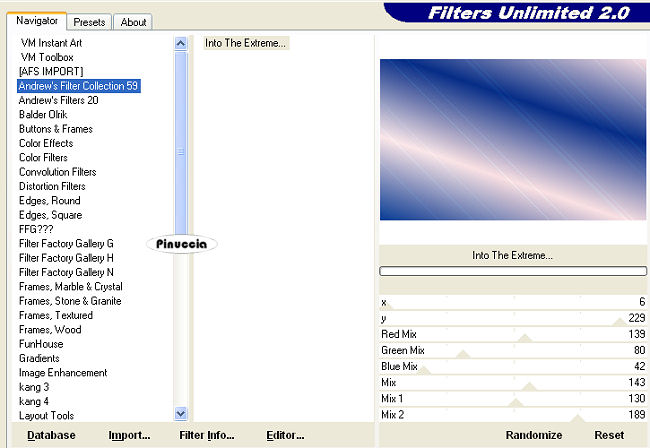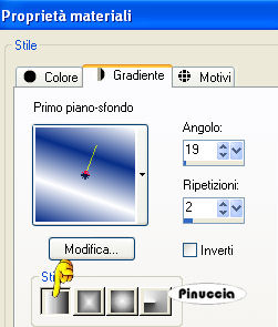 qui puoi trovare qualche risposta ai tuoi dubbi. Se l'argomento che ti interessa non è presente, ti prego di segnalarmelo. Questo tutorial è stato creato con PSP X2, ma può essere eseguito anche con le altre versioni di PSP. Per tradurlo, ho usato PSP X. Occorrente: Materiale qui Grazie per le maschere Hans Paint Shop Pro Palace e Cameron. Filtri: Filters Unlimited 2.0 qui Andrews Filter 59 qui i filtri Andrews per essere usati devono essere prima convertiti. Come fare vedi qui Si usano importandoli in Filters Unlimited (come fare vedi qui), ma possono funzionare anche da soli Apri il materiale in PSP, comprese la maschere. 1. Apri una nuova immagine trasparente 900 x 550 pixels. Imposta il colore di primo piano con #082e88, e il colore di sfondo con il bianco #ffffff. Passa il colore di primo piano a Gradiente di primo piano/sfondo, con i seguenti settaggi: ![]() 2. Effetti>Plugins>Filters Unlimited - Andrews Filter 59 - Into the Extreme: ![]() 3. Regola>Messa a fuoco>Accentua messa a fuoco. 4. Livelli>Nuovo livello raster. Selezione>Seleziona tutto. Apri il tube del paesaggio "aclis_paisaje_02_15_09" e vai a Modifica>Copia. Torna al tuo lavoro e vai a Modifica>Incolla nella selezione. Selezione>Deseleziona. Cambia la modalità di miscelatura di questo livello in Luminanza (esistente). 5. Livelli>Nuovo livello raster. Riempi con il colore di sfondo bianco.Livelli>Nuovo livello maschera>Da immagine. Apri il menu sotto la finestra di origine e vedrai tutti i files aperti. Seleziona la maschera hjr_mask_curves2: ![]() Livelli>Unisci>Unisci gruppo. Effetti>Effetti 3D>Sfalsa ombra, con i seguenti settaggi, colore nero. ![]() Ripeti l'Effetto Sfalsa ombra, cambiando verticale e orizzontale con -1 e il colore dell'ombra con il bianco. ![]() nel mio esempio ho aggiunto questo passaggio: Effetti>Effetti di immagine>Motivo unico, con i settaggi standard: ![]() ![]() 6. Apri il tube "Dyveke-Window" e vai a Modifica>Copia. Torna al tuo lavoro e vai a Modifica>Incolla come nuovo livello. Immagine>Rifletti. Sposta il tube a destra, contro il bordo.Nel mio esempio ho cambiato la modalità di miscelatura di questo livello in Luce netta. Effetti>Effetti 3D>Sfalsa ombra: ![]() 7. Apri il tube "Roma_misted_couple_18-08" e vai a Modifica>Copia. Torna al tuo lavoro e vai a Modifica>Incolla come nuovo livello. Immagine>Rifletti. Immagine>Ridimensiona, al 120%, tutti i livelli non selezionato. Sposta il tube a sinistra.Cambia la modalità di miscelatura di questo livello in Luminanza (Esistente). Nella paletta dei livelli sposta questo livello sotto il livello della maschera ![]() 8. Livelli>Nuovo livello raster. Riempi il livello con il colore #b6abc7.Livelli>Nuovo livello maschera>Da immagine: seleziona la maschera "maskcameronF14": ![]() Livelli>Unisci>Unisci gruppo. Effetti>Effetti 3D>sfalsa ombra, come al punto 6, ma con il colore dell'ombra #ffffff. ![]() Abbassa l'opacità di questo livello al 24%. nel mio esempio ho aggiunto questo passaggio. Attiva lo strumento Puntatore (tasto D sulla tastiera),e tira la maschera pressappoco come nell'esempio. ![]() 9. Attiva lo strumento Testo e scrivi un testo sull'immagine, senza dimenticare di aggiungere il tuo nome e/o il tuo watermark.10. Immagine>Aggiungi bordatura, 10 pixels, simmetriche, con il colore #ffffff. Immagine>Aggiungi bordatura, 20 pixels, simmetriche, con il colore #a7a5b4. Hai finito. Puoi salvare in formato jpg. Se hai problemi o dubbi, o trovi un link non funzionante, o anche soltanto per un saluto, scrivimi. 4 Marzo 2009 |