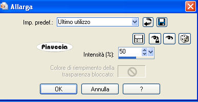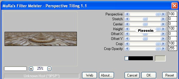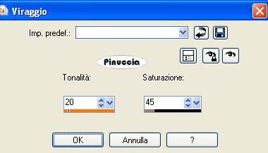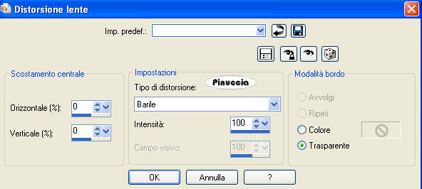 qui puoi trovare qualche risposta ai tuoi dubbi. Se l'argomento che ti interessa non è presente, ti prego di segnalarmelo. Questo tutorial è stato creato con PSP X2, ma può essere eseguito anche con le altre versioni di PSP. Per tradurlo, ho usato PSP X. Occorrente: Materiale qui Ti servirà anche la maschera 20-20. Se non ce l'hai clicca qui I tubes utilizzati sono di Silvina Vanesa Orsi, Guismo, e Mou. Grazie agli autori dei tubes che hanno realizzato il materiale per eseguire questo tutorial. Filtri: Mura's Meister - Perspective Tile qui 1. Apri una nuova immagine trasparente 950 x 500 pixels. 2. Selezione>Seleziona tutto. 3. Apri la trama "01_silvina_vanesa_orsi_diciembre_2008" e vai a Modifica>Copia. 4. Torna alla tua immagine trasparente e vai a Modifica>Incolla nella selezione. Selezione>Deseleziona. 5. Attiva lo strumento Selezione , rettangolo,e traccia una selezione come nell'esempio. ![]() 6. Effetti>Plugins>Mura's Meister - Perspective Tiling: ![]() 7. Effetti>Effetti 3D>sfalsa ombra, con i seguenti settaggi, colore nero. ![]() Selezione>Deseleziona. 8. Attiva lo strumento Selezione , rettangolo e traccia una selezione nella parte superiore dell'immagine.![]() 9. Effetti>Effetti di distorsione>Mulinello - gradi 720. ![]() 10. Effetti>Effetti di distorsione>Distorsione Lente. ![]() 11. Selezione>Innalza selezione a livello. Effetti>Effetti 3D>Sfalsa ombra, con i seguenti settaggi, colore nero. ![]() 12. Effetti>Effetti di distorsione>Distorsione Lente, con i settaggi precedenti. 13. Selezione>innalza selezione a livello. 14. Apri il tube "cal-guis-stoptime-21102008" e vai a Modifica>Copia. Torna al tuo lavoro e vai a Modifica>Incolla nella selezione. 15. Effetti>Effetti 3D>sfalsa ombra, con i seguenti settaggi, colore nero. ![]() Selezione>Deseleziona. 16. Apri il tube "calguisbeauty28128" e vai a Modifica>Copia. Torna al tuo lavoro e vai a Modifica>Incolla come nuovo livello. Livelli>Duplica. 17. Attiva il livello sottostante (il tube originale). Effetti>Effetti di distorsione>Allarga: ![]() Cambia la modalità di miscelatura di questo livello in Luminanza (esistente), e abbassa l'opacità di questo livello al 60%. 18. Attiva il livello superiore (la copia del tube). Immagine>Ridimensiona, al 90%, tutti i livelli non selezionato. 19. Regola>Tonalità e saturazione>Viraggio ![]() 20. Effetti>Effetti 3D>Sfalsa ombra, con i seguenti settaggi, colore nero. ![]() 21. Apri il tube "esferas_silvina_vanesa_orsi_diciembre_2008" e vai a Modifica>Copia. Torna al tuo lavoro e vai a Modifica>Incolla come nuovo livello. Sposta il tube in basso a destra.Immagine>Rifletti. Livelli>Disponi>Sposta giù. ![]() 22. Attiva nuovamente il livello superiore. Apri il tube "mou_music mann" e vai a Modifica>Copia. Torna al tuo lavoro e vai a Modifica>Incolla come nuovo livello. Immagine>Ridimensiona, al 60%, tutti i livelli non selezionato. Cambia la modalità di miscelatura di questo livello in Luminanza (esistente) e abbassa l'opacità al 52%. Sposta il tube in alto a destra, come nell'esempio.![]() 23. Apri il tube "@nn_121105_cls-strongfree" e vai a Modifica>Copia. Torna al tuo lavoro e vai a Modifica>Incolla come nuovo livello. Immagine>Ridimensiona, al 70%, tutti i livelli non selezionato. Immagine>Rifletti. Regola>Tonalità e saturazione>Viraggio, come al passo 19. Effetti>Effetti 3D>Sfalsa ombra, con i seguenti settaggi, colore nero. ![]() 24. Livelli>Carica/Salva maschera>Carica maschera da disco. Cerca e carica la maschera 20-20: ![]() Livelli>Unisci>Unisci gruppo. Effetti>Effetti 3D>Sfalsa ombra, come al punto 23. 25. Livelli>Unisci>Unisci visibile. Attiva lo strumento Testo e scrivi un testo sull'immagine, senza dimenticare di aggiungere il tuo nome e/o il tuo watermark.26. Immagine>Aggiungi bordatura, 5 pixels, simmetriche, con il colore #afaca8. Immagine>Aggiungi bordatura, 30 pixels, simmetriche, con il colore #69432a. Hai finito. Puoi salvare in formato jpg. Se hai problemi o dubbi, o trovi un link non funzionante, o anche soltanto per un saluto, scrivimi. 15 Febbraio 2009 |