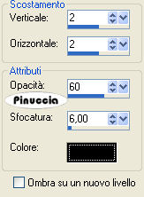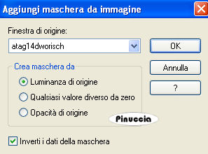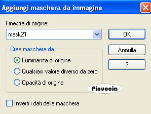 qui puoi trovare qualche risposta ai tuoi dubbi. Se l'argomento che ti interessa non è presente, ti prego di segnalarmelo. Questo tutorial è stato creato con PSP X2, ma può essere eseguito anche con le altre versioni di PSP. Per tradurlo, ho usato PSP X. Occorrente: Materiale qui Le maschere sono di Denise Worisch Il resto del materiale è di Silvina Vanesa Orsi. 1. Imposta il colore di primo piano con il #636244, e il colore di sfondo con #d2d3c4. Apri una nuova immagine trasparente 900 x 550 pixels. e riempila con il colore di primo piano.Livelli>Nuovo livello raster. Riempi con il colore di sfondo #d2d3c4.2. Apri la maschera Mask21 e minimizzala nella tua area di lavoro. Livelli>Nuovo livello maschera>Da immagine: apri il menu sotto la finestra di origine e vedrai la lista dei files aperti. Seleziona la maschera Mask21 con i seguenti settaggi: ![]() Livelli>Unisci>Unisci gruppo. 3. Attiva lo strumento Selezione , rettangolo,e traccia una selezione come nell'esempio. ![]() 4. Livelli>Nuovo livello raster. Riempi con il colore di primo piano #636244.5. Livelli>Nuovo livello raster. Apri il template "PmsTemp42" e vai a Modifica>Copia. Torna al tuo lavoro e vai a Modifica>Incolla nella selezione. Cambia la modalità di miscelatura di questo livello in Luce diffusa. 6. Chiudi i due livelli inferiori. ![]() Livelli>Unisci>Unisci visibile. 7. Riapri i livelli. 8. Effetti>Effetti 3D>Sfalsa ombra, con i seguenti settaggi, colore nero. ![]() Ripeti l'Effetto Sfalsa ombra cambiando verticale e orizzontale con -2. Selezione>Deseleziona. 9. Livelli>Nuovo livello raster. Apri la maschera "atag14dworisch". Immagine>Ruota per gradi - 180 gradi, non importa se a destra o a sinistra. ![]() Minimizza la maschera. 10. Livelli>Nuovo livello maschera>Da immagine. Seleziona la maschera con i seguenti settaggi: ![]() 11. Livelli>Unisci>Unisci gruppo. Effetti>Effetti 3D>Sfalsa ombra, con i seguenti settaggi, colore nero. ![]() 12. Livelli>Nuovo livello raster. Apri il pennello "G8". File>Esporta>come pennello personalizzato, assegna un nome al pennello e clicca ok. Attiva lo strumento Pennello ![]() cerca e seleziona il pennello che hai appena esportato, dimensione 284. ![]() Applicalo in basso a sinistra, cliccando con il tasto destro del mouse per usare il colore chiaro di sfondo #d2d3c4. 13. Apri il tube "111_silvina_vanesa_orsi_enero_22_2009" e vai a Modifica>Copia. Torna al tuo lavoro e vai a Modifica>Incolla come nuovo livello. Sposta il tube a sinistra.14. Se vuoi, scrivi un testo sull'immagine, senza dimenticare di aggiungere il tuo nome e/o il tuo watermark. 15. Immagine>Aggiungi bordatura, 1 pixel, simmetriche, con il colore scuro di primo piano #636244. Immagine>Aggiungi bordatura, 20 pixels, simmetriche, con il colore chiaro di sfondo #d2d3c4. Selezione>Seleziona tutto. Selezione>Inverti. Effetti>Effetti 3D>Sfalsa ombra, con i seguenti settaggi, colore nero. ![]() Ripeti l'Effetto Sfalsa ombra, cambiando verticale e orizzontale con -2. Selezione>Deseleziona. Immagine>Aggiungi bordatura, 10 pixels, simmetriche, con il colore scuro di primo piano #636244. Hai finito. Puoi salvare in formato jpg. Se hai problemi o dubbi, o trovi un link non funzionante, o anche soltanto per un saluto, scrivimi. 15 Febbraio 2009 |