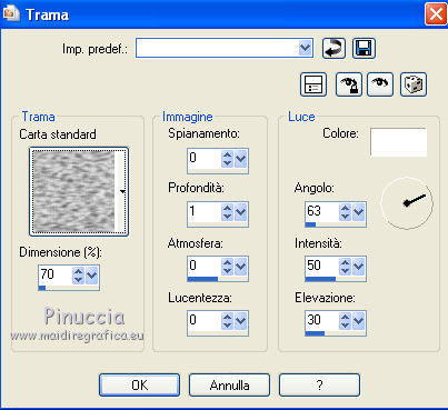 Effetti>Effetti di trama>Trama - seleziona la trama Carta standard con i seguenti settaggi.