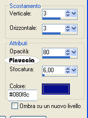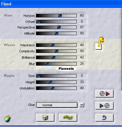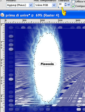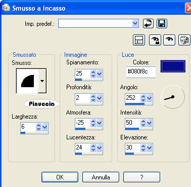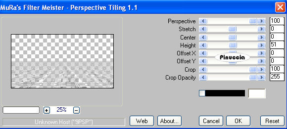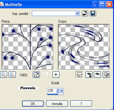 qui puoi trovare qualche risposta ai tuoi dubbi. Se l'argomento che ti interessa non è presente, ti prego di segnalarmelo. Questo tutorial è stato creato con PSP X2, ma può essere eseguito anche con le altre versioni di PSP. Per tradurlo, ho usato PSP X. Occorrente: Materiale qui I tubes sono di Mou, Mtm, Mds e Lizztish. Filtri: Mura's Meister - Perspective Tiling qui Flaming Pear - Flood qui Andromeda - Perspective qui Apri il materiale in PSP, comprese le maschere. 1. Apri una nuova immagine trasparente 950 x 500 pixels. Imposta il colore di primo piano con #080f8c, e il colore di sfondo con #ffffff. Riempi l'immagine trasparente con il colore di primo piano #080f8c.2. Livelli>Nuovo livello raster. Riempi il livello con il colore di sfondo #ffffff.3. Livelli>Nuovo livello maschera>Da immagine. Apri il menu sotto la finestra di origine e vedrai la lista dei files aperti. Seleziona la maschera "mask41" con i seguenti settaggi. ![]() Livelli>Unisci>Unisci gruppo. Effetti>Effetti 3D>Sfalsa ombra, con i seguenti settaggi, colore nero. ![]() 4. Attiva lo strumento Selezione , rettangolo,e traccia una selezione come nell'esempio: ![]() 5. Effetti>Plugins>Mura's Meister - Perspective Tiling: ![]() Selezione>Deseleziona. 6. Attiva nuovamente lo strumento Selezione , rettangolo,e traccia una selezione come nell'esempio. ![]() 7. Riempi la selezione con il colore di primo piano #080f8c.8. Effetti>Plugins>Flaming Pear - Flood, con i seguenti settaggi, colore bianco. ![]() 9. Apri il tube "majestic1_lizztish" e vai a Modifica>Copia. Torna al tuo lavoro e vai a Modifica>incolla come nuovo livello. Immagine>Ridimensiona, al 50%, tutti i livelli non selezionato. Spostalo in alto a destra.Nella paletta dei livelli cambia la modalità di miscelatura di questo livello in Schiarisci. ![]() 10. Livelli>Duplica. 11. Attiva il livello sottostante (il livello originale del tube). Effetti>Effetti di distorsione>Vento - da destra - intensità 100. ![]() Abbassa l'opacità di questo livello al 79%. 12. Attiva nuovamente il livello superiore. Apri il tube "mds11024 Untitled_4_337894" e vai a Modifica>copia. Torna al tuo lavoro e vai a Modifica>Incolla come nuovo livello. Immagine>Ridimensiona, al 120%, tutti i livelli non selezionato. 13. Effetti>Plugins>Andromeda - Perspective: Clicca due volte sulla freccia a sinistra, che diventerà gialla: ![]() 14. Sposta il tube a sinistra.15. Con lo strumento Bacchetta magica , tolleranza 10,seleziona il centro del tube come nell'esempio: ![]() 16. Apri il tube "28_silvina_vanesa_orsi". Regola>Tonalità e saturazione>Viraggio: ![]() Immagine>Ridimensiona, al 60%, tutti i livelli non selezionato. Modifica>Copia. non chiuderlo perchè ti servirà ancora Torna al tuo lavoro e vai a Modifica>Incolla nella selezione. Selezione>Deseleziona. 17. Attiva nuovamente il tube "28_silvina_vanesa_orsi". Modifica>Annulla azione Ridimensiona. non annullare il viraggio Modifica>Copia. Torna al tuo lavoro e vai a Modifica>Incolla come nuovo livello. Immagine>Ridimensiona, al 75%, tutti i livelli non selezionato. Sposta il tube a destra.![]() Effetti>Effetti 3D>Sfalsa ombra, con i seguenti settaggi, colore nero. ![]() 19. Apri il tube "mou_yingyang" e vai a Modifica>Copia. Torna al tuo lavoro e vai a Modifica>Incolla come nuovo livello. Sposta il tube al centro tra l'acqua e il "pavimento".Nella paletta dei livelli cambia la modalità di miscelatura di questo livello in Luminanza (esistente). 20. Apri il tube "Mtm_abstrac_14_Bleu Tree". Effetti>Effetti 3D>Smusso a incasso: ![]() Modifica>Copia. Torna al tuo lavoro e vai a Modifica>Incolla come nuovo livello al centro dell'immagine. Effetti>Effetti di distorsione>Mulinello: ![]() Effetti>Effetti 3D>Sfalsa ombra, con i seguenti settaggi, colore bianco. ![]() 21. Livelli>Unisci>Unisci visibile. ![]() 22. Livelli>Nuovo livello maschera>Da immagine. Seleziona la maschera "maskmask123[1]" con i seguenti settaggi. ![]() Livelli>Unisci>Unisci gruppo. Effetti>Effetti 3D>Sfalsa ombra, con i seguenti settaggi, colore #080f8c. ![]() 23. Livelli>Nuovo livello raster. Livelli>Disponi>Porta sotto. Riempi con il colore bianco.Livelli>Unisci>Unisci tutto. Immagine>Aggiungi bordatura, 5 pixels, simmetriche, con il colore #080f8c. Immagine>Aggiungi bordatura, 20 pixels, simmetriche, con il colore #ffffff. Immagine>Aggiungi bordatura, 5 pixels, simmetriche, con il colore #080f8c. 24. Apri il tube "093_silvina_vanesa_orsi" e vai a Modifica>Copia. Torna al tuo lavoro e vai a Modifica>Incolla come nuovo livello. Spostalo in basso al centro.Cambia la modalità di miscelatura di questo livello in luminanza (Esistente), e abbassa l'opacità al 71%. Livelli>Unisci>Unisci visibile. 25. Aggiungi, se vuoi, un testo e la tua firma. Salva in formato jpg. Se hai problemi o dubbi, o trovi un link non funzionante, o anche soltanto per un saluto, scrivimi. 12 Marzo 2009 |