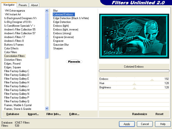 21. Effetti>Plugins>Filters Unlimited 2.0 - Convolution Filters - Colorized Emboss, con i settaggi standard.