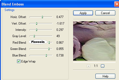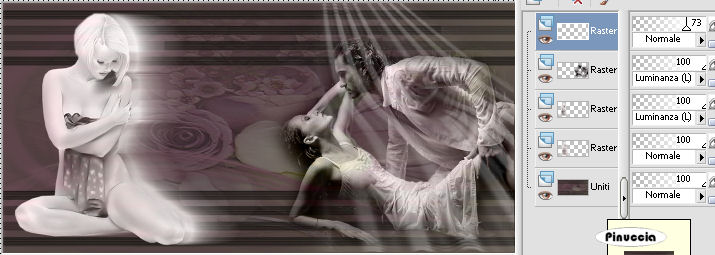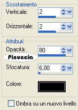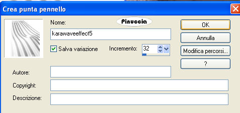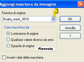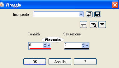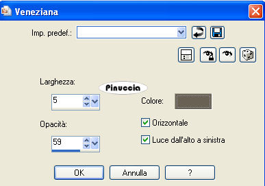 qui puoi trovare qualche risposta ai tuoi dubbi. Se l'argomento che ti interessa non è presente, ti prego di segnalarmelo. Questo tutorial è stato creato con PSP X2, ma può essere eseguito anche con le altre versioni di PSP. Per tradurlo, ho usato PSP X. Occorrente: Materiale qui Ringrazio gli autori che hanno creato il materiale usato per questo tutorial. Per i tubes grazie Guismo e Black4Roses. Per le maschere grazie Brujita e Camerontags. cal_guis_06_09_200 Filtri: FM Tile Tools - Blend Emboss qui ![]() Apri tutto il materiale in PSP, comprese le due maschere. 1. Apri una nuova immagine trasparente 1024 x 550 pixels. Selezione>Seleziona tutto. 2. Apri il tube "whiteandviolet" e vai a Modifica>Copia. Torna al tuo lavoro e vai a Modifica>Incolla nella selezione. 3. Selezione>Deseleziona. Livelli>Duplica. Livelli>Unisci>Unisci visibile. 4. Effetti>Plugins>FM Tile Tools - Blend Emboss, con i settaggi standard. ![]() Livelli>Nuovo livello raster. Imposta il colore di primo piano con #684a53. Riempi con il colore di primo piano #684a53.6. Livelli>Nuovo livello maschera>Da immagine. Apri il menu sotto la finestra di origine e vedrai la lista dei files aperti. Seleziona la maschera "Brujita_mask_0016": ![]() Livelli>Unisci>Unisci gruppo. 7. Effetti>Effetti 3D>sfalsa ombra, con i seguenti settaggi, colore nero. ![]() 8. Livelli>Nuovo livello raster. Imposta il colore di primo piano con #686155. Riempi con il colore di primo piano #686155.9. Livelli>Unisci>Unisci visibile. 10. Livelli>Nuovo livello maschera>Da immagine. Seleziona la maschera "maskcameronF14", inverti i dati della maschera selezionato. ![]() Livelli>Unisci>Unisci gruppo. 11. Effetti>Effetti 3D>Sfalsa ombra, come al punto 7. 12. Livelli>Nuovo livello raster. Imposta il colore di primo piano con #000000. Riempi con il colore nero di primo piano.Livelli>Disponi>Porta sotto. 13. Effetti>Effetti di trama>Veneziana, con i seguenti settaggi, colore #686155. ![]() Livelli>Unisci>Unisci visibile. 15. Apri il tube "cal_guis_06_09_200__douceur" e vai a Modifica>Copia. Torna al tuo lavoro e vai a Modifica>Incolla come nuovo livello. 16. Regola>Tonalità e saturazione>Viraggio: ![]() Effetti>Effetti di distorsione>Vento - da sinistra, intensità 100. ![]() Modifica>Incolla come nuovo livello (il tube cal_guis_06_09_200__douceur è ancora in memoria). Sposta il tube sopra il precedente, leggermente più a sinistra.![]() 19. Cambia la modalità di miscelatura di questo livello in Luminanza (esistente). 20. Apri l'immagine "couple1_Black4Roses" e vai a Modifica>Copia. Torna al tuo lavoro e vai a Modifica>Incolla come nuovo livello. 21. Regola>Tonalità e saturazione>Viraggio: ![]() Cambia la modalità di miscelatura di questo livello in Luminosità (esistente). 22. Apri il pennello "kara weave efect 5" . File>Esporta>pennello personalizzato, assegna un nome al pennello e clicca ok. ![]() Imposta il colore di primo piano con il bianco #ffffff. Attiva lo strumento Pennello ![]() cerca e seleziona il pennello che hai appena esportato, dimensione 500, e applicalo a destra, come nell'esempio, cliccando con il tasto sinistro del mouse per usare il colore di primo piano. Abbassa l'opacità di questo livello al 73%. ![]() 24. Aggiungi il tuo nome e/o il tuo watermark e, se vuoi, un testo. Livelli>Unisci>Unisci visibile. Per il mio esempio ho utilità il font Balmoral, dimensione 100, colore di sfondo #ddd2d1. Effetti>Effetti 3D>Sfalsa ombra, con i seguenti settaggi, colore nero. ![]() 25. Esporta come jpg con compressione a 22. ![]() 26. Per il colore di sfondo usa #5c534b. ![]() Se hai problemi o dubbi, o trovi un link non funzionante, o anche soltanto per un saluto, scrivimi.