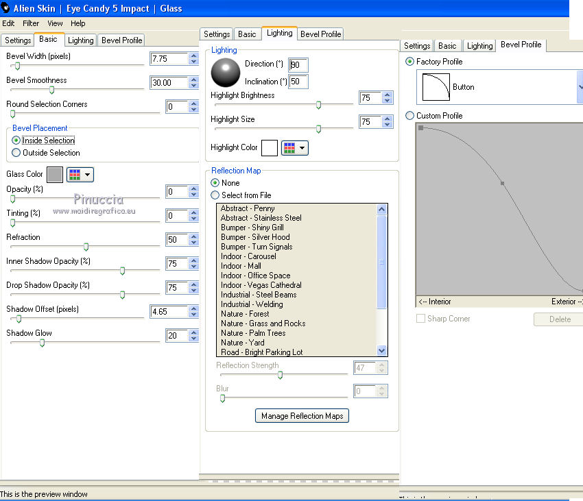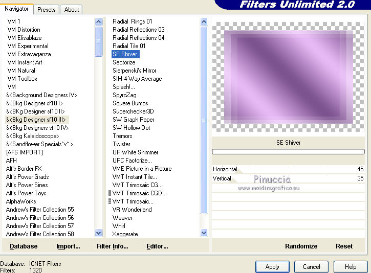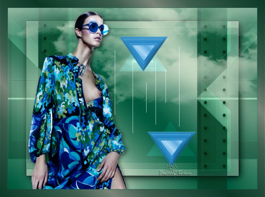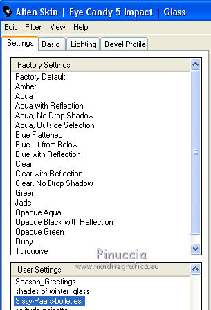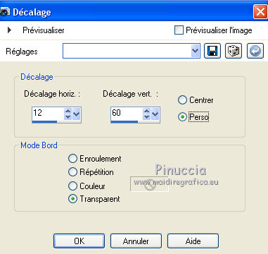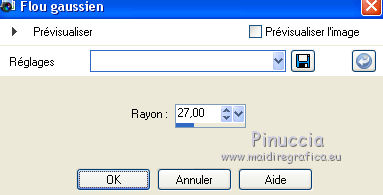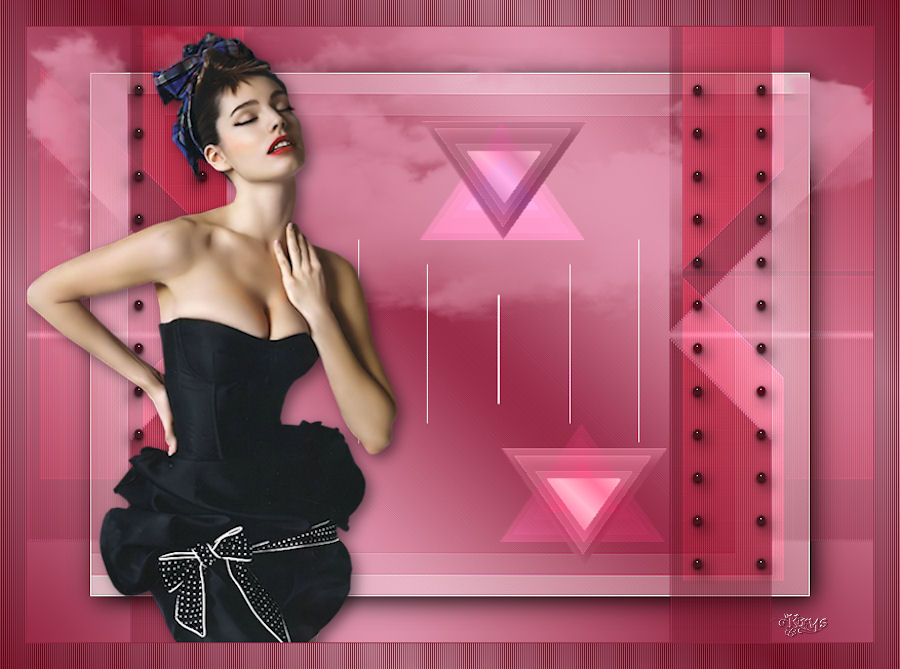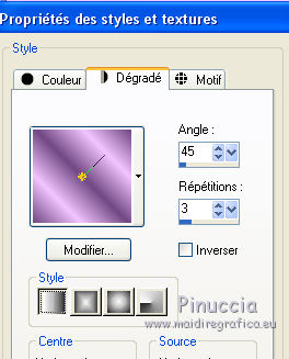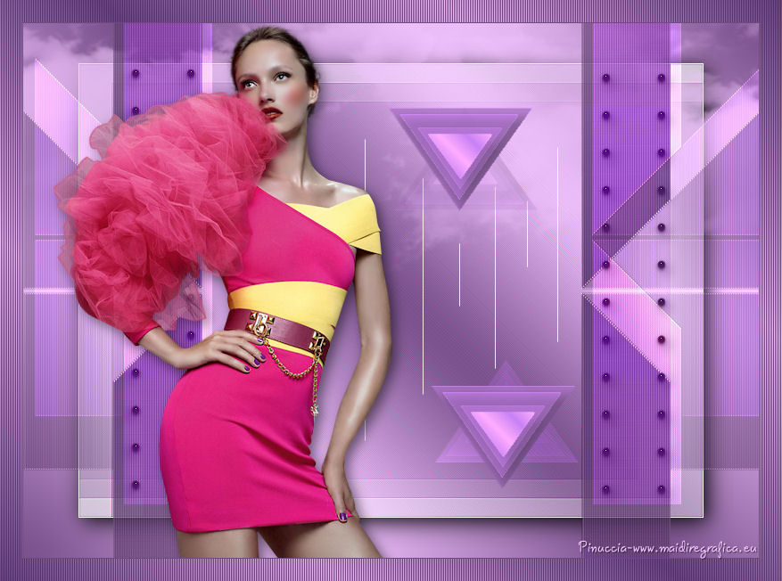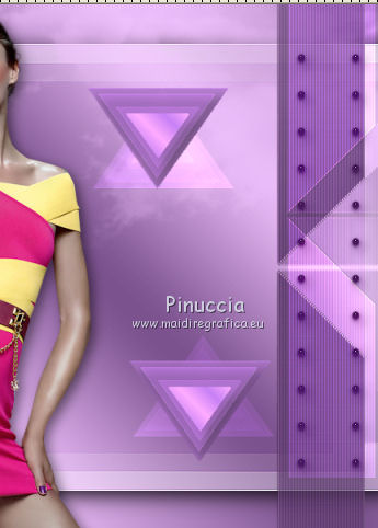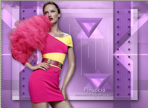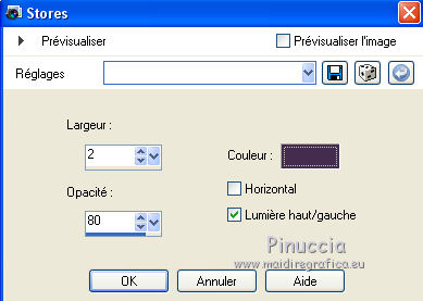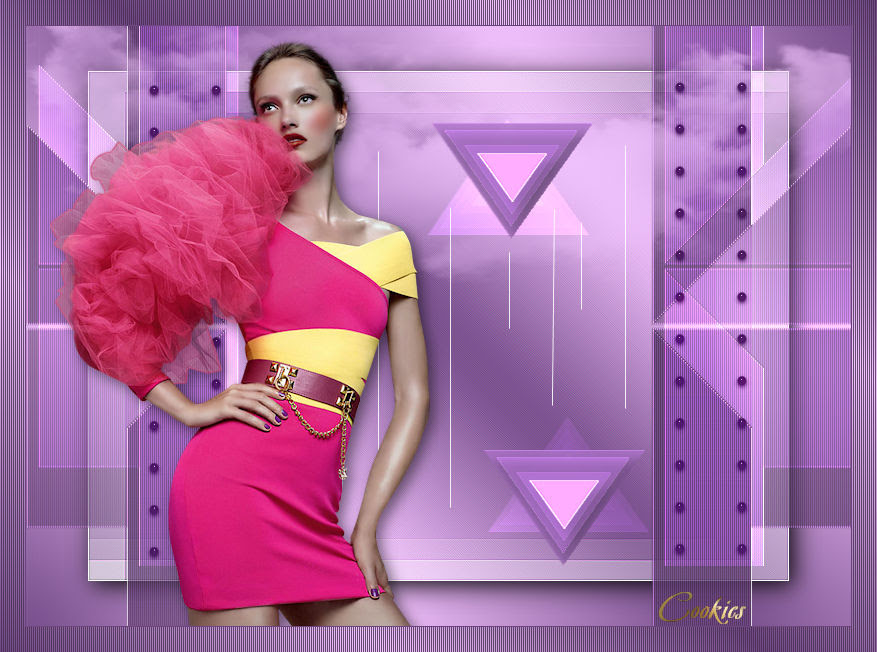 Ce tutoriel a été crée et traduit avec CorelX12, mais il peut également être exécuté avec les autres versions. Suivant la version utilisée, vous pouvez obtenir des résultats différents. Depuis la version X4, la fonction Image>Miroir a été remplacée par Image>Renverser horizontalement, et Image>Renverser avec Image>Renverser verticalement. Dans les versions X5 et X6, les fonctions ont été améliorées par la mise à disposition du menu Objets. Avec la nouvelle version X7, nous avons à nouveau Miroir/Retourner, mais avec nouvelles différences. Consulter, si vouz voulez, mes notes ici Certaines dénominations ont changées entre les versions de PSP. Les plus frequentes dénominations utilisées: ![]() Nécessaire pour réaliser ce tutoriel: Matériel qui Merci pour le tube Tocha. Garder le nom des files. Modules Externes: consulter, si nécessaire, ma section des filtres ici Filters Unlimited 2.0 ici &<Bkg Designer sf10III> - SE Shiver (da importare in Unlimited) ici Alien Skin Eye Candy 5 Impact - Glas, Perspective Shadow ici ![]() Si vous voulez utiliser vos propres couleurs, n'hésitez pas à changer le mode et l'opacité des calques Placer les presets En cliquant sur le preset une ou deux fois (selon vos réglages) automatiquement il se placera directement dans le dossier Settings de Alien Skin Eye Candy. pourquoi un ou deux clic voir ici Placer le script dans le dossier Scripts Sécurisés. Placer les sélections dans le dossier Sélections. 1. Placer en avant plan la couleur #704883, et en arrière plan la couleur #f2c4ff. ![]() Préparer un dégradé de premier plan/arrière plan, style Linéaire. ![]() 2. Ouvrir une nouvelle image transparente 825 x 600 pixels. ![]() Remplir l'image transparente avec le dégradé.3. Réglage>Flou>Flou gaussien - rayon 27. ![]() 4. Calques>Dupliquer. Image>Redimensionner, à 85%, redimensionner tous les calques décoché. Effets>Effets de bords>Accentuer. 5. Effets>Modules Externes>Filters Unlimited 2.0 - &<Bkg Designer sf10III> - SE Shiver. ![]() Effets>Effets de bords>Accentuer. 6. Effets>Modules Externes>Alien Skin Eye Candy 5 Impact - Perspective Shadow. Sélectionner le preset Sissy-perspective.les Reason et ok. En cas de problèmes avec le preset, vous pouvez copier les règlages de la capture. ![]() 7. Calques>Nouveau calque raster. Sélections>Charger/Enregistrer une sélection>Charger à partir du disque. Chercher et charger la sélection Sissy-Reason-1. ![]() 8. Placer en avant plan la couleur du début #704883. Remplir la sélection avec la couleur d'avant plan.Cliquer plusieures fois pour remplir mieux. Sélections>Désélectionner tout. 9. Effets>Effets de bords>Accentuer davantage. 10. Effets>Effets de textures>Stores - couleur #452d4f. Si vous n'etes pas satisfait de la couleur, jouer avec l'opacité. ![]() 11. Calques>Dupliquer. Placer ce calque en mode Éclaircir et réduire l'opacité à 75% (ou en fonction de vos couleurs). 12. Effets>Effets d'image>Décalage. ![]() 13. Calques>Nouveau calque raster. Sélections>Charger/Enregistrer une sélection>Charger à partir du disque. Chercher et charger la sélection Sissy-reason-kraaltjes. ![]() 14. Remplir la sélection avec la couleur d'avant plan.Sélections>Désélectionner tout. 15. Effets>Modules Externes>Alien Skin Eye Candy 5 Impact - Glass. Sélectionner le preset Sissy-Paars-bolletjes et ok. ![]() Ci-dessous les règlages en cas de problèmes avec le preset. ![]() Placer le calque en mode Luminance (héritée). 16. Effets>Effets 3D>Ombre portée, couleur noire. ![]() Réglage>Netteté>Netteté. 17. Calques>Dupliquer. Image>Miroir. Positionner bien ce calque à gauche.![]() 18. Assurez-vous d'être positionner sur le calque du haut de la pile. Calques>Nouveau calque raster. 19. Ouvrir Sissy-wolk-reason. Fichiers>Exporter>Pinceau personnalisé, donner un nom au pinceau et ok. si votre PSP ne permets pas d'utiliser pinceaux de plus de 500 pixels, avant de l'exporter, redimensionner à 500 pixels. Activer l'outil Pinceau ![]() chercher et sélectionner le pinceau exporté ![]() Appliquer le pinceau 1 ou 2 fois - à votre convenance - avec la touche droite de la souris, pour utiliser la couleur d'arrière plan #f2c4ff. 20. Réduire l'opacité de ce calque à 80%. 21. Activer le tube Tocha 23933, Édition>Copier. Revenir sur votre travail et Édition>Coller comme nouveau calque. Image>Miroir. Image>Redimensionner, à 68%, redimensionner tous les calques décoché. Déplacer le tube un peu plus à gauche.Voir mon exemple. 22. Effets>Effets 3D>Ombre portée, couleur noire. ![]() 23. Activer Sissy-Driehoekje, Édition>Copier. Revenir sur votre travail et Édition>Coller comme nouveau calque. Image>Renverser. Déplacer le tube en bas à droite.Voir mon exemple. 24. Calques>Dupliquer. Déplacer ce tube un peu plus en haut et à gauche.![]() 25. Calques>Fusionner>Fusionner le calque de dessous. Placer le calque en mode Éclaircir et réduire l'opacité à 26%. 26. Édition>Coller comme nouveau calque (le tube Sissy-Driehoekje est toujours en mémoire). Déplacer le tube sur le triangle en bas à droite.27. Calques>Dupliquer. Déplacer ce tube sur le triangle en haut à gauche.![]() 28. Vous positionner sur le calque du tube de la femme. Calques>Agencer>Placer en haut de la pile. 29. Placer en avant plan la couleur blanche. Fermer la couleur d'arrière plan. 30. Activer l'outil Stylo avec ces paramètrescouleur Plein, largeur 1,50 ![]() Tracer des lignes verticales, à votre convenance. Calques>Convertir en calque raster. Calques>Agencer>Déplacer vers le bas. ![]() 31. Signer votre travail sur un nouveau calque. 32. Calques>Fusionner>Tous. 33. Placer en avant plan la couleur (#704883) et le dégradé du début. ![]() Image>Ajouter des bordures, 1 pixel, symétrique, couleur foncée #704883. Image>Ajouter des bordures, 25 pixels, symétrique, couleur claire de votre image. Activer l'outil Baguette magique ![]() cliquer sur le bord de 25 pixels pour le sélectionner. Remplir l