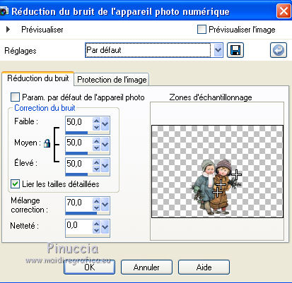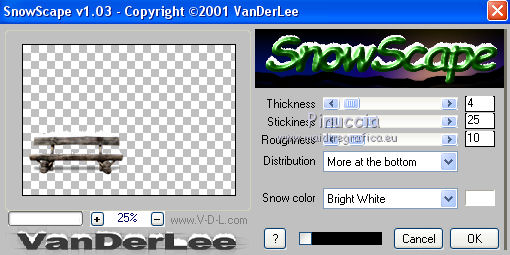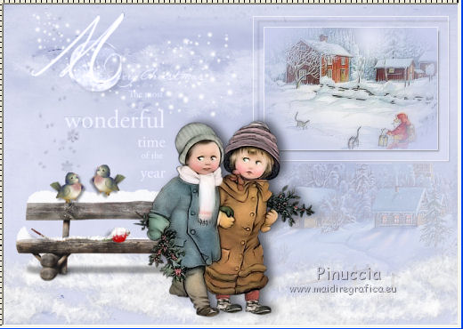 Ce tutoriel a été crée et traduit avec CorelX12, mais il peut également être exécuté avec les autres versions. Suivant la version utilisée, vous pouvez obtenir des résultats différents. Depuis la version X4, la fonction Image>Miroir a été remplacée par Image>Renverser horizontalement, et Image>Renverser avec Image>Renverser verticalement. Dans les versions X5 et X6, les fonctions ont été améliorées par la mise à disposition du menu Objets. Avec la nouvelle version X7, nous avons à nouveau Miroir/Retourner, mais avec nouvelles différences. Consulter, si vouz voulez, mes notes ici Certaines dénominations ont changées entre les versions de PSP. Les plus frequentes dénominations utilisées: ![]() Vos versions ici Nécessaire pour réaliser ce tutoriel: Matériel qui Pour le tube merci JHanna. Modules Externes: consulter, si nécessaire, ma section des filtres ici Adjust - Variations ici VDL Adrenaline - Snow Scape ici Animation Shop ici ![]() Si vous voulez utiliser vos propres couleurs, n'hésitez pas à changer le mode et l'opacité des calques Placer la sélection dans le dossier Sélections. 1. Placer en avant plan la couleur #c9cfec. 2. Ouvrir une nouvelle image transparente 850 x 600 pixels, et remplir avec la couleur d'avant plan #c9cfec.3. Ouvrir l'image de fond Sissy-2010 - Édition>Copier. Revenir sur votre travail et Édition>Coller comme nouveau calque. 4. Effets>Modules Externes>Adjust - Variations. Un clic sur Original pour annuler précédentes règlages mémorisés par le filtre, deux clic sur Darker et ok. Réduire l'opacité de ce calque à 53%. 5. Réglage>Netteté>Masque flou. ![]() 6. Ouvrir le tube Snowlaag - Édition>Copier. Revenir sur votre travail et Édition>Coller comme nouveau calque. Déplacer le tube en bas.7. Ouvrir le tube Snow-bankje - Édition>Copier. Revenir sur votre travail et Édition>Coller comme nouveau calque. Déplacer le tube en bas à gauche, voir mon exemple.Réduire l'opacité de ce calque à 89%. 8. Effets>Modules Externes>VDL Adrenaline - Snowscape. ![]() 9. Ouvrir le tube Snowtak - Édition>Copier. Revenir sur votre travail et Édition>Coller comme nouveau calque. Déplacer le tube sur la banquette.10. Ouvrir le tube Birds - Édition>Copier. Revenir sur votre travail et Édition>Coller comme nouveau calque. Déplacer l'oiseau sur la banquette.Calques>Dupliquer. Image>Miroir. Positionner bien les deux oiseaux.![]() 11. Ouvrir le texte - Édition>Copier. Revenir sur votre travail et Édition>Coller comme nouveau calque. Déplacer le texte en haut à gauche.12. Ouvrir le tube stars - Édition>Copier. Revenir sur votre travail et Édition>Coller comme nouveau calque. Déplacer les étoiles sur le texte.Réduire l'opacité de ce calque à 90%. 13. Ouvrir le tube JHanna_398 - Édition>Copier. Revenir sur votre travail et Édition>Coller comme nouveau calque. Image>Redimensionner, à 85%, redimensionner tous les calques décoché. 14. Réglage>Traitement optimal des fotos. ![]() 15. Réglage>Netteté>Masque flou. ![]() Positionner bien le tube.![]() 16. Effets>Effets 3D>Ombre portée, couleur noire. ![]() 17. Ouvrir le tube Sissy-Frame - Édition>Copier. Revenir sur votre travail et Édition>Coller comme nouveau calque. Déplacer le tube en haut à droite.Placer le calque au dessous du calque des enfants. 18. Vous positionner sur le calque du haut de la pile. Ouvrir le tube Sissy-Landscape - Édition>Copier. Revenir sur votre travail et Édition>Coller comme nouveau calque. Positionner bien le tube en bas à droite.![]() 19. Signer votre travail sur un nouveau calque. Calques>Fusionner>Tous. 20. Image>Ajouter des bordures, 1 pixel, symétrique, couleur foncée. Image>Ajouter des bordures, 25 pixels, symétrique, avec une couleur contrastante. Activer l'outil Baguette magique ![]() et cliquer sur le bord de 25 pixels pour le sélectionner. Activer à nouveau l'image de fond - Édition>Copier. Revenir sur votre travail et Édition>Coller dans la sélection. Sélections>Désélectionner tout. 21. Animation. Édition>Copier. Ouvrir Animation Shop et Édition>Coller>Coller comme nouvelle animation. Édition>Dupliquer et répéter jusqu'à obtenir 10 images. Cliquer sur la première image pour la sélectionner et Édition>Sélectionner tout. 22. Ouvrir l'animation sneeuw2006Bieke. Édition>Sélectionner tout. Édition>Copier. Activer votre travail et Édition>Coller>Coller dans l'image sélecionné. Positionner l'animation sur le paysage. Répéter jusqu'à couvrir le paysage avec la neige. Contrôler le résultat en cliquant sur Visualiser ![]() et enregistrer en gif. ![]() Si vous avez des problèmes, ou des doutes, ou vous trouvez un link modifié, ou seulement pour me dire que ce tutoriel vous a plu, vous pouvez m'écrire. 25 Novembre 2015 |
