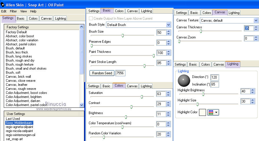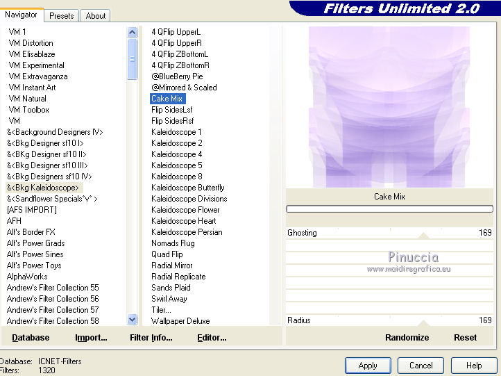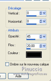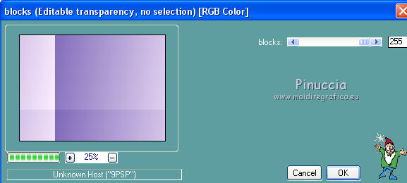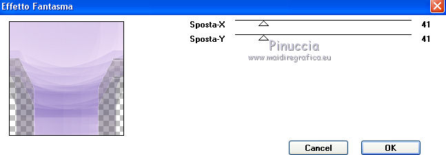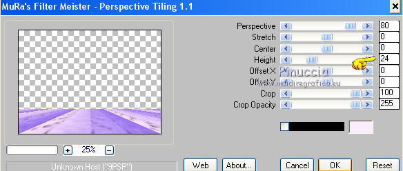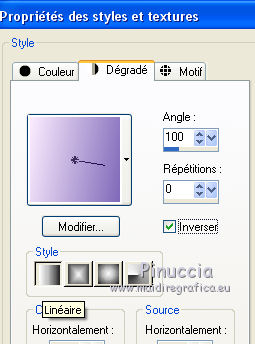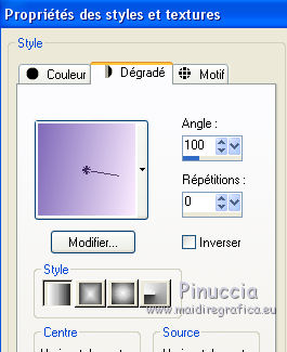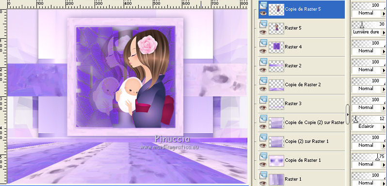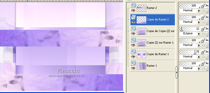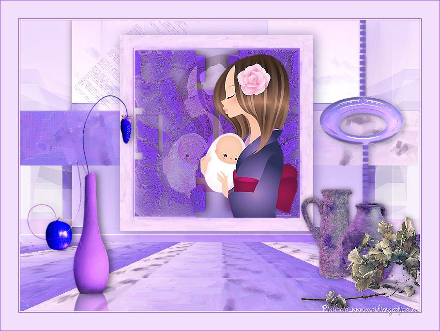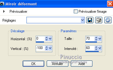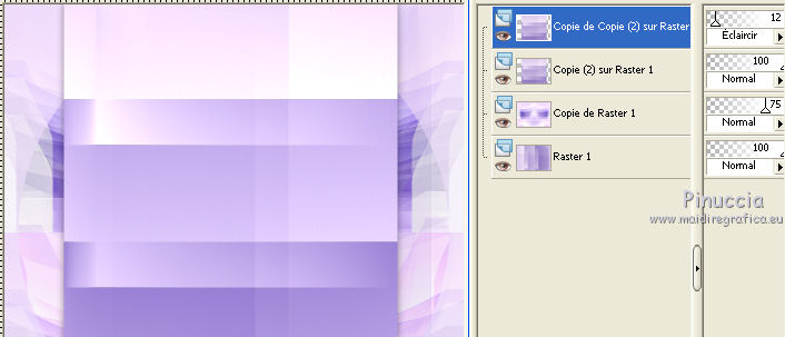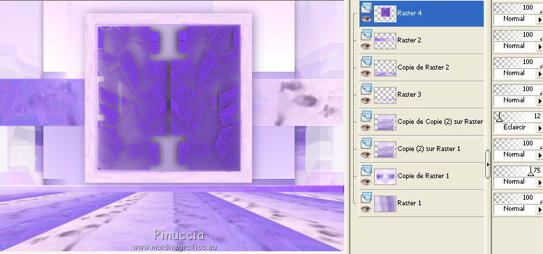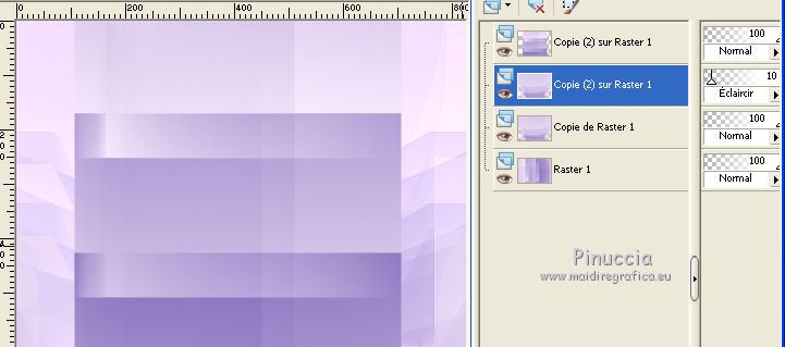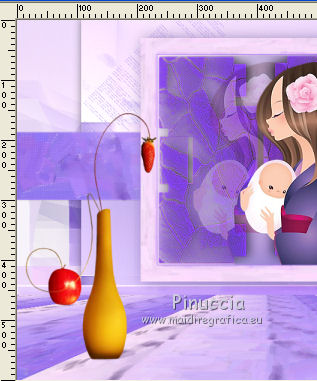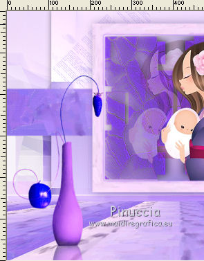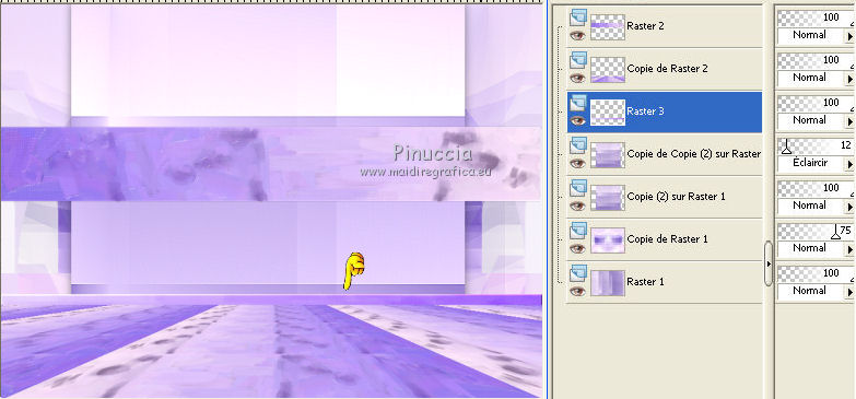 Ce tutoriel a été crée et traduit avec CorelX12, mais il peut également être exécuté avec les autres versions. Suivant la version utilisée, vous pouvez obtenir des résultats différents. Depuis la version X4, la fonction Image>Miroir a été remplacée par Image>Renverser horizontalement, et Image>Renverser avec Image>Renverser verticalement . Dans les versions X5 et X6, les fonctions ont été améliorées par la mise à disposition du menu Objets. Avec la nouvelle version X7, nous avons à nouveau Miroir/Retourner, mais avec nouvelles différences. Consulter, si vouz voulez, mes notes ici Certaines dénominations ont changées entre les versions de PSP. Les plus frequentes dénominations utilisées: ![]() Vos versions iciNécessaire pour réaliser ce tutoriel: Matériel qui Merci pour les tubes Sylvia, Anna e JHanna. Garder le nom des files. Modules Externes: consulter, si nécessaire, ma section des filtres ici Filters Unlimited 2.0 ici &<Bkg Kaleidoscope> - Cake Mix (da importare in Unlimited) ici It@lian Editors Effect - Effetto Fantasma ici PHP Shares hdj1 - Blocks ici Alien Skin Snap art - Oil Paint ici Mura's Meister - Perspective Tiling ici Filtres It@lian Editors peuvent être utilisés seuls ou importés dans Filters Unlimited. voir comment le faire ici). Si un filtre est fourni avec cette icône, ![]() Si vous voulez utilisé vos propres couleurs, n'hésitez pas à changer le mode et l'opacité des calques Placer le preset En cliquant sur le preset une ou deux fois (selon vos réglages) automatiquement il se placera directement dans le dossier Settings de Alien Skin Snap Art. pourquoi un ou deux clic voir ici Placer la sélection dans le dossier Sélections. 1. Placer en avant plan la couleur #8069b9, et en arrière plan la couleur #fbecfe. ![]() Préparer un dégradé de premier plan/arrière plan, style Linéaire. ![]() 2. Ouvrir une nouvelle image transparente 825 x 600 pixels. ![]() Remplir l'image transparente du dégradé.3. Effets>Modules Externes>PHP Shares - Blocks. ![]() 4. Effets>Effets d'image>Mosaïque sans jointures. ![]() 5. Effets>Effets de bords>Accentuer. 6. Calques>Dupliquer. Image>Rotation libre - 90 degrés à droite. ![]() 7. Déplacer ce calque vers le bas,la partie supérieure contre le bord du haut. ![]() 8. Calques>Dupliquer. Vous positionner sur le calque copie de Raster 1. ![]() 9. Effets>Effets de distorsion>Miroir déformant. ![]() 10. Effets>Modules Externes>It@lian Editors Effect - Effetto Fantasma ![]() 11. Calques>Dupliquer. Placer le calque en mode Éclaircir et réduire l'opacité à 10. ![]() 12. Calques>Fusionner>Fusionner le calque de dessous. 13. Effets>Modules Externes>Filters Unlimited 2.0 - &<Bkg Kaleidoscope> - Cake Mix, par défaut. ![]() Réduire l'opacité de ce calque à 75%. 14. Vous positionner sur le calque du haut de la pile. Effets>Effets 3D>Ombre portée, couleur noire. ![]() 15. Calques>Dupliquer. Placer le calque en mode Éclaircir et réduire l'opacité à 12. ![]() 16. Calques>Nouveau calque raster. Sélections>Charger/Enregistrer une sélection>Charger à partir du disque. Chercher et charger la sélection Sissy-midden-baan1. ![]() 17. Changer les règlages du dégradé, Inverser décoché. ![]() Remplir la sélection du dégradé.18. Activer le tube Claudia-floris - Édition>Copier. Revenir sur votre travail Édition>Coller comme nouveau calque. Positionner le tube à gauche.Calques>Dupliquer. Déplacer le tube un peu plus à droite.19. À nouveau activer le tube Claudia-floris. Image>Miroir. Édition>Copier (et fermer le tube sans enregistrer les modifications). Revenir sur votre travail Édition>Coller comme nouveau calque. Déplacer le tube à droite.![]() Calques>Fusionner>Fusionner le calque de dessous - 2 fois. Sélections>Inverser. Presser CANC sur le clavier ![]() Sélections>Désélectionner tout. Placer le calque en mode Luminance (héritée). 20. Calques>Fusionner>Fusionner le calque de dessous. 21. Effets>Modules Externes>Alien Skin Snap Art - Oil Paint. Sélectionner le preset Sissy_Middenbaan et ok. En cas de problèmes avec le preset, vous pouvez copier les règlages de la capture. ![]() Réglage>Netteté>Netteté. Déplacer la bande un peu plus en haut.22. Calques>Dupliquer. Image>Miroir. Déplacer ce calque en bas, sur le bord.![]() 23. Placer le calque copie de Raster 2 sous le calque Raster 2. ![]() 24. Effets>Modules Externes>Mura's Meister - Perspective Tiling. ![]() 25. Apri Sissy_Plint - Édition>Copier. Revenir sur votre travail Édition>Coller comme nouveau calque. Calques>Agencer>Déplacer vers le bas. Déplacer le tube comme ci-dessous.![]() 26. Vous positionner sur le calque du haut de la pile. Activer Sissy_Frame - Édition>Copier. Revenir sur votre travail Édition>Coller comme nouveau calque. Déplacer le cadre sur le "sol"![]() 27. Activer le tube SVB Minercia - Édition>Copier. Revenir sur votre travail Édition>Coller comme nouveau calque. Image>Redimensionner, à 65%, redimensionner tous les calques décoché. Réglage>Netteté>Netteté. Positionner le tube dans le cadre.28. Calques>Dupliquer. Déplacer ce tube un peu plus à droite.Placer le calque de dessous de l'original en mode Lumière dure et réduire l'opacité à 30. ![]() 29. Activer le tube Sissy-Tekst - Édition>Copier. Revenir sur votre travail Édition>Coller comme nouveau calque. Déplacer le texte en haut, contre le bord.Placer le calque au dessous du cadre. ![]() 30. Vous positionner sur le calque du haut de la pile. Activer le tube Sissy_Deco_Gevlamd - Édition>Copier. Revenir sur votre travail Édition>Coller comme nouveau calque. Déplacer le tube à droite.![]() Si nécessaire, avec l'outil Sélection ,sélectionner la partie du tube qui déborde sur le sol. Presser CANC sur le clavier. Sélections>Désélectionner tout. 31. Activer le tube Anna.br –still-life - Édition>Copier. Revenir sur votre travail Édition>Coller comme nouveau calque. Image>Redimensionner, à 80%, redimensionner tous les calques