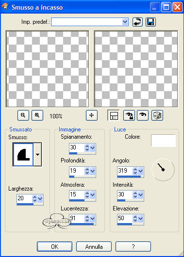 Effetti>Effetti 3D>Smusso a incasso con i seguenti settaggi:
