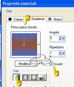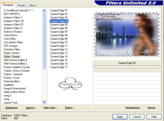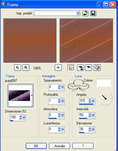 qui puoi trovare qualche risposta ai tuoi dubbi. Se l'argomento che ti interessa non è presente, ti prego di segnalarmelo. Occorrente: Materiale qui Filtri: Filters Unlimited 2.0 qui Simple qui Il tube utilizzato per questo tutorial è di Ninaisu. Apri tutto il materiale in PSP. Metti la trama purpl097 nella cartella delle Trame. Metti il font nella tua cartella font. Imposta come colore di primo piano #98522e e come colore di sfondo #506ac4. Passa il colore di sfondo a gradiente, stile lineare, con i seguenti settaggi: ![]() Apri una nuova immagine trasparente 800 x 550 pixels. Selezione>Seleziona tutto. Apri il file di sfondo "BackgroundBeyonce" e vai a Modifica>Copia. Torna al tuo lavoro e vai a Modifica>Incolla>Incolla nella selezione. Selezione>Nessuna selezione. Apri Misted_Venice e vai a Modifica>Copia. Torna al tuo lavoro e vai a Modifica>Incolla>Incolla come nuovo livello. Spostalo sul lato sinistro facendolo uscire un poco dal bordo.Apri il file Ribbon_beigetransparent_gh e vai a Modifica>Copia. Torna al tuo lavoro e vai a Modifica>Incolla>Incolla come nuovo livello. Spostalo contro il bordo superiore del misted_venice.Livelli>Duplica. Immagine>Capovolgi. Apri il tube Ninaisu_Beyonce e vai a Modifica>copia. Torna al tuo lavoro e vai a Modifica>Incolla>Incolla come nuovo livello. Spostalo a destra.Livelli>Duplica. Livelli>Disponi>Sposta giù. Effetti>Effetti di distorsione>Vento, 100 da sinistra: ![]() Chiudi il livello superiore. Posizionati su uno degli altri livelli. Livelli>Unisci>Unisci visibile. Lascia chiuso il livello superiore e rimani posizionato sul livello inferiore (uniti). Apri il tube BeyoncePearls e vai a Modifica>copia. Torna al tuo lavoro e vai a Modifica>Incolla>Incolla come nuovo livello. Spostalo sulla striscia inferiore.(vedi l'esempio della tag finale). Apri il file di Testo Cherokee-WordArt9 e vai a Modifica>Copia. Torna al tuo lavoro e vai a Modifica>Incolla>Incolla come nuovo livello. Spostalo sulla striscia superiore.Effetti>Effetti 3D>Sfalsa ombra, con i seguenti settaggi, colore nero: ![]() Lascia sempre chiuso il livello superiore e posizionati su uno degli altri livelli. Livelli>Unisci>Unisci visibile. Effetti>Plugins>Filters Unlimited 2.0 / Edges Square / Square Edge04. ![]() Immagine>Ridimensiona, del 95%, tutti i livelli non selezionato. ![]() Effetti>Effetti 3D>Sfalsa ombra, con i seguenti settaggi, colore nero: ![]() Livelli>nuovo livello raster. Livelli>Disponi>Sposta giù. Riempi questo livello con il gradiente (ricorda che è impostato come colore di sfondo, quindi clicca con il tasto destro).Effetti>Effetti di trama>Trama. Cerca la trama purpl079. ![]() Apri il livello superiore. Adesso hai tre livelli. Attiva il livello centrale. ![]() Apri il tube Blue_rivet e vai a Modifica>copia. Torna al tuo lavoro e vai a Modifica>Incolla>Incolla come nuovo livello. Spostalo nella striscia in alto a sinistra.Effetti>Plugins>Simple / Top left mirror e clicca ok. Seleziona con la bacchetta magica l'interno della rondella.Selezione>Modifica>Sfuma di 1 pixel. Posizionati sul livello Uniti e premi sulla tastiera il tasto CANC. Selezione>Nessuna selezione. Posizionati sul livello Raster 2. Apri il tube Ketting e vai a Modifica>Copia. Torna al tuo lavoro e vai a Modifica>Incolla>Incolla come nuovo livello. Spostalo in alto a sinistra.Effetti>Effetti 3D>Sfalsa ombra, con i seguenti settaggi, colore nero: ![]() Livelli>Duplica. Immagine>Capovolgi. Livelli>Duplica. Immagine>Rifletti. Livelli>Duplica. Immagine>Capovolgi. Livelli>Unisci>Unisci tutto. Attiva lo strumento Testo , font LTFlamingo, dimensione 72,scrivi il tuo nome e posizionalo sulla striscia inferiore. Aggiungi il tuo watermark ed eventualmente ridimensiona. Immagine>Aggiungi bordatura, 2 pixels, simmetriche, con il colore marrone. ![]() Se hai problemi o dubbi, o trovi un link non funzionante, o anche soltanto per un saluto, scrivimi. Settembre 2006 |