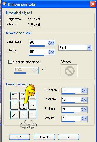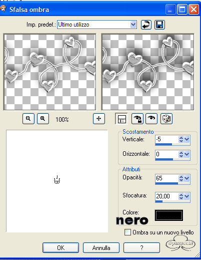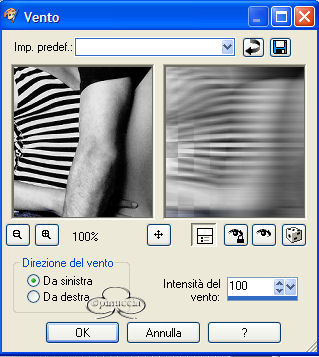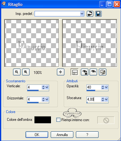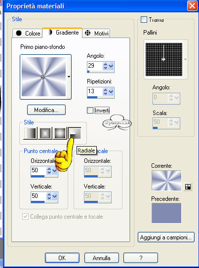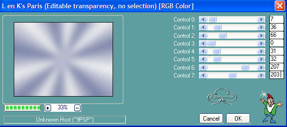 qui puoi trovare qualche risposta ai tuoi dubbi. Se l'argomento che ti interessa non è presente, ti prego di segnalarmelo. Occorrente: Un bel tube. Filtro L&K landsiteofwonders - L&K Paris nella pagina che si apre, il filtro è in fondo ![]() Materiale: qui Metti il pennello nella cartella Pennelli di PSP. Metti il pattern nella tua cartella pattern. Apri i tubes in PSP. Apri una nuova immagine trasparente 600 x 450 pixels. Scegli un colore dal tube per il colore di primo piano e il colore bianco come colore di sfondo. Se hai scelto un tube bianconero, imposta come colore di primo piano una tinta grigia. Con i colori scelti, crea un gradiente di primo piano/sfondo, stile radiale, con i seguenti settaggi: ![]() Riempi la tela con il gradiente.Regola>Sfocatura>Sfocatura gaussiana, raggio 20. Effetti>Plugins>L&K - L%K Paris, con i seguenti settaggi: ![]() Effetti>Effetti di bordo>Aumenta. Apri il file "band_herz" e vai a Modifica>Copia. Torna al tuo lavoro e vai a Modifica>Incolla>Incolla come nuovo livello. Mettilo in alto. Effetti>Effetti 3D>Sfalsa ombra, con i seguenti settaggi: ![]() Apri il tube "rw_lovers" e vai a Modifica>Copia. Torna al tuo lavoro e vai a Modifica>Incolla>Incolla come nuovo livello. Spostali un poco a sinistra. Effetti>Effetti di distorsione, vento, ![]() Nella paletta dei livelli abbassa l'opacità al 60%. Di nuovo Modifica>Incolla>Incolla come nuovo livello (il tube è ancora in memoria). Sposta la coppia a sinistra. Effetti>Effetti 3D>Sfalsa ombra, con i settaggi usati in precedenza. Apri il tube "armband" e vai a Modifica>Copia. Torna al tuo lavoro e vai a Modifica>Incolla>Incolla come nuovo livello. Spostalo in basso. Effetti>Effetti 3D>Sfalsa ombra, con i settaggi precedenti. Attiva lo strumento Pennello ![]() e cerca il pennello "agi_love_U2". Imposta il colore di primo piano su una tinta blu scura presa dal jeans del tube e applica il pennello. Cerca adesso il pennello "abstract11- kris 001" e applicalo sul lato destro sopra il braccialetto. Livelli>Unisci>Unisci tutto. Immagine>Aggiungi bordatura, 2 pixels, simmetriche, colore blu. Immagine>Aggiungi bordatura, 2 pixels, simmetriche, colore bianco. Seleziona il bordo con la bacchetta magica ![]() Riempi il bordo con il pattern Silver (nello zip).Immagine>Aggiungi bordatura, 2 pixels, simmetriche, colore blu. Immagine>Ridimensiona, 90%, tutti i livelli selezionato. ![]() Nella paletta dei livelli Innalza livello di sfondo. Immagine>Dimensione tela 600x450. ![]() Clicca sul quadratino al centro per distribuire uniformemente lo spazio. Seleziona il bordo con la bacchetta magica ![]() Imposta il colore di sfondo di nuovo con lo stesso gradiente, ma questa volta con il blu. Riempi il bordo intorno alla tela con il gradiente.Regola>Sfocatura>Sfocatura gaussiana, raggio 20. Effetti>Plugins>L&K landsiteofwonders - L&K Paris , con i settaggi precedenti. Effetti>Effetti di bordo>Aumenta. Selezione>Nessuna selezione. Immagine>Aggiungi bordatura, 2 pixels, simmetrici, colore blu. Immagine>Aggiungi bordatura, 2 pixels, simmetrici, bianco. Seleziona il bordo con la bacchetta magica ![]() Riempi il bordo con il pattern Silver (nello zip).Immagine>Aggiungi bordatura, 2 pixels, simmetriche, colore blu. Se vuoi ridimensionare l'immagine: Immagine>Ridimensiona a 600 pixels di larghezza Imposta il colore di sfondo con il pattern argento (zilverpatroon, compreso nello zip). Aggiungi il tuo nome sulla piastra del braccialetto. Attiva lo strumento Testo ![]() Io ho scelto il font A Charming Extended, dimensione 36. ![]() Effetti>Effetti 3D>Ritaglio: ![]() La tag è finita. Se vuoi, aggiungi il watermark, e salva nel formato che preferisci. ![]() Se hai problemi o dubbi, o trovi un link non funzionante, o anche soltanto per un saluto, scrivimi. Maggio 2006 |