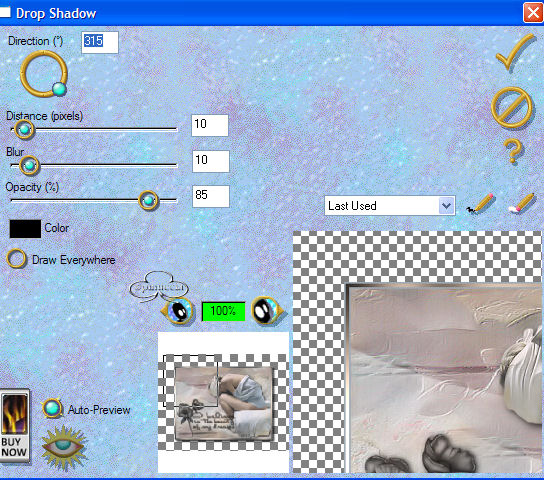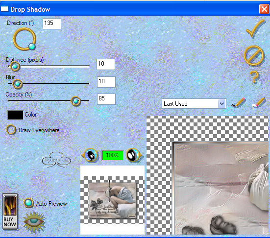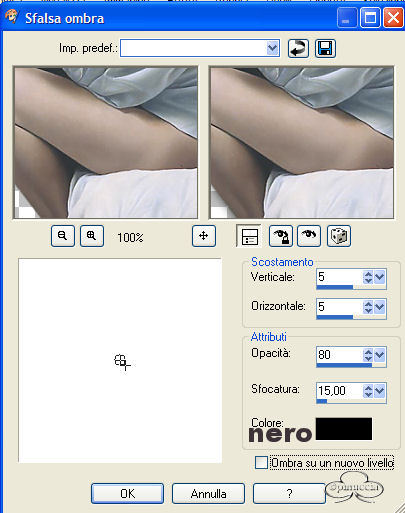 qui puoi trovare qualche risposta ai tuoi dubbi. Se l'argomento che ti interessa non è presente, ti prego di segnalarmelo. Il tube e lo sfondo usati per questo tutorial sono di Brigitte. L'autrice del tutorial originale (e chi lo sta traducendo) ringraziano Brigitte per il suo permesso ad usare il suo materiale per questa lezione. Occorrente: Filter Greg factory output vol2 qui Filter Eye Candy 3.1 qui Materiale qui Apri il tube, lo sfondo e l'angolo in PSP. Metti il pennello nella cartella Pennelli di PSP. Se non riesci ad aprire il pennello in PSP, clicca su File>Esporta>come pennello personalizzato, dagli un nome e clicca ok. Apri una nuova immagine trasparente 600x450. Selezione>Seleziona tutto. Apri il file di sfondo e vai a Modifica>Copia. Torna al tuo lavoro e vai a Modifica>Incolla>Incolla nella selezione. Selezione>Nessuna selezione. Apri il tube e vai a Modifica>Copia. Torna al tuo lavoro e vai a Modifica>Incolla>Incolla come nuovo livello. Sposta l'immagine a destra.Effetti>Effetti 3D>Sfalsa ombra, con i seguenti settaggi, colore nero: ![]() Imposta il colore di primo piano su NERO. Attiva lo strumento pennello ![]() e cerca il pennello SSB-beautyofdreams. Applica il pennello in basso a sinistra. Livelli>Unisci>Unisci tutto. Immagine>Aggiungi bordatura, 2 pixels, simmetriche, con il colore #9daab3 (blu chiaro). Immagine>Aggiungi bordatura, 5 pixels, simmetriche, con il colore #cab6a5 (beige). Seleziona quest'ultimo bordo con la bacchetta magica ![]() Effetti>Plugins>Greg factory output vol 2 - Poolshadow, con i seguenti settaggi: ![]() Selezione>Nessuna selezione. Immagine>Aggiungi bordatura, 2 pixels, simmetriche, colore #9daab3. Immagine>Ridimensiona, 450 pixels di larghezza. Regola>Correzione fotografica>Rimozione disturbo fotocamera digitale. Apri una nuova immagine trasparente 600 x 450. Selezione>Seleziona tutto. Apri il file dello sfondo e vai a Modifica>Copia. Torna alla nuova immagine e vai a Modifica>Incolla>Incolla nella selezione. Selezione>Nessuna selezione. Riprendi la prima immagine e vai a Modifica>Copia. Ritorna alla nuova immagine (600x450) e vai a Modifica>Incolla>Incolla come nuovo livello. Effetti>Plugins>Eye Candy 3.1 - Dropshadow, con i seguenti settaggi. ![]() Ripeti, ma cambiando la direzione a 135. ![]() Attiva il livello dello sfondo, dovrebbe essere raster 1. ![]() Attiva lo strumento Pennello e cerca