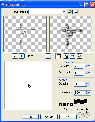 il pennello SSB-leaf.Applicalo sull'angolo in alto a sinistra e in basso a destra (il colore di primo piano è sempre nero). Ritorna sul livello superiore. Apri il file dell'angolo (karin_hoek9) e vai a Modifica>Copia. Ritorna al tuo lavoro e vai a Modifica>Incolla>Incolla come nuovo livello. Mettilo nell'angolo superiore sinistro. Effetti>Effetti 3D>Sfalsa ombra, con i seguenti settaggi, colore nero: ![]() Livelli>Duplica. Immagine>Capovolgi. Immagine>Rifletti. Livelli>Unisci>Unisci tutto. Immagine>Aggiungi bordatura, 2 pixels, simmetriche, con il colore #9daab3. Immagine>Aggiungi bordatura, 5 pixels, simmetriche, con il colore #cab6a5. Immagine>Aggiungi bordatura, 2 pixels, simmetriche, con il colore #9daab3. Seleziona il bordo centrale con la bacchetta magica ![]() Effetti>Plugins>Greg Factory Output Vol2 - Poolshadow, con i settaggi precedenti. Selezione>Nessuna selezione. Aggiungi il tuo watermark e, se vuoi, ridimensiona l'immagine. Il font che ho usato io è FiresideChatNF ![]() Se hai problemi o dubbi, o trovi un link non funzionante, o anche soltanto per un saluto, scrivimi. Maggio 2006 |