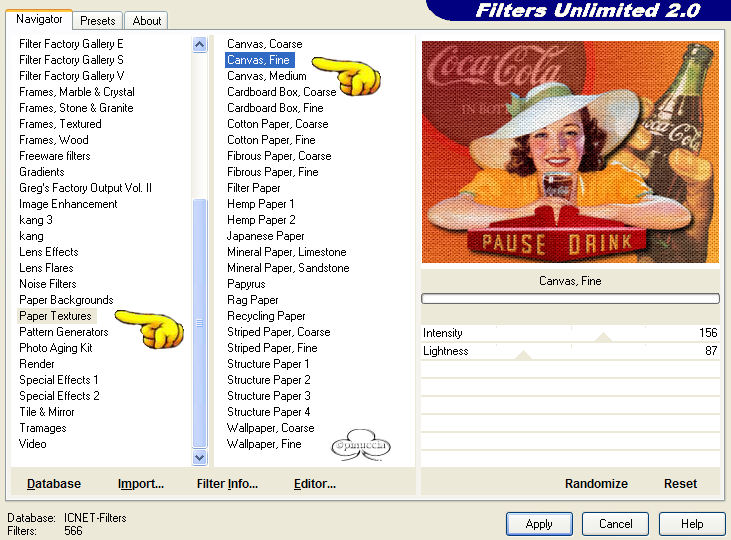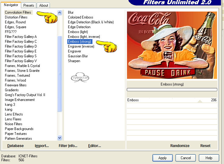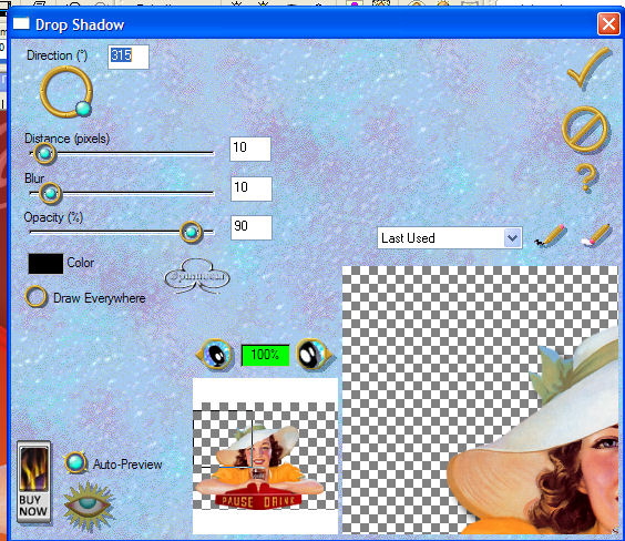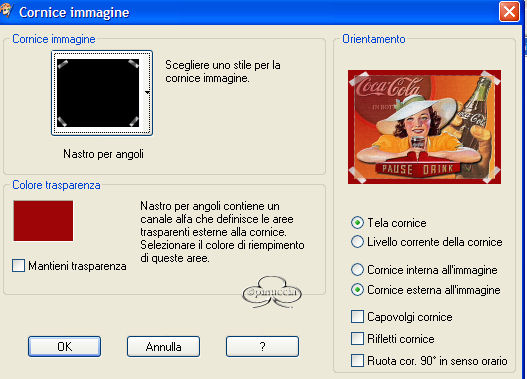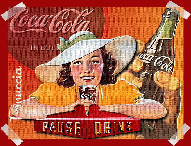 qui puoi trovare qualche risposta ai tuoi dubbi. Se l'argomento che ti interessa non è presente, ti prego di segnalarmelo. Occorrente: Materiale: qui Filtro Eye Candy 3.1. Filtro Unlimited. Apri i tubes in PSP. Apri una nuova immagine trasparente 600 x 450. Scegli due colori dal tube per il primo piano e per lo sfondo e crea un gradiente con questi settaggi: ![]() Riempi la tela con il gradiente. Apri il tube BT_coca e vai a Modifica>Copia. Torna al tuo lavoro e vai a Modifica>Incolla>Incolla come nuovo livello. Spostalo in alto a sinistra in modo che le lettere siano vicino al bordo. ![]() Nella paletta dei livelli abbassa l'opacità al 41%. Apri il tube Cokedaily e vai Modifica>Copia. Torna al tuo lavoro e vai a Modifica>Incolla>Incolla come nuovo livello. Spostalo sul lato destro. Nella paletta dei livelli abbassa l'opacità all'85%. Apri il tube Cokegirl e vai a Modifica>Copia. Torna al tuo lavoro e vai a Modifica>Incolla>Incolla come nuovo livello. Spostalo un po' in basso. Effetti>Plugins>Eye Candy3 - DropShadow, con i seguenti settaggi: ![]() Livelli>Unisci>Unisci visibile. Effetti>Plugins>Filtro Unlimited - Convolution Filter - Emboss (strong) ![]() clicca Applica. Effetti>Plugins>Filtro - Unlimited - Paper textures - canvas fine. ![]() Clicca Applica. Immagine>Cornice immagine>Nastro per angoli: ![]() Imposta Colore trasparenza con un bel colore preso dal tube. Livelli>Unisci>Unisci tutto. Attiva lo strumento Testo , scegli un bel fonte scrivi il tuo nome. Puoi dargli lo stesso effetto Canvas fine di Unlimited, che hai applicato alla tela. Riduci l'immagine, se vuoi, applica il tuo watermark e salva nel formato che preferisci. ![]() Se hai problemi o dubbi, o trovi un link non funzionante, o anche soltanto per un saluto, scrivimi. Maggio 2006 |