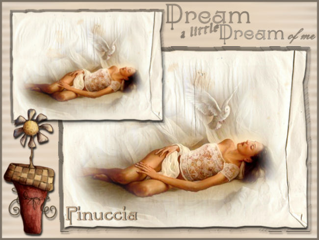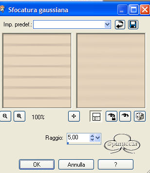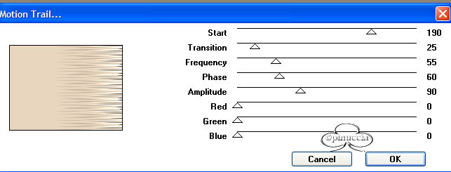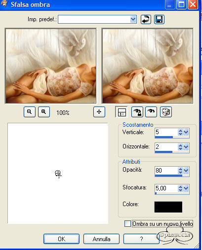 qui puoi trovare qualche risposta ai tuoi dubbi. Se l'argomento che ti interessa non è presente, ti prego di segnalarmelo. Materiale qui Filtro: Filter Factory Gallery M qui Apri i tubes in PSP. Apri una nuova immagine trasparente 800 x 600 pixels. Potrai ridurla più tardi. Riempi l'immagine con il colore #e9d6bf.Effetti>Plugins>Filter Factory M / Motion Trai: ![]() Livelli>Duplica. Immagine>Rifletti. Nella paletta dei livelli abbassa l'opacità al 50%. Livelli>Unisci>Unisci tutto. Regola>Sfocatura>Sfocatura gaussiana, raggio 5. ![]() Livelli>Nuovo livello raster. Attiva lo strumento Selezione , rettangoloe traccia una selezione di circa 600 x 450 pixels. Apri il file di sfondo Papersmall e vai a Modifica>Copia. Torna al tuo lavoro e vai a Modifica>Incolla>Incolla nella selezione. Selezione>Nessuna selezione. Effetti>Effetti 3D>Cesello: ![]() Sposta il rettangolo nell'angolo in basso a destra, lasciando ai lati più o meno la stessa distanza dal bordo.Apri il tube della donna e vai a Modifica>Copia. Torna al tuo lavoro e vai a Modifica>Incolla>Incolla come nuovo livello. Posizionala all'interno della cornice:vedi come esempio l'immagine finale. Chiudi il livello di sfondo e posizionati su uno degli altri due livelli. Livelli>Unisci>Unisci visibile. Riapri il livello di sfondo e posizionati sul livello superiore. Livelli>Duplica. Immagine>Ridimensiona, 85%, tipo di ricampionamento bicubica, tutti i livelli non selezionato. ![]() Sposta questo rettangolo in alto a sinistra.Effetti>Effetti 3D>Sfalsa ombra, con i seguenti settaggi: Livelli>Unisci>Unisci tutto. Apri il file del vaso (Bloempot) e vai a Modifica>Copia. Torna al tuo lavoro e vai a Modifica>Incolla>Incolla come nuovo livello. Spostalo nell'angolo in basso a sinistra.Effetti>Effetti 3D>Sfalsa ombra, con i settaggi precedenti. Apri il file di testo e vai a Modifica>Copia. Torna al tuo lavoro e vai a Modifica>Incolla>Incolla come nuovo livello. Spostalo in alto a destra.Livelli>Unisci>Unisci tutto. Aggiungi il tuo watermark all'immagine. Io ho scelto il font Yolanda Duchess. Immagine>Aggiungi bordatura, 5 pixels, simmetriche, con il colore #7c7265. Ridimensiona (Immagine>Ridimensiona) la tag e salva in formato jpg. ![]() Se hai problemi o dubbi, o trovi un link non funzionante, o anche soltanto per un saluto, scrivimi. Luglio 2006 |