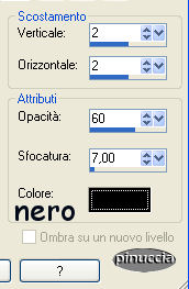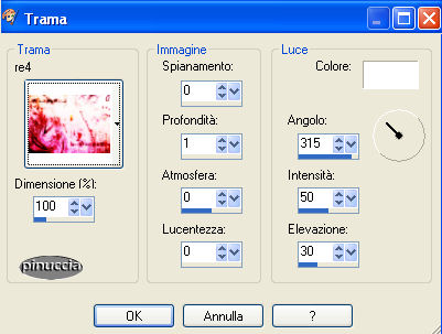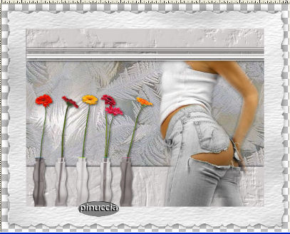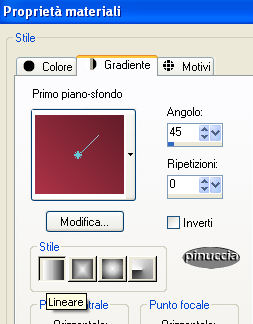 qui puoi trovare qualche risposta ai tuoi dubbi. Se l'argomento che ti interessa non è presente, ti prego di segnalarmelo. Materiale qui Metti il file Achtergrond (re4) nella cartella Trame. Metti il font nella tua cartella Font. Metti la Selezione Snakeselecdtie3 nella cartella Selezioni di PSP. Apri i tubes in PSP. Apri una nuova immagine trasparente 600 x 450 pixels. Selezione>Seleziona tutto. Apri il file "bg 2Dd" e vai a Modifica>copia. Torna al tuo lavoro e vai a Modifica>Incolla>Incolla nella selezione. Selezione>Nessuna selezione. Scegli un colore da questo sfondo. Livelli>Nuovo livello raster. Selezione>Carica/Salva selezione>Carica selezione da disco. Cerca snakeselectie3 e clicca ok. ![]() Riempi la selezione con il colore scelto.(io ho usato #d2cece) Effetti>Effetti di trama>Trama, cerca e seleziona la trama re4, con questi settaggi: ![]() Effetti>Effetti 3D>Sfalsa ombra, con i seguenti settaggi, colore nero: ![]() Ripeti l'Effetto Sfalsa ombra, ma cambiando verticale e orizzontale a -2. Selezione>Nessuna selezione. Apri il tube NewjeansMBW e vai a Modifica>copia. Torna al tuo lavoro e vai a Modifica>Incolla>Incolla come nuovo livello. in alto a destra contro il bordo. ![]() Apri il tube wezzie2006flowervases e vai a Modifica>copia. Torna al tuo lavoro e vai a Modifica>Incolla>Incolla come nuovo livello. Spostalo in basso a sinistra.Effetti>Effetti 3D>Sfalsa ombra, con i seguenti settaggi, colore nero. ![]() Apri il file Snakerand e vai a Modifica>Copia. Torna al tuo lavoro e vai a Modifica>Incolla>Incolla come nuovo livello. Spostalo in alto, come mostrato nell'esempio.![]() Livelli>Unisci>Unisci tutto. Modifica>Copia. Apri il file Foto-achtergrond e vai a Modifica>Incolla>Incolla come nuovo livello. Avrai questo: ![]() Apri Smg_beadedribbon e vai a Modifica>Copia. Torna al tuo lavoro e vai a Modifica>Incolla>Incolla come nuovo livello. Spostalo in alto.Apri il file "Rivet" e vai a Modifica>copia. Torna al tuo lavoro e vai a Modifica>Incolla>Incolla come nuovo livello. Spostalo in alto sul lato sinistro del bordo.Livelli>duplica. Immagine>Rifletti. Imposta il colore di primo piano con un colore rosso preso dall'immagine e il colore di sfondo su una tinta più scura. Crea un gradiente lineare, con i seguenti settaggi: ![]() Attiva lo strumento Testo ![]() Cerca il font Larissa, dimension 48, scrivi e posiziona il tuo nome. Effetti>Effetti 3D>Sfalsa ombra, con i seguenti settaggi, colore nero. ![]() Livelli>Unisci>Unisci tutto. Aggiungi il tuo watermark e, se vuoi, ridimensiona l'immagine. ![]() Se hai problemi o dubbi, o trovi un link non funzionante, o anche soltanto per un saluto, scrivimi. Settembre 2006 |