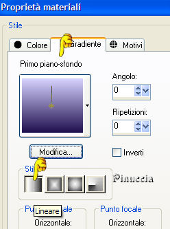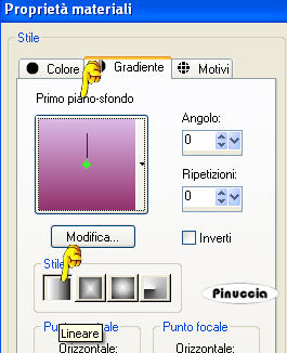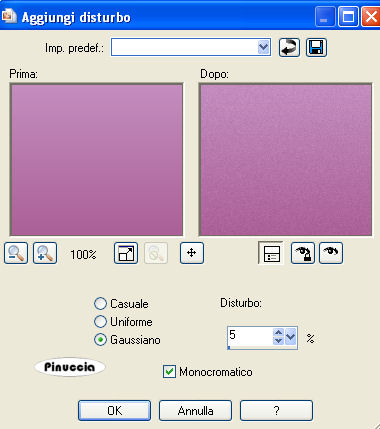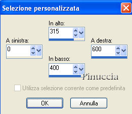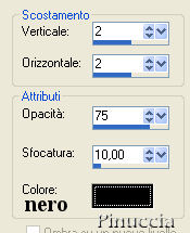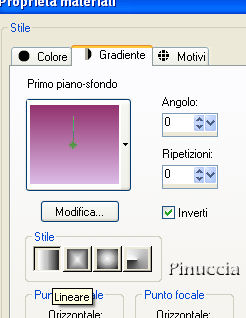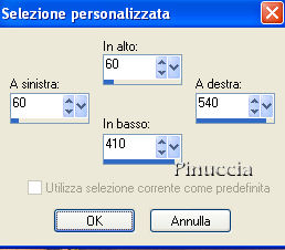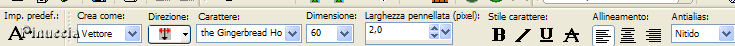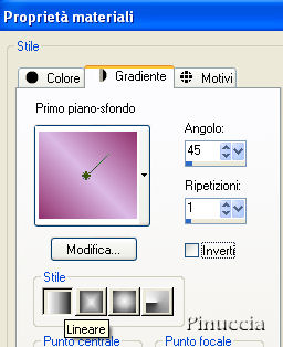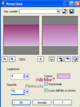 qui puoi trovare qualche risposta ai tuoi dubbi. Se l'argomento che ti interessa non è presente, ti prego di segnalarmelo. Occorrente: Un file di sfondo. Un tube. Materiale qui Apri una nuova immagine trasparente 600 x 450 pixels. Scegli un colore scuro e un colore chiaro dal tube. Io ho scelto #92326e e #dcbbe7. Crea un gradiente di primo piano/sfondo, stile lineare, con i seguenti settaggi: ![]() e riempi l'immagine con questo gradiente.Regola>Aggiungi/Rimuovi disturbo>Aggiungi disturbo, gaussiano, 5, monocromatico selezionato. ![]() Apri il file di sfondo e vai a Modifica>Copia. Torna al tuo lavoro e vai a Modifica>Incolla>Incolla come nuovo livello. Nella paletta dei livelli abbassa l'opacità di questo livello al 60%. Apri l'altro tube e vai a Modifica>copia. Torna al tuo lavoro e vai a Modifica>Incolla>Incolla come nuovo livello. Sposta il tube a sinistra.Effetti>Effetti 3D>Sfalsa ombra, con i seguenti settaggi, colore nero: ![]() Attiva lo strumento Selezione , selezione personalizzata con i seguenti settaggi:![]() Livelli>Nuovo livello raster. Cambia i settaggi del gradiente: ![]() e riempi la selezione con questo gradiente.Effetti>Effetti di trama>Veneziana, con il colore chiaro #dcbbe7. ![]() Abbassa l'opacità di questo livello al 40%. Livelli>Disponi>Sposta giù. Effetti>Effetti 3D>Sfalsa ombra, con i seguenti settaggi, colore nero: ![]() Selezione>Nessuna selezione. Livelli>Nuovo livello raster. Attiva lo strumento Selezione , selezione personalizzata con i seguenti settaggi:![]() Effetti>Effetti 3D>Sfalsa ombra, con i settaggi precedenti. Imposta il colore di primo piano con un Motivo argento e riempi la selezione con questo Motivo.Selezione>Modifica>Contrai di 2 pixels. Premi sulla tastiera il tasto CANC. Selezione>Modifica>Espandi, di 2 pixels. Selezione>Inverti. Scegli altri due colori dal tube. Io ho scelto #1f0f4f e #d7d3ff. Crea un gradiente di primo piano/sfondo, stile lineare, con i seguenti settaggi: ![]() fai attenzione: il colore scuro deve trovarsi sotto. Riempi la selezione con questo gradiente.Regola>Aggiungi/Rimuovi disturbo>Aggiungi disturbo, gaussiana, 5. Abbassa l'opacità di questo livello al 70%. Livelli>Disponi>Sposta giù. Ripeti Livelli>Disponi>Sposta giù. Selezione>Nessuna selezione. Apri una nuova immagine trasparente 75 x 75 pixels. Con i colori scelti all'inizio: #92326e e #dcbbe7, crea un gradiente di primo piano/sfondo, stile lineare, con i seguenti settaggi: ![]() e riempi l'immagine con questo gradiente.Selezione>Seleziona tutto. Selezione>Modifica>Contrai di 1 pixel. Livelli>Nuovo livello raster. Imposta il colore di primo piano con il Motivo argento e riempi la selezione con questo Motivo.Selezione>Modifica>Contrai di 1 pixel. Premi sulla tastiera il tasto CANC. Selezione>Nessuna selezione. Livelli>Unisci>Unisci tutto. Modifica>Copia. Torna alla tua immagine più grande e vai a Modifica>Incolla>Incolla come nuovo livello. Spostala completamente a destra contro il bordo, vedi l'esempio.![]() Effetti>Effetti 3D>Sfalsa ombra, con i settaggi precedenti. Livelli>Duplica. Sposta la copia contro il bordo in alto.(vedi l'esempio) ![]() Livelli>Duplica. Sposta questa terza copia tra i due blocchi precedenti: ![]() Apri il tube di testo. File>Esporta>Pennello personalizzato. Dai un nome al pennello e clicca ok. Attiva lo strumento pennello e cerca il pennello che hai appena esportato.dimensione 220 e colore di primo piano impostato sul colore scuro. Applica il testo in posizione adeguata. Attiva lo strumento Testo ![]() Cerca un bel font Io ho scelto the GingerbreadHouse i seguenti settaggi: ![]() Scrivi il nome e posizionalo nella striscia in basso. Livelli>Converti in livello raster. Effetti>Effetti 3D>Sfalsa ombra, con i settaggi precedenti. Livelli>unisci>Unisci tutto. Immagine>Aggiungi bordatura, 2 pixels, simmetriche. Seleziona questo bordo con la bacchetta magica ![]() e riempilo con il Motivo argento.Aggiungi il tuo watermark e salva in formato jpg. ![]() ![]() Se hai problemi o dubbi, o trovi un link non funzionante, o anche soltanto per un saluto, scrivimi. Settembre 2006 |