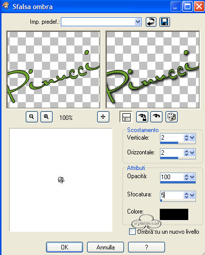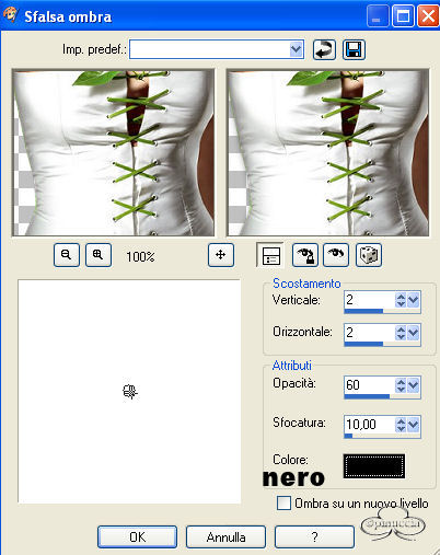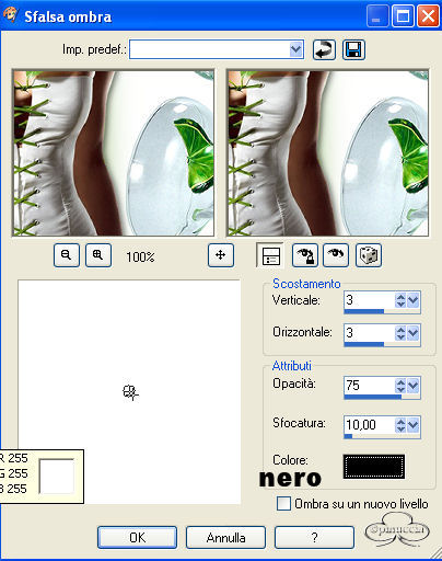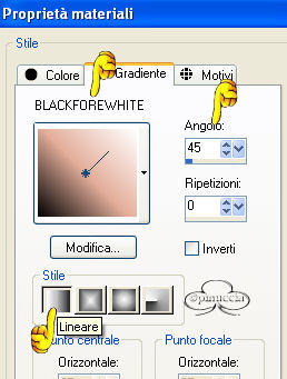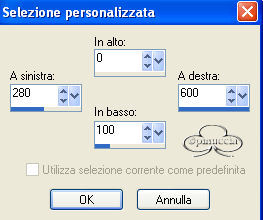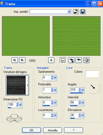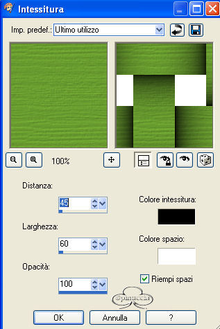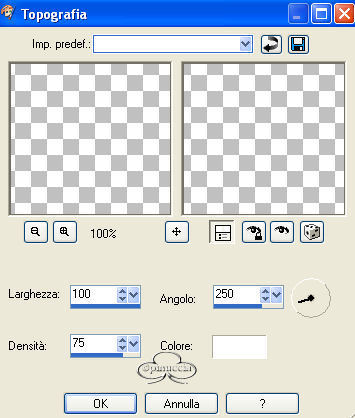 qui puoi trovare qualche risposta ai tuoi dubbi. Se l'argomento che ti interessa non è presente, ti prego di segnalarmelo. Occorrente: Un bel tube con colori vivaci. I tubes che ho usato vengono da High_Standard_Tubes. Materiale qui Metti il gradiente nella cartella dei gradienti. Apri tutti i tubes in PSP. Scegli un colore vivace dal tube come colore di primo piano. Imposta il colore di sfondo con il gradiente Blackforewhite (nello zip), con i seguenti settaggi: (il gradiente prenderà la tonalità del colore scelto come primo piano ![]() Apri una nuova immagine trasparente 600 x 450. Riempi la tela con il gradiente.Attiva lo strumento Selezione ![]() - Selezione personalizzata: ![]() Effetti>Effetti di trama>Intessitura: ![]() Selezione>Nessuna selezione. Livelli>Nuovo livello raster. Selezione - Selezione personalizzata:![]() Riempi la selezione con il gradiente. Selezione>Nessuna selezione. Livelli>Duplica. Immagine>Capovolgi. Chiudi il livello dello sfondo e lascia attivi gli altri due livelli. Livelli>Unisci>Unisci visibile. Adesso puoi riaprire il livello dello sfondo. Posizionati sul livello superiore. Effetti>Effetti artistici>Topografia: ![]() Livelli>Nuovo livello raster. Selezione - Selezione personalizzata:![]() Riempi la selezione con il colore BIANCO. Selezione>Nessuna selezione. Effetti>Effetti artistici>Topografia, con i settaggi usati in precedenza. Livelli>Unisci>Unisci visibile. Apri il tube Kt_leaf-corset e vai a Modifica>Copia. Torna al tuo lavoro e vai a Modifica>Incolla>Incolla come nuovo livello. Spostalo a sinistra. Effetti>Effetti 3D>Sfalsa ombra, con i seguenti settaggi: ![]() Apri il file FBR_lime- margarita e vai a Modifica>Copia. Torna al tuo lavoro e vai a Modifica>Incolla>Incolla come nuovo livello. Mettilo in mezzo alla parte bianca. Livelli>Unisci>Unisci tutto. Livelli>Duplica. Immagine>Ridimensiona, 85%, tutti i livelli NON selezionato. ![]() Posizionati e attiva il livello inferiore. Riempi il livello con il colore di sfondo.Effetti>Effetti di trama>Trama - Venature del legno: ![]() Posizionati e attiva il livello superiore. Effetti>Effetti 3D>Sfalsa ombra, con i seguenti settaggi: ![]() Ripeti lo sfalsa ombra ma con verticale e orizzontale a - 3. Rimane da aggiungere il tuo nome o il watermark, eventualmente ridurre, e la tag è finita. Io ho usato il font AL Sandra, con questi settaggi. ![]() ma naturalmente puoi scegliere quello che preferisci e a seconda della lunghezza del tuo testo. Applica un leggero sfalsa ombra, io ho usato questi settaggi: Effetti>Effetti 3D>Sfalsa ombra: ![]() Livelli>Unisci>Unisci tutto. ![]() ![]() Se hai problemi o dubbi, o trovi un link non funzionante, o anche soltanto per un saluto, scrivimi. Maggio 2006 |