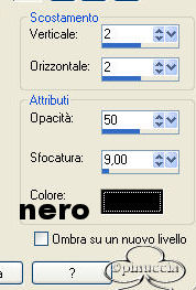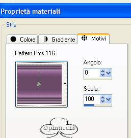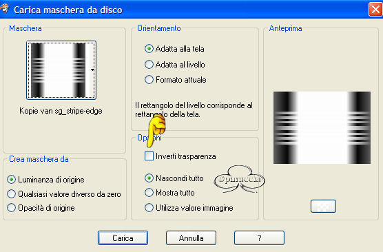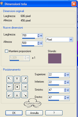 qui puoi trovare qualche risposta ai tuoi dubbi. Se l'argomento che ti interessa non è presente, ti prego di segnalarmelo. Materiale qui Apri i tubes in PSP Metti la maschera nella cartella maschere di PSP e il pattern (motivo) nella cartella Pattern (Motivi) di PSP. Apri una nuova immagine bianca 600 x 450 pixels. Livelli>Nuovo livello raster. Riempi il livello con il pattern Pms116, angolo 0, ripetizioni 100.![]() Livelli>Carica/Salva maschera>Carica maschera da disco Cerca e carica la maschera sg_stripe-edge, inverti trasparenza non selezionato: ![]() Effetti>Effetti di bordo>Aumenta. Livelli>Unisci>Unisci gruppo. Apri il file di testo e vai a Modifica>Copia (naturalmente, se vuoi, puoi fare da solo un altro testo) Torna al tuo lavoro e vai a Modifica>Incolla>Incolla come nuovo livello. Posizionalo come nell'esempio.![]() Livelli>Duplica. Spostalo in basso (vedi l'esempio).![]() Apri il tube e vai a Modifica>Copia. Torna al tuo lavoro e vai a Modifica>Incolla>Incolla come nuovo livello. Effetti>Effetti 3D>Sfalsa ombra: ![]() Livelli>Unisci>Unisci tutto. Immagine>Aggiungi bordatura, 3 pixels, simmetriche, con il colore nero. Immagine>Dimensione tela, con i seguenti settaggi, ![]() come colore dello sfondo un colore preso dal pattern. Apri il file Silence-element e vai a Modifica>Copia. Torna al tuo lavoro e vai a Modifica>Incolla>Incolla come nuovo livello. Spostalo a sinistra.Effetti>Effetti 3D>Sfalsa ombra, con i settaggi usati in precedenza. Livelli>Unisci>Unisci tutto. Immagine>Aggiungi bordatura, 5 pixels, simmetriche, con il colore nero. Aggiungi il nome e il watermark e, se vuoi, riduci l'immagine. Il font che ho usato io è Copperplate Gothic, dimensione 30. ![]() Se vuoi aggiungere l'animazione: Apri Animation shop. Apri l'animazione contenuta nello zip. Vedrai che è composta da quattro fotogrammi. Apri la tag che hai appena salvato. Per creare l'animazione la tag deve avere lo stesso numero di fotogrammi del file animato. Quindi vai a Modifica>Duplica. Ripeti, finchè non avrai ottenuto quattro fotogrammi. Posizionati sul primo fotogramma dell'animazione per selezionarlo. Modifica>Seleziona tutto. Modifica>Copia. Ritorna alla tua tag duplicata e posizionati sul primo fotogramma per selezionarlo. Modifica>Seleziona tutto. Modifica>Incolla>Incolla nel fotogramma selezionato. Trova la posizione e quando ne sei sicuro rilascia il tasto del mouse. Adesso vai a Animazione>Proprietà fotogramma e imposta la velocità a 25 (la stessa velocità dell'animazione). ![]() Per controllare il risultato clicca su Visualizza ![]() Se tutto è ok, salva in formato gif. ![]() Se hai problemi o dubbi, o trovi un link non funzionante, o anche soltanto per un saluto, scrivimi. Giugno 2006 |