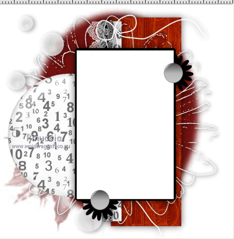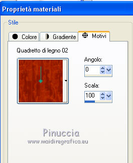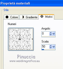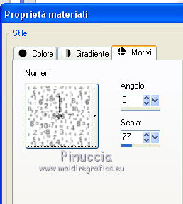 qui puoi trovare qualche risposta ai tuoi dubbi. Se l'argomento che ti interessa non è presente, ti prego di segnalarmelo. Occorrente: Un tube a scelta. Il resto del materiale qui Il tube utilizzato è di Monro ![]() 1. Imposta il colore di primo piano con il colore bianco. 2. Apri il template che sarà la base del tuo lavoro. Attiva il livello Raster 1, e riempilo con il colore bianco.3. Apri "mask" e vai a Modifica>Copia. Torna al tuo template e vai a Modifica>Incolla come nuovo livello. Sposta la maschera un po' più a sinistra.4. Passa il colore di primo piano a Motivi cerca e seleziona il motivo Quadretto di legno 2 (standard in PSP) ![]() Attiva il livello Raster 2, Imposta la modalità di corrispondenza dello strumento Riempimento a Colore (altrimenti l'immagine si riempirà tutta) ![]() e riempi il livello con il motivo.![]() 5. Effetti>Effetti 3D>Sfalsa ombra, colore nero. ![]() 6. Attiva il livello Raster 4. Cambia il motivo di primo piano con il Motivo Numeri (standard in PSP) e i seguenti settaggi. ![]() Riempi il livello con il motivo.7. Effetti>Effetti 3D>Sfalsa ombra, con i settaggi precedenti. 8. Attiva il livello Raster 3. Effetti>Effetti 3D>Sfalsa ombra, con i settaggi precedenti. 9. Apri "lace" e vai a Modifica>Copia. Torna al tuo template e vai a Modifica>Incolla come nuovo livello. Sposta l'elemento a sinistra,sopra il rettangolo nero. 10. Apri "flower" e vai a Modifica>Copia. Torna al tuo template e vai a Modifica>Incolla come nuovo livello. 11. Attiva il livello Raster 5. Effetti>Effetti 3D>Sfalsa ombra, con i settaggi precedenti. 12. Apri "bubbles" e vai a Modifica>Copia. Torna al tuo template e vai a Modifica>Incolla come nuovo livello. Sposta l'elemento a sinistra.13. Cambia i settaggi del motivo Numeri, portando la scala a 50 ![]() Attiva il livello Raster 9, e riempilo con il motivo.Effetti>Effetti 3D>Sfalsa ombra, con i settaggi precedenti. 14. Apri "glass" e vai a Modifica>Copia. Torna al tuo template e vai a Modifica>Incolla come nuovo livello. Sposta l'elemento sopra il cerchio con il motivo numeri.![]() 15. Attiva il livello Raster 6. Effetti>Effetti 3D>Sfalsa ombra, con i settaggi precedenti. 16. Attiva il livello copia di raster 6. Selezione>Seleziona tutto. Selezione>Mobile. 17. Livelli>Nuovo livello raster. Apri il tube del viso o seleziona il viso del tuo tube. Modifica>Copia. Torna al tuo lavoro e vai a Modifica>Incolla nella selezione. Abbassa l'opacità di questo livello all'85%. Selezione>Deseleziona. 18. Apri "stitch" e vai a Modifica>Copia. Torna al tuo template e vai a Modifica>Incolla come nuovo livello. Sposta l'elemento a destra.19. Attiva il livello superiore. Apri "flower 2" e vai a Modifica>Copia. Torna al tuo template e vai a Modifica>Incolla come nuovo livello. Sposta l'elemento un po' più in basso.20. Apri il tuo tube e vai a Modifica>Copia. Torna al tuo template e vai a Modifica>Incolla come nuovo livello. Immagine>Ridimensiona, se e quanto necessario, tutti i livelli non selezionato. Spostalo a destra.Effetti>Effetti 3D>Sfalsa ombra, con i settaggi precedenti. 21. Apri "wordart" e vai a Modifica>Copia. Torna al tuo template e vai a Modifica>Incolla come nuovo livello. Spostalo a destra.22. Aggiungi il tuo nome e/o il tuo watermark. Per il mio esempio ho usato il font Lyric Dragon 23. Livelli>Unisci>Unisci tutto e salva in formato jpg. ![]() Se hai problemi o dubbi, o trovi un link non funzionante, o anche soltanto per un saluto, scrivimi. |