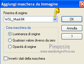 qui puoi trovare qualche risposta ai tuoi dubbi. Se l'argomento che ti interessa non è presente, ti prego di segnalarmelo. Occorrente: Materiale qui Il tube è di Anna.br Apri tutto il materiale in PsP compresa la maschera. Apri una nuova immagine bianca 600 x 600 pixels. Livelli>Nuovo livello raster. il livello con un colore del tuo tube. Il mio #7b2f43. Livelli>Nuovo livello maschera>Da immagine. Apri il menu sotto la finestra di origine e vedrai la lista dei files aperti. Tra questi la maschera WSL_Mask84. Seleziona la maschera con i seguenti settaggi: ![]() Livelli>Unisci>Unisci gruppo. Apri leave frame e vai a Modifica>Copia. Torna al tuo lavoro e vai a Modifica>Incolla come nuovo livello. Effetti>Effetti 3D>Sfalsa ombra, con i seguenti settaggi, colore nero. ![]() Apri BD BCA frame e vai a Modifica>Copia. Torna al tuo lavoro e vai a Modifica>Incolla come nuovo livello. Effetti>Effetti 3D>Sfalsa ombra, con i settaggi precedenti. Apri il tube e vai a Modifica>Copia. Torna al tuo lavoro e vai a Modifica>Incolla come nuovo livello. Effetti>Effetti 3D>Sfalsa ombra, con i settaggi precedenti. Attiva lo strumento Gomma ![]() e cancella la parte del tube sotto la cornice. Apri flower border e vai a Modifica>Copia. Torna al tuo lavoro e vai a Modifica>Incolla come nuovo livello. Sposta i fiori in basso.Apri beaddrop e vai a Modifica>Copia. Torna al tuo lavoro e vai a Modifica>Incolla come nuovo livello. Spostalo a sinistra.Attiva nuovamente la gomma e cancella la parte di cordino che non deve vedersi. ![]() Effetti>Effetti 3D>Sfalsa ombra, con i settaggi precedenti. Livelli>Unisci>Unisci tutto. Aggiungi il tuo nome e/o il tuo watermark. Per il mio testo ho usato il font Ambiance BT Per questi esempi ho usato tubes di Margit e Sat. ![]() ![]() ![]() Se hai problemi o dubbi, o trovi un link non funzionante, o anche soltanto per un saluto, scrivimi.