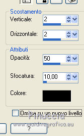 qui puoi trovare qualche risposta ai tuoi dubbi. Se l'argomento che ti interessa non è presente, ti prego di segnalarmelo. Occorrente: Un tube a scelta. Il resto del materiale qui Il tube è di Gabry. ![]() 1. Apri una nuova immagine bianca 700 x 700 pixels. ![]() 2. Apri mask e vai a Modifica>Copia. Torna al tuo lavoro e vai a Modifica>Incolla come nuovo livello. Sposta a sinistra.3. Apri frame e vai a Modifica>Copia. Torna al tuo lavoro e vai a Modifica>Incolla come nuovo livello. Sposta l'elemento a destra.4. Apri doodle e vai a Modifica>Copia. Torna al tuo lavoro e vai a Modifica>Incolla come nuovo livello. Sposta l'elemento a destra.Nella paletta dei livelli porta questo livello sotto il livello della cornice. ![]() 5. Attiva il livello superiore. Livelli>Nuovo livello raster. Attiva lo strumento Selezione a mano libera da punto a punto,e traccia una selezione intorno alla cornice. ![]() 6. Apri il tuo tube. Attiva lo strumento Selezione , rettangolo,e traccia una selezione della testa del tuo tube (se necessario: Immagine>Rifletti). Modifica>Copia. Torna al tuo lavoro e vai a Modifica>Incolla nella selezione. Porta questo livello sotto il livello della cornice. Selezione>Deseleziona. 7. Attiva il livello superiore. Apri lights e vai a Modifica>Copia. Torna al tuo lavoro e vai a Modifica>Incolla come nuovo livello. Sposta l'elemento nella parte superiore della cornice.![]() 8. Apri wordart e vai a Modifica>Copia. Torna al tuo lavoro e vai a Modifica>Incolla come nuovo livello. Spostalo in basso.9. Apri doodles2 e vai a Modifica>Copia. Torna al tuo lavoro e vai a Modifica>Incolla come nuovo livello. Sposta l'elemento a sinistra e un po' più in alto.Porta questo livello sotto il livello della cornice. ![]() 10. Attiva il livello della cornice. Apri fishnett e vai a Modifica>Copia. Torna al tuo lavoro e vai a Modifica>Incolla come nuovo livello. Sposta l'elemento in basso.![]() 11. Attiva il livello superiore (wordart). Apri stars, e vai a Modifica>Copia. Torna al tuo lavoro e vai a Modifica>Incolla come nuovo livello. Sposta le stelle a destra e un po' più in alto.12. Apri il tuo tube e vai a Modifica>Copia. Torna al tuo lavoro e vai a Modifica>Incolla come nuovo livello. Spostalo a sinistra.Porta questo livello sotto il livello del wordart. Se necessario cancella eventuali parti del tube che non devono vedersi.13. Effetti>Effetti 3D>Sfalsa ombra, colore nero. ![]() 14. Aggiungi il tuo nome e/o il tuo watermark su un nuovo livello. Per il mio testo ho usato il font Brush script. 15. Livelli>Unisci>Unisci tutto e salva in formato jpg. ![]() Se hai problemi o dubbi, o trovi un link non funzionante, o anche soltanto per un saluto, scrivimi. |