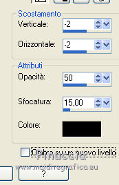 qui puoi trovare qualche risposta ai tuoi dubbi. Se l'argomento che ti interessa non è presente, ti prego di segnalarmelo. Occorrente: Un tube a scelta. Il resto del materiale qui Il tube utilizzato è di Min@ ![]() 1. Apri una nuova immagine bianca 700 x 700 pixels. ![]() 2. Apri flowerback, e vai a Modifica>Copia. Torna al tuo lavoro e vai a Modifica>Incolla come nuovo livello. Spostalo in alto a destra.3. Apri spiderweb, e vai a Modifica>Copia. Torna al tuo lavoro e vai a Modifica>Incolla come nuovo livello. 4. Apri starframe, e vai a Modifica>Copia. Torna al tuo lavoro e vai a Modifica>Incolla come nuovo livello. 5. Apri splatter e vai a Modifica>Copia. Torna al tuo lavoro e vai a Modifica>Incolla come nuovo livello. Spostalo a destra e un po' più in basso.![]() 6. Apri wordart Bite me, e vai a Modifica>Copia. Torna al tuo lavoro e vai a Modifica>Incolla come nuovo livello. Spostalo in alto a destra.![]() 7. Apri red leaves, e vai a Modifica>Copia. Torna al tuo lavoro e vai a Modifica>Incolla come nuovo livello. Spostalo in basso a destra.![]() 8. Effetti>Effetti 3D>Sfalsa ombra, colore nero. ![]() 9. Apri roses, e vai a Modifica>Copia. Torna al tuo lavoro e vai a Modifica>Incolla come nuovo livello. Spostalo in basso a destra.![]() Effetti>Effetti 3D>Sfalsa ombra, con i settaggi precedenti. 10. Apri il tuo tube, e vai a Modifica>Copia. Torna al tuo lavoro e vai a Modifica>Incolla come nuovo livello. Immagine>Ridimensiona, se e quanto necessario, tutti i livelli non selezionato. Spostalo a sinistra.Effetti>Effetti 3D>Sfalsa ombra, con i settaggi precedenti. 11. Apri pink flower doodle, e vai a Modifica>Copia. Torna al tuo lavoro e vai a Modifica>Incolla come nuovo livello. Spostalo in basso a sinistra.Se necessario, cancella eventuali tracce del tube che non devono vedersi. ![]() 12. Aggiungi il tuo nome e/o il tuo watermark. Per il mio testo ho usato il font Rostock Kaligraph 13. Livelli>Unisci>Unisci tutto e salva in formato jpg. ![]() Se hai problemi o dubbi, o trovi un link non funzionante, o anche soltanto per un saluto, scrivimi. |