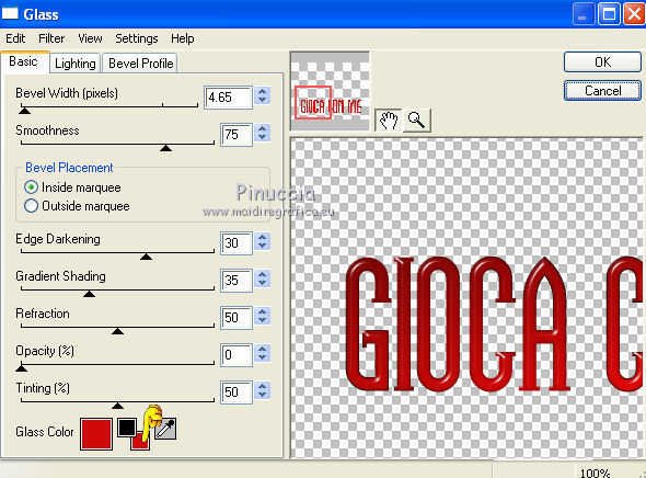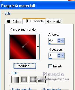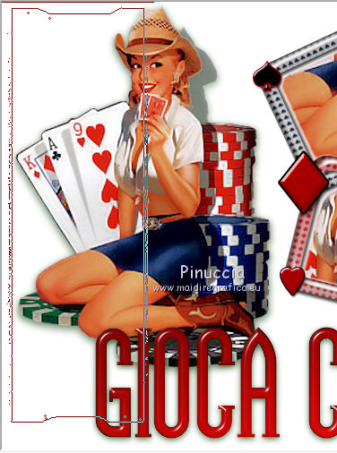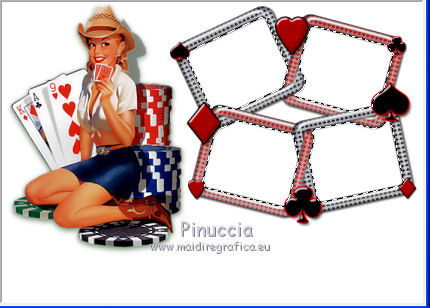 qui puoi trovare qualche risposta ai tuoi dubbi. Se l'argomento che ti interessa non è presente, ti prego di segnalarmelo. Occorrente: Materiale qui. questo tutorial è la versione con un altro tube del tutorial Card game Filtro: Eye Candy 4000 qui Apri i tubes in PSP e metti il pennello nella cartella pennelli. Attenzione, il pennello è composto da due files che non devono essere separati. Vedi gli appunti sui pennelli Apri una nuova immagine BIANCA 700 x 500 pixels. ![]() Apri il tube della donna e vai a Modifica>Copia. Torna alla tua immagine bianca e vai a Modifica>Incolla>Incolla come nuovo livello. Sposta il tube a sinistra, un po' più in alto.Effetti>Effetti 3D>Sfalsa ombra, con i seguenti settaggi, colore nero: ![]() Apri il tube Cardframe e vai a Modifica>Copia. Torna al tuo lavoro e vai a Modifica>Incolla>Incolla come nuovo livello. Spostalo in alto a destra.Livelli>Nuovo livello raster. Livelli>Disponi>Sposta giù. Imposta il colore di primo piano con un rosso (#d00a0a). Attiva il livello superiore (la cornice). Attiva lo strumento Bacchetta magica, modalità aggiungi, RGB, tolleranza 20 e sfumatura 4: nel tutorial originale non è indicato, io ho impostato antialias e interno. ![]() Seleziona i quattro settori interni della cornice. ![]() Attiva il livello sotto quello della cornice e riempi le selezioni con il colore rosso.Selezione>Nessuna selezione. Attiva il livello della cornice. Seleziona con la bacchetta magica la prima cornice.Apri di nuovo il tube della donna e vai a Modifica>Copia. Torna al tuo lavoro e vai a Modifica>Incolla come nuovo livello. Posiziona il tube nell'area selezionata, lasciando visibile la parte che preferisci.Selezione>Inverti. Premi sulla tastiera il tasto CANC. ![]() Selezione>Nessuna selezione. ****Posizionati nuovamente sul livello della cornice. Seleziona la seconda cornice con la bacchetta magica ![]() Modifica>Incolla>Incolla come nuovo livello (il tube è ancora in memoria). Posiziona un'altra parte del tube all'interno della selezione.Selezione>Inverti. Premi sulla tastiera il tasto CANC. Selezione>Nessuna selezione****. Ripeti da **** a **** per gli altri due riquadri della cornice. Chiudi il livello di sfondo bianco e posizionati su uno degli altri livelli. Livelli>Unisci>Unisci visibile. Riapri il livello di sfondo. Imposta il colore di primo piano con il nero e il colore di sfondo con il rosso. Passa il colore di primo piano a Gradiente di primo piano/sfondo, lineare, con i seguenti settaggi: ![]() Livelli>Nuovo livello raster. Attiva lo strumento testo , scegli un font.Per il mio testo ho usato il font NamesakeNF, dimensione 150, mobile. ![]() Scrivi il testo Play with me, oppure - se vuoi in italiano - Gioca con me, oppure un altro testo a tua scelta. Mantieni selezionato. Effetti>Eye Candy 4000 - Glass: per impostare il colore rosso clicca sulla palettina rossa: ![]() Effetti>Effetti 3D>Sfalsa ombra, con i settaggi precedenti. Selezione>Nessuna selezione. Attiva il livello di sfondo bianco. Attiva lo strumento Pennello ,cerca e seleziona il pennello geometric05. Applicalo con il colore nero vicino ai bordi sinistro e superiore. ![]() Aggiungi il tuo watermark o il tuo nome e salva in formato jpg. ![]() Se hai problemi o dubbi, o trovi un link non funzionante, o anche soltanto per un saluto, scrivimi. 5 Marzo 2011 ![]()