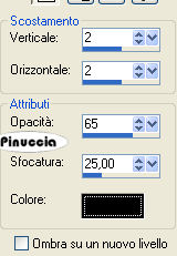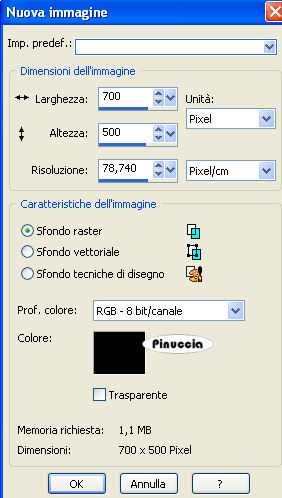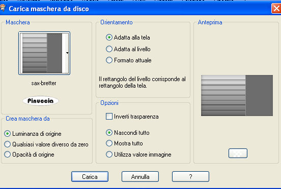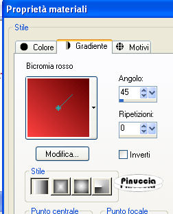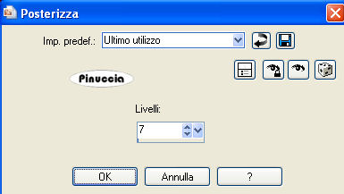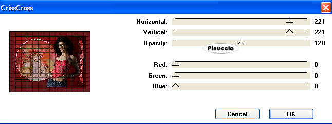 qui puoi trovare qualche risposta ai tuoi dubbi. Se l'argomento che ti interessa non è presente, ti prego di segnalarmelo. Occorrente: Materiale qui Il tube è di Carenties Filtri: Tormentia - Criss Cross qui Metti la maschera nella cartella Maschere. Metti il pennello nella cartella Pennelli. Attenzione, il pennello è composto da due files che non devono essere separati. Vedi gli appunti sui Pennelli qui Apri il resto del materiale in PSP. Apri una nuova immagine nera 700 x 500 pixels. ![]() Livelli>Nuovo livello raster. Imposta il colore di primo piano su Gradiente e cerca un gradiente bicromo, per delimitare la ricerca apri il menu e seleziona bicromie. ![]() Apri il menu dei gradienti e seleziona Bicromia rosso, con i seguenti settaggi: ![]() Oppure crea un tuo gradiente, stile lineare, con due colori scelti dal tuo tube. Sui gradienti vedi qui Riempi l'immagine nera con il gradiente.Livelli>Carica/Salva maschera>Carica maschera da disco. Cerca e carica la maschera sax-bretter: ![]() Effetti>Effetti di bordo>Aumenta. Livelli>Unisci>Unisci gruppo. Attiva lo strumento Selezione , rettangolo,e seleziona il rettangolo della maschera ![]() Effetti>Effetti artistici>Posterizza: ![]() Selezione>Deseleziona. Apri zigzagstitching e vai a Modifica>Copia. Torna al tuo lavoro e vai a Modifica>Incolla come nuovo livello. Spostalo a sinistra.Apri roundbackground e vai a Modifica>Copia. Torna al tuo lavoro e vai a Modifica>Incolla come nuovo livello. Spostalo esattamente al centro della cornice a zigzag.Livelli>Disponi>Sposta giù. Abbassa l'opacità di questo livello al 60%. se devi spostare i due tubes, devi spostarli contemporanemente. Per questo, ti consiglio di collegarli assegnando ai livelli lo stesso numero. ![]() Attiva il livello superiore. Apri il tube della donna e vai a Modifica>Copia. Torna al tuo lavoro e vai a Modifica>Incolla come nuovo livello. Sposta il tube un po' più a destra.Effetti>Effetti 3D>Sfalsa ombra, con i seguenti settaggi, colore nero: ![]() Attiva il livello della maschera (Gruppo-Raster 1). Attiva lo strumento Pennello ![]() cerca e seleziona il pennello aRavenbrush-damaged, e applicalo sulla destra dell'immagine due volte con il colore nero (vedi il mio esempio finale). Livelli>Unisci>Unisci tutto. Immagine>Aggiungi bordatura, 2 pixels, simmetriche, con il colore nero. Immagine>Aggiungi bordatura, 40 pixels, simmetriche, con il colore #641818, o con un colore a tua scelta. Seleziona questo bordo con la bacchetta magica ![]() ![]() Effetti>Plugins>Tormentia - Criss Cross: ![]() Effetti>Effetti 3D>Sfalsa ombra, con i settaggi precedenti. Selezione>Deseleziona. Aggiungi il tuo nome e/o il tuo watermark. Per il mio testo ho usato il font Distant Galaxy I tubes usati per questo esempio sono di Jet e Luz Cristina. ![]() Se hai problemi o dubbi, o trovi un link non funzionante, o anche soltanto per un saluto, scrivimi. 10 Gennaio 2009 |