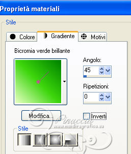 qui puoi trovare qualche risposta ai tuoi dubbi. Se l'argomento che ti interessa non è presente, ti prego di segnalarmelo. Occorrente: Materiale qui Il template è di Sonel Apri tutto il materiale in PSP. Attiva il template, che sarà la base del tuo lavoro. Elimina il livello del logo, e attiva il livello bianco di sfondo. Livelli>Nuovo livello raster. Selezione>Seleziona tutto. Apri temp216 e vai a Modifica>Copia. Torna al tuo lavoro e vai a Modifica>Incolla nella selezione. Selezione>Deseleziona. Livelli>Nuovo livello maschera>Da immagine. Apri il menu sotto la finestra di origine e vedrai la lista dei files aperti. Seleziona la maschera mask1. ![]() Effetti>Effetti di bordo>Aumenta. Livelli>Unisci>Unisci gruppo. Attiva il livello "rectangle 1". Selezione>Seleziona tutto. Selezione>Mobile. Selezione>Immobilizza. Riempi la selezione con il colore bianco.Modifica>Incolla nella selezione (temp216 è ancora in memoria). Selezione>Deseleziona. Attiva il livello "Burst". Selezione>Seleziona tutto. Selezione>Mobile. Selezione>Immobilizza. Modifica>Incolla nella selezione (temp216 è ancora in memoria). Selezione>Deseleziona. Scegli un bel gradiente con colori in armonia con il tuo tube, e impostalo con settaggi a tua scelta. Per il mio esempio ho usato il gradiente bicromia verde brillante. ![]() Attiva il livello "rectangle 2". Selezione>Seleziona tutto. Selezione>Mobile. Selezione>Immobilizza. Selezione>Modifica>Contrai - 3 pixels. Riempi la selezione con il tuo gradiente.Selezione>Deseleziona. Ripeti il passaggio con il livello "rectangle 3". Apri il tuo tube e vai a Modifica>Copia. Torna al tuo lavoro e vai a Modifica>Incolla come nuovo livello. Spostalo un po' più a sinistra.Attiva il livello "wordart". Livelli>Disponi>Porta in alto. Apri flowerborder e vai a Modifica>Copia. Torna al tuo lavoro e vai a Modifica>Incolla come nuovo livello. Spostalo a sinistra.Apri zon e vai a Modifica>Copia. Torna al tuo lavoro e vai a Modifica>Incolla come nuovo livello. Spostalo in alto a destra.Nella paletta dei livelli porta il livello sotto il livello "rectangle 2". ![]() Aggiungi il tuo nome e/o il tuo watermark su un nuovo livello. Per il mio esempio ho usato il font Pristina. Livelli>Unisci>Unisci tutto e salva in formato jpg. ![]() Se hai problemi o dubbi, o trovi un link non funzionante, o anche soltanto per un saluto, scrivimi. |