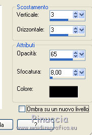 qui puoi trovare qualche risposta ai tuoi dubbi. Se l'argomento che ti interessa non è presente, ti prego di segnalarmelo. Occorrente: Un tube a scelta. Il resto del materiale qui Il tube usato è di Gerda. ![]() Apri una nuova immagine bianca 700 x 700 pixels. ![]() Apri back e vai a Modifica>Copia. Torna al tuo lavoro e vai a Modifica>Incolla come nuovo livello. Apri flower-frame e vai a Modifica>Copia. Torna al tuo lavoro e vai a Modifica>Incolla come nuovo livello. Apri yellow-egg e vai a Modifica>Copia. Torna al tuo lavoro e vai a Modifica>Incolla come nuovo livello. Spostalo a destra.Effetti>Effetti 3D>Sfalsa ombra, colore nero. ![]() Apri white-egg e vai a Modifica>Copia. Torna al tuo lavoro e vai a Modifica>Incolla come nuovo livello. Sposta l'uovo in basso a sinistra.Effetti>Effetti 3D>Sfalsa ombra, con i settaggi precedenti. Apri red-egg e vai a Modifica>Copia. Torna al tuo lavoro e vai a Modifica>Incolla come nuovo livello. Sposta il tube in alto a sinistra.Effetti>Effetti 3D>Sfalsa ombra, con i settaggi precedenti. Livelli>Disponi>Sposta giù. ![]() Attiva il livello superiore. Apri il tube flower-tulip di colore rosso e vai a Modifica>Copia. Torna al tuo lavoro e vai a Modifica>Incolla come nuovo livello. Sposta il tube in basso a sinistra.![]() Effetti>Effetti 3D>Sfalsa ombra, con i settaggi precedenti. Apri il tube flower-tulip di colore blu e vai a Modifica>Copia. Torna al tuo lavoro e vai a Modifica>Incolla come nuovo livello. Sposta il fiore in basso a sinistra, accanto al fiore rosso.Effetti>Effetti 3D>Sfalsa ombra, con i settaggi precedenti. Apri choc eitjes e vai a Modifica>Copia. Torna al tuo lavoro e vai a Modifica>Incolla come nuovo livello. Sposta il tube in basso a sinistra.![]() Effetti>Effetti 3D>Sfalsa ombra, con i settaggi precedenti. Apri il wordart e vai a Modifica>Copia. Torna al tuo lavoro e vai a Modifica>Incolla come nuovo livello. Sposta il testo dove preferisci,o vedi il mio esempio. Apri il tuo tube e vai a Modifica>Copia. Torna al tuo lavoro e vai a Modifica>Incolla come nuovo livello. Immagine>Ridimensiona, se e quanto necessario, tutti i livelli non selezionato. Posiziona il tube dove preferisci,o vedi il mio esempio. Effetti>Effetti 3D>Sfalsa ombra, con i settaggi precedenti. Aggiungi il tuo nome e/o il tuo watermark su un nuovo livello. Per il mio testo ho usato il font Rage Italic LET. Livelli>Unisci>Unisci tutto e salva in formato jpg. ![]() Se hai problemi o dubbi, o trovi un link non funzionante, o anche soltanto per un saluto, scrivimi. |