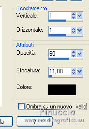 qui puoi trovare qualche risposta ai tuoi dubbi. Se l'argomento che ti interessa non è presente, ti prego di segnalarmelo. Occorrente: Un tube a scelta. Il resto del materiale qui Il tube utilizzato è di Isa. ![]() 1. Apri una nuova immagine bianca 700 x 700 pixels. ![]() 2. Apri fall back e vai a Modifica>Copia. Torna al tuo lavoro e vai a Modifica>Incolla come nuovo livello. 3. Apri wood frame e vai a Modifica>Copia. Torna al tuo lavoro e vai a Modifica>Incolla come nuovo livello. 4. Effetti>Effetti 3D>Sfalsa ombra, colore nero. ![]() 5. Apri red circle e vai a Modifica>Copia. Torna al tuo lavoro e vai a Modifica>Incolla come nuovo livello. Spostalo in alto a sinistra.![]() Effetti>Effetti 3D>Sfalsa ombra, con i settaggi precedenti. 6. Apri pink flowers e vai a Modifica>Copia. Torna al tuo lavoro e vai a Modifica>Incolla come nuovo livello. 7. Apri red leaves e vai a Modifica>Copia. Torna al tuo lavoro e vai a Modifica>Incolla come nuovo livello. Spostalo a destra e un po' più in basso.![]() 8. Apri fall cluster e vai a Modifica>Copia. Torna al tuo lavoro e vai a Modifica>Incolla come nuovo livello. Spostalo in basso a destra,con le due foglie verdi contro il bordo. ![]() Effetti>Effetti 3>Sfalsa ombra, con i settaggi precedenti. 9. Apri il tuo tube e vai a Modifica>Copia. Torna al tuo lavoro e vai a Modifica>Incolla come nuovo livello. Immagine>Ridimensiona, se e quanto necessario, tutti i livelli non selezionato. Spostalo a sinistra,e cancella eventuali tracce del tube sotto la cornice.![]() Effetti>Effetti 3D>Sfalsa ombra, con i settaggi precedenti. Porta questo livello sotto il livello delle foglie rosse. 10. Attiva nuovamente il livello superiore. Aggiungi il tuo nome e/o il tuo watermark. Per il mio testo ho usato il font qui 11. Livelli>Unisci>Unisci tutto e salva in formato jpg. ![]() Se hai problemi o dubbi, o trovi un link non funzionante, o anche soltanto per un saluto, scrivimi. |