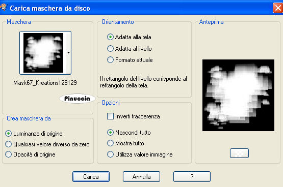 qui puoi trovare qualche risposta ai tuoi dubbi. Se l'argomento che ti interessa non è presente, ti prego di segnalarmelo. Occorrente: Materiale qui La cornice è di Smoooches, il tube è di Mou. Metti la maschera nella cartella Maschere, e apri il resto del materiale in PSP. Apri una nuova immagine bianca 600 x 600 pixels. ![]() Apri ArrowNBows-SmoooochesFramez. Attiva il livello inferiore dello sfondo e vai a Modifica>Copia. Torna al tuo lavoro e vai a Modifica>Incolla come nuovo livello. Livelli>Carica/Salva maschera>Carica maschera da disco. Cerca e carica la maschera mask67_kreations129129. ![]() Effetti>Effetti di bordo>Aumenta. Livelli>Unisci>Unisci gruppo. Attiva nuovamente ArrowsNBows... e posizionati sul livello centrale della cornice. Modifica>Copia. Torna al tuo lavoro e vai a Modifica>Incolla come nuovo livello. Apri "divnat4" e vai a Modifica>Copia. Torna al tuo lavoro e vai a Modifica>Incolla come nuovo livello. Sposta l'ornamento a sinistra.Effetti>Effetti 3D>Sfalsa ombra, con il colore nero. ![]() Livelli>Disponi>Sposta giù. Attiva lo strumento Gomma e cancella le tracce dell'ornamento rimaste all'interno della cornice.![]() Livelli>Duplica. Immagine>Rifletti. Attiva il livello superiore. Apri il tube hmo_heidiklum e vai a Modifica>Copia. Torna al tuo lavoro e vai a Modifica>Incolla come nuovo livello. Spostalo un po' più in alto.Effetti>Effetti 3D>Sfalsa ombra, con i settaggi precedenti. Livelli>Duplica. Nella paletta dei livelli sposta questo livello sotto il livello della cornice. Attiva il livello superiore e cancella le parti del tube che non devono vedersi. ![]() Attiva il livello sotto la cornice e cancella eventuali tracce della copia rimaste sotto la cornice. ![]() Attiva il livello superiore. Apri "embellishment" Modifica>Copia. Torna al tuo lavoro e vai a Modifica>Incolla come nuovo livello. Sposta il tube in basso.Livelli>Unisci>Unisci tutto. Aggiungi il tuo nome e/o il tuo watermark e salva in formato jpg. Per il mio testo ho usato il font Peabody ![]() ![]() Se hai problemi o dubbi, o trovi un link non funzionante, o anche soltanto per un saluto, scrivimi.