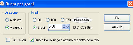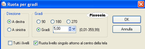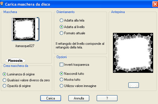 qui puoi trovare qualche risposta ai tuoi dubbi. Se l'argomento che ti interessa non è presente, ti prego di segnalarmelo. Occorrente: Materiale qui Il tube usato per questo tutorial è di Farouche. Filtri: Filters Unlimited 2.0 qui Metti la maschera nella cartella Maschere e apri il resto del materiale in PSP. Apri una nuova immagine bianca 600 x 600 pixels. ![]() Apri lo scrapkit. Posizionati sul livello Raster 12 e vai a Modifica>Copia. Torna al tuo lavoro e vai a Modifica>Incolla come nuovo livello. Immagine>Ridimensiona, all'85%, bicubica, tutti i livelli non selezionato - 2 volte. ![]() Selezione>Seleziona tutto. Selezione>Mobile. Selezione>Immobilizza. Effetti>Plugins>Filters Unlimited - Edges,Square - Square Edge 17. Selezione>Deseleziona. Immagine>Ruota per gradi - 5 gradi a destra: ![]() Effetti>Effetti 3D>sfalsa ombra, con i seguenti settaggi, colore nero. ![]() Posizionati sul livello Raster 7 dello scrapkit e vai a Modifica>Copia. Torna al tuo lavoro e vai a Modifica>Incolla come nuovo livello. Immagine>Ridimensiona, all'85%, bicubica, tutti i livelli non selezionato - 2 volte. ![]() Selezione>Seleziona tutto. Selezione>Mobile. Selezione>Immobilizza. Effetti>Plugins>Filters Unlimited - Edges,Square - Square Edge 17. Selezione>Deseleziona. Immagine>Ruota per gradi - 5 gradi a sinistra: ![]() Effetti>Effetti 3D>sfalsa ombra, con i seguenti settaggi, colore nero. ![]() Livelli>Nuovo livello raster. Selezione>Seleziona tutto. Posizionati sul livello Raster 10 dello scrapkit e vai a Modifica>copia. Torna al tuo lavoro e vai a Modifica>Incolla nella selezione. Selezione>Deseleziona. Livelli>Carica/Salva maschera>Carica maschera da disco. Cerca e carica la maschera itamasque027: ![]() Effetti>Effetti di bordo>Aumenta. Livelli>Unisci>Unisci gruppo. Posizionati sul livello Raster 6 dello scrapkit e vai a Modifica>Copia. Torna al tuo lavoro e vai a Modifica>Incolla come nuovo livello. Posizionati sul livello Raster 2 dello scrapkit e vai a Modifica>Copia. Torna al tuo lavoro e vai a Modifica>Incolla come nuovo livello. Apri il tube della donna e vai a Modifica>Copia. Torna al tuo lavoro e vai a Modifica>Incolla come nuovo livello. Livelli>Disponi>Sposta giù. Sistema il tube dentro la cornice.![]() Attiva lo strumento Gomma e cancella la parte del tube all'esterno della cornice.![]() Attiva il livello superiore. Posizionati sul livello Raster 8 dello scrapkit e vai a Modifica>Copia. Torna al tuo lavoro e vai a Modifica>Incolla come nuovo livello. Livelli>Disponi>Sposta giù. Posizionati sul livello Raster 14 dello scrapkit e vai a Modifica>Copia. Torna al tuo lavoro e vai a Modifica>Incolla come nuovo livello. Sposta la decorazione in baso a sinistra.Livelli>Disponi>Sposta giù, così il livello si troverà sotto il livello della donna. ![]() Attiva nuovamente il livello superiore. Livelli>Duplica. Immagine>Ridimensiona, 2 volte all'85%, bicubica, tutti i livelli non selezionato. Immagine>Ruota per gradi - 15 gradi a sinistra: ![]() Posiziona la cornice in alto a destra.Livelli>Duplica e, nella paletta dei livelli, sposta questo livello sotto il livello della cornice più grande. Poi collega i due livelli con lo stesso numero, in modo che - se dovessi spostarne uno - si sposti contemporaneamente anche il duplicato. ![]() Attiva il livello superiore. Attiva lo strumento Gomma e cancella la parte di cornice indicata dalla manina, per dare l'impressione che le due cornici siano intrecciate. ![]() Posizionati sul livello Raster 5 dello scrapkit e vai a Modifica>Copia. Torna al tuo lavoro e vai a Modifica>Incolla come nuovo livello. Sposta il fiore in alto a sinistra.Posizionati sul livello Copy of Raster 5 dello scrapkit e vai a Modifica>Copia. Torna al tuo lavoro e vai a Modifica>Incolla come nuovo livello. Sposta questo fiore in alto a sinistra accanto al precedente.Posizionati sul livello Raster 9 dello scrapkit e vai a Modifica>Copia. Torna al tuo lavoro e vai a Modifica>Incolla come nuovo livello. Sposta il cuore in alto a destra,e cancella la parte della catena che deve trovarsi sotto la cornice. Posizionati sul livello Copy of Raster 9 dello scrapkit e vai a Modifica>Copia. Torna al tuo lavoro e vai a Modifica>Incolla come nuovo livello. Sposta questo cuore in alto a destra, accanto al precedente,e cancella la parte della catena che deve trovarsi sotto la cornice. ![]() Posizionati sul livello Raster 3 dello scrapkit e vai a Modifica>Copia. Torna al tuo lavoro e vai a Modifica>Incolla come nuovo livello. Sposta il nastro sotto la cornice.Livelli>Unisci>Unisci tutto. Aggiungi il tuo nome e/o il tuo watermark e salva in formato jpg. Per il mio testo ho usato il font Aquarelle Se hai problemi o dubbi, o trovi un link non funzionante, o anche soltanto per un saluto, scrivimi. 26 Gennaio 2009 |