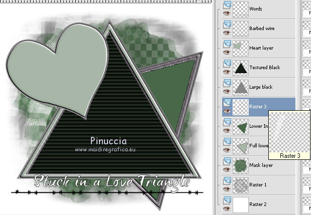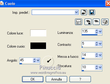 qui puoi trovare qualche risposta ai tuoi dubbi. Se l'argomento che ti interessa non è presente, ti prego di segnalarmelo. Occorrente: Un tube a scelta. Il resto del materiale qui Il tube usato è di Monro ![]() 1. Apri il template, che sarà la base del tuo lavoro. Livelli>Nuovo livello raster. Livelli>Disponi>Porta sotto. Riempi con il colore bianco.2. Apri "masker" e vai a Modifica>Copia. Torna al tuo lavoro e vai a Modifica>Incolla come nuovo livello. 3. Attiva il livello "full lower triangle". Effetti>Effetti di trama>Cuoio. ![]() Ripeti l'Effetto sui livelli "Large black" e "heart layer". 4. Apri "tule" e vai a Modifica>Copia. Torna al tuo lavoro e vai a Modifica>Incolla come nuovo livello. Spostalo in basso a sinistra, sotto il livello "Large black".![]() 5. Attiva il livello "textured back". Apri "tak" e vai a Modifica>Copia. Torna al tuo lavoro e vai a Modifica>Incolla come nuovo livello. Sposta il tube a sinistra.![]() 6. Apri "Parel" e vai a Modifica>Copia. Torna al tuo lavoro e vai a Modifica>Incolla come nuovo livello. Sposta il tube a sinistra.![]() Effetti>Effetti 3D>Sfalsa ombra, colore nero. ![]() 7. Attiva il livello "heart layer". Apri "koppel" e vai a Modifica>Copia. Torna al tuo lavoro e vai a Modifica>Incolla come nuovo livello. Sposta l'immagine nel cuore.![]() 8. Apri "strik" e vai a Modifica>Copia. Torna al tuo lavoro e vai a Modifica>Incolla come nuovo livello. Sposta il tube in alto.9. Apri il tuo tube e vai a Modifica>Copia. Torna al tuo lavoro e vai a Modifica>Incolla come nuovo livello. Immagine>Ridimensiona, se e quanto necessario, tutti i livelli non selezionato. Posiziona il tube come preferisci o vedi il mio esempio.Effetti>Effetti 3D>Sfalsa ombra, con i settaggi precedenti. 10. Eventualmente, aggiungi l'Effetto Sfalsa ombra, agli altri livelli. Per il mio esempio l'ho fatto ai livelli "Heart layer", "Large black", "Full lower triangle", "Words" e "Barbed wire". 10. Aggiungi il tuo nome e/o il tuo watermark su un nuovo livello. Per il mio testo ho usato il font ProseScriptSSK Bold. Livelli>Unisci>Unisci tutto e salva in formato jpg. ![]() Se hai problemi o dubbi, o trovi un link non funzionante, o anche soltanto per un saluto, scrivimi. |
