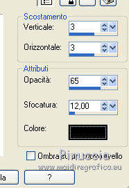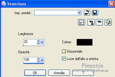 qui puoi trovare qualche risposta ai tuoi dubbi. Se l'argomento che ti interessa non è presente, ti prego di segnalarmelo. Occorrente: Un tube a scelta. Il resto del materiale qui Il template è di Blissfully Beth ![]() 1. Apri il template, che sarà la base del tuo lavoro. Chiudi o elimina il livello del watermark. 2. Attiva il livello inferiore bianco "bg". 3. Apri mask, e vai a Modifica>Copia. Torna al tuo lavoro e vai a Modifica>Incolla come nuovo livello. 4. Apri back, e vai a Modifica>Copia. Torna al tuo lavoro e vai a Modifica>Incolla come nuovo livello. Spostalo un po' più a destra.![]() 5. Imposta il colore di primo piano con il colore nero, e il colore di sfondo con #6b9fa3. 6. Attiva il livello "7". Selezione>Seleziona tutto. Selezione>Mobile. Selezione>Immobilizza. Riempi con il colore di sfondo #6b9fa3.Selezione>Deseleziona. Effetti>Effetti 3D>Sfalsa ombra, colore nero. ![]() Effetti>Effetti di trama>Veneziana, con i settaggi standard, orizzontale non selezionato. ![]() 7. Ripeti il punto 6 sui livelli "6" e "4". 8. Attiva il livello "5". Apri rectangle-art, e vai a Modifica>Copia. Torna al tuo lavoro e vai a Modifica>Incolla come nuovo livello. Sposta sul rettangolo del livello "5".![]() 9. Apri flower-circle e vai a Modifica>Copia. Torna al tuo lavoro e vai a Modifica>Incolla come nuovo livello. 10. Apri il tuo tube e vai a Modifica>Copia. Torna al tuo lavoro e vai a Modifica>Incolla come nuovo livello. Immagine>Ridimensiona, se e quanto necessario, tutti i livelli non selezionato. Sposta il tube come preferisci.11. Effetti>Effetti 3D>Sfalsa ombra, con i settaggi precedenti. ![]() 12. Adesso inserisci nei livelli "1", "2", e "3", dei visi, o parti del tuo tube. Attiva il livello "1". Selezione>Seleziona tutto. Selezione>Mobile. Selezione>Modifica>Contrai - 10 pixels. Apri il tube del viso o la selezione del tuo viso e vai a Modifica>Copia. Torna al tuo lavoro e vai a Modifica>Incolla nella selezione. Selezione>Deseleziona. 13. Ripeti il punto 12 sui livelli "2" e "3". Effetti>Effetti 3D>Sfalsa ombra, con i settaggi precedenti. 14. Per il mio esempio, sui livelli dei visi ho applicato: Regola>Tonalità e saturazione>Viraggio. ![]() 15. Apri il wordart e vai a Modifica>Copia. Torna al tuo lavoro e vai a Modifica>Incolla come nuovo livello. Sposta il wordart a destra.16. Aggiungi il tuo nome e/o il tuo watermark su un nuovo livello. Per il mio esempio ho usato il font Janda Quirkygirl 17. Livelli>Unisci>Unisci tutto e salva in formato jpg. ![]() Se hai problemi o dubbi, o trovi un link non funzionante, o anche soltanto per un saluto, scrivimi. |