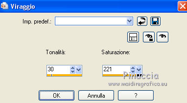 qui puoi trovare qualche risposta ai tuoi dubbi. Se l'argomento che ti interessa non è presente, ti prego di segnalarmelo. Occorrente: Un tube a scelta. Il resto del materiale qui Il tube utilizzato è di Snakelady. Il template è di Sonel. ![]() 1. Apri il template, che sarà la base del tuo lavoro. Per allargare la tela: Immagine>Dimensioni tela - 700 x 500 pixels. ![]() 2. Chiudi il livello Logo (sarà eliminato quando unirai i livelli alla fine del tutorial). 3. Attiva il livello inferiore "background". 4. Apri "mask" e vai a Modifica>Copia. Torna al tuo lavoro e vai a Modifica>Incolla come nuovo livello. 5. Apri "leaf-frame" e vai a Modifica>Copia. Torna al tuo lavoro e vai a Modifica>Incolla come nuovo livello. Sposta la cornice a destra.![]() 6. Apri "stars" e vai a Modifica>Copia. Torna al tuo lavoro e vai a Modifica>Incolla come nuovo livello. Sposta il tube a sinistra.![]() 7. Attiva il livello "Rectangle". Apri "flower-rectangle", e vai a Modifica>Copia. Torna al tuo lavoro e vai a Modifica>Incolla come nuovo livello. Sposta il rettangolo su quello esistente.![]() 8. Attiva il livello "circle 1". Apri "flower-circle" e vai a Modifica>Copia. Torna al tuo lavoro e vai a Modifica>Incolla come nuovo livello. Spostalo sul cerchio bianco esistente.![]() 9. Attiva il livello "circle 2". Selezione>Seleziona tutto. Selezione>Mobile. Selezione>Immobilizza. 10. Attiva il tuo tube. Attiva lo strumento Selezione , cerchio,e traccia una selezione del viso del tuo tube. Torna al tuo lavoro. Livelli>Nuovo livello raster. Modifica>Incolla nella selezione. Immagine>Rifletti. Selezione>Deseleziona. 11. Attiva il livello "Love wordart". Regola>Tonalità e saturazione>Viraggio. ![]() 12. Apri "lemonade" e vai a Modifica>Copia. Torna al tuo lavoro e vai a Modifica>Incolla come nuovo livello. Spostalo in basso a sinistra.![]() 13. Apri il tuo tube e vai a Modifica>Copia. Torna al tuo lavoro e vai a Modifica>Incolla come nuovo livello. Spostalo a destra.14. Effetti>Effetti 3D>Sfalsa ombra, colore nero. ![]() 15. Aggiungi il tuo nome e/o il tuo watermark su un nuovo livello. Per il mio esempio ho usato il font Rage Italic (standard in Windows). 16. Livelli>Unisci>Unisci tutto e salva in formato jpg. ![]() Se hai problemi o dubbi, o trovi un link non funzionante, o anche soltanto per un saluto, scrivimi. |