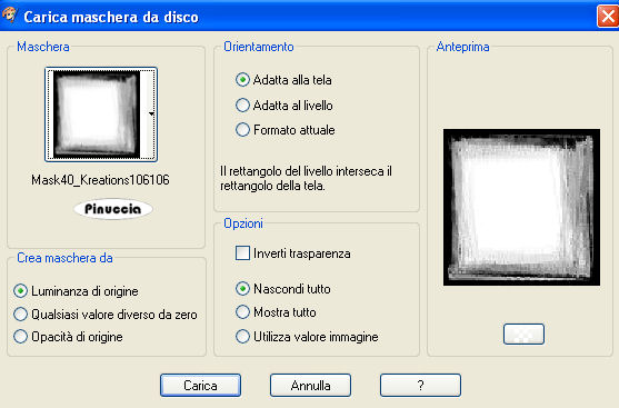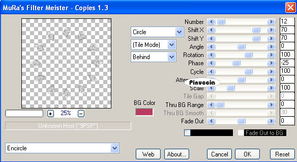 qui puoi trovare qualche risposta ai tuoi dubbi. Se l'argomento che ti interessa non è presente, ti prego di segnalarmelo. Occorrente: Lo scrapkit So red di Scrap and tubes http://scrapandtubes.blogspot.com/" che puoi scaricare qui http://scrapandtubes.blogspot.com/search/label/PU%20KITS, scorrendo la pagina in basso. Materiale qui Il tube è di Jet Metti la maschera nella cartella Maschere, e apri il resto del materiale in PSP. Apri una nuova immagine bianca 700 x 700 pixels. Dallo scrapkit apri "So Red_paper 1" e vai a Modifica>Copia. Torna al tuo lavoro e vai a Modifica>Incolla come nuovo livello. Livelli>Carica/Salva maschera>Carica maschera da disco. Cerca e carica la maschera mask40_kreations106106. ![]() Livelli>Unisci>Unisci gruppo. Dallo scrapkit apri So Red_frame e vai a Modifica>Copia. Torna al tuo lavoro e vai a Modifica>Incolla come nuovo livello. Immagine>Ridimensiona, al 95%, tutti i livelli non selezionato. ![]() Effetti>Effetti 3D>Sfalsa ombra, con il colore nero. ![]() Dallo scrapkit apri So Red_Tag e vai a Modifica>Copia. Torna al tuo lavoro e vai a Modifica>Incolla come nuovo livello. Sposta la targhetta in basso a destra.Livelli>Disponi>Sposta giù. Attiva lo strumento Gomma ![]() e cancella parte della targhetta rimasta all'interno della cornice. ![]() Effetti>Effetti 3D>Sfalsa ombra, con i settaggi precedenti. Attiva il livello superiore. Apri "Tak" e vai a Modifica>copia. Torna al tuo lavoro e vai a Modifica>Incolla come nuovo livello. Sposta l'immagine nell'angolo in alto a sinistra.Livelli>Disponi>Sposta giù. Attiva il livello superiore. Dallo scrapkit apri So Red_Diamond e vai a Modifica>Copia. Torna al tuo lavoro e vai a Modifica>Incolla come nuovo livello. Effetti>Plugins>Mura's Meister - Copies; seleziona Encircle, con i valori "Shift" entrambi impostati a 70: ![]() Sposta questa cornice un po' più a destra, vedi il mio esempio.Effetti>Effetti 3D>Sfalsa ombra, con i settaggi precedenti. Apri il tube della donna e vai a Modifica>Copia. Torna al tuo lavoro e vai a Modifica>Incolla come nuovo livello. Se stai usando il tube fornito con il materiale, non occorre spostarlo. E' già correttamente posizionato. Effetti>Effetti 3D>sfalsa ombra con i settaggi precedenti. Livelli>Duplica e, nella paletta dei livelli, sposta questo livello sotto il livello della cornice. Attiva il livello superiore e cancella le parti del tube sopra e sotto la cornice. ![]() Attiva il livello del tube sotto la cornice e cancella eventuali tracce della copia rimaste sotto la cornice. ![]() Attiva il livello superiore. Dallo scrapkit apri So Red_Flowers e vai a Modifica>Copia. Torna al tuo lavoro e vai a Modifica>Incolla come nuovo livello. Immagine>Rifletti. Sposta il fiore a sinistra.Effetti>Effetti 3d>Sfalsa ombra, con i settaggi precedenti. Dallo scrapkit apri So Red_Ribbon e vai a Modifica>Copia. Torna al tuo lavoro e vai a Modifica>Incolla come nuovo livello. Sposta il nastro a sinistra.Livelli>Disponi>Sposta giù. Effetti>Effetti 3d>Sfalsa ombra, con i settaggi precedenti. Livelli>Unisci>Unisci tutto. Aggiungi il tuo nome e/o il tuo watermark e salva in formato jpg. Per il mio testo ho usato il font CK Frosting Per questo esempio ho usato un tube di LuzCristina. ![]() Se hai problemi o dubbi, o trovi un link non funzionante, o anche soltanto per un saluto, scrivimi.