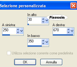 qui puoi trovare qualche risposta ai tuoi dubbi. Se l'argomento che ti interessa non č presente, ti prego di segnalarmelo. Occorrente: Materiale qui Il tube č di Viki Floki Apri tutto il materiale in PSP. Apri backSP. Questa sarą la base del tuo lavoro. Apri BandSP e vai a Modifica>Copia. Torna all'immagine di sfondo e vai a Modifica>Incolla come nuovo livello. E' gią correttamente posizionato. Non occorre spostarlo. Livelli>Nuovo livello raster. Attiva lo strumento Selezione ![]() clicca sull'icona Selezione personalizzata ![]() e imposta i seguenti settaggi: ![]() Apri il tube "TerryThink Sprin" e vai a Modifica>Copia. Torna al tuo lavoro e vai a Modifica>Incolla nella selezione. Effetti>Effetti 3D>Sfalsa ombra, con i seguenti settaggi, colore nero. ![]() Selezione>Deseleziona. Apri Cupid_and_Psyche e vai a Modifica>copia. Torna al tuo lavoro e vai a Modifica>Incolla come nuovo livello. Sposta il tube a sinistra in modo che il testo del © si trovi sopra il bordo inferiore.Nella paletta dei livelli porta questo livello sotto il livello della striscia (Raster 2). ![]() Attiva il livello superiore. Apri cornerSP e vai a Modifica>copia. Torna al tuo lavoro e vai a Modifica>Incolla come nuovo livello. Spostalo nell'angolo in alto a destra del rettangolo.Livelli>Duplica. Immagine>Rifletti. Immagine>Capovolgi. Sistema il duplicato nell'angolo in basso a sinistra del rettangolo.![]() Apri il file di testo WordArtSP e vai a Modifica>Copia. Torna al tuo lavoro e vai a Modifica>Incolla come nuovo livello. Sposta il testo in basso.Livelli>Unisci>Unisci tutto. Immagine>Aggiungi bordatura, 1 pixel, simmetriche, con un colore scuro. Aggiungi il tuo nome e/o il tuo watermark. Per il mio testo ho usato il font Snipple, fornito con il materiale. Se hai problemi o dubbi, o trovi un link non funzionante, o anche soltanto per un saluto, scrivimi. 1 Febbraio 2009 |