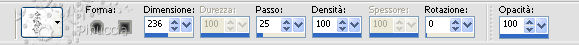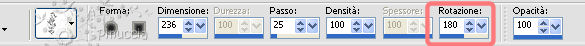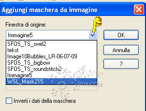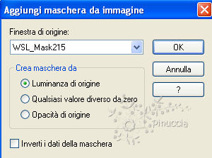 qui puoi trovare qualche risposta ai tuoi dubbi. Se l'argomento che ti interessa non è presente, ti prego di segnalarmelo. Occorrente: Materiale qui Il tube usato è di Lori Rhae. Metti i pennelli nella cartella Pennelli. Attenzione i pennelli sono composti entrambi da due files che non devono essere separati. Vedi gli appunti sui pennelli qui Apri tutto il materiale in PSP, compresa la maschera. Apri una nuova immagine BIANCA 600 x 600 pixels. ![]() Livelli>Nuovo livello raster. Riempi il livello con un colore scelto dal tube. Il mio #5a3326.Livelli>Nuovo livello raster>Da maschera. Apri il menu sotto la finestra di origine e vedrai la lista dei files aperti: ![]() Seleziona la maschera WSL_Mask215, inverti i dati della maschera non selezionato. ![]() Livelli>Unisci>Unisci gruppo. Apri SFOS_TS_swirl2 e vai a Modifica>Copia. Torna al tuo lavoro e vai a Modifica>Incolla come nuovo livello. Livelli>Disponi>Sposta giù. Sposta la decorazione in alto a destra,e cancella la parte all'interno della maschera. ![]() Livelli>duplica. Immagine>Rifletti. Immagine>Capovolgi. Attiva il livello superiore. Apri SFOS_TS_roundstitch2 e vai a Modifica>Copia. Torna al tuo lavoro e vai a Modifica>Incolla come nuovo livello. Spostalo in alto a sinistra.Con la gomma cancella la parte all'interno della maschera. ![]() Effetti>Effetti 3D>Sfalsa ombra, con i seguenti settaggi, colore nero: ![]() Apri il file con il testo "tekst" e vai a Modifica>Copia. Torna al tuo lavoro e vai a Modifica>Incolla come nuovo livello. Attiva il livello di sfondo bianco. Livelli>Nuovo livello raster. Attiva lo strumento Pennello ![]() cerca e seleziona il pennello pmsbrush13 002, ![]() Applicalo in basso a destra con il colore #5a3326, o con il colore che hai scelto. Imposta la rotazione del pennello a 180 gradi. ![]() Livelli>Nuovo livello raster. Applica il pennello in alto a sinistra. Livelli>Nuovo livello raster. Seleziona il pennello hbgbrush-old053 002, e applicalo due volte in alto a sinistra. Attiva il livello superiore. Apri SFOS_TS_bigbow e vai a Modifica>Copia. Torna al tuo lavoro e vai a Modifica>Incolla come nuovo livello. Spostalo in basso a sinistra.Apri il tube della donna e vai a Modifica>Copia. Torna al tuo lavoro e vai a Modifica>Incolla come nuovo livello. Effetti>Effetti 3D>Sfalsa ombra, con i settaggi precedenti. Aggiungi il tuo nome e/o il tuo watermark. Per il mio esempio ho usato il font Al Hair Brained Livelli>Unisci>Unisci tutto e salva in formato jpg. Anche per questo esempio ho usato un tube di Lori Rhae. ![]()