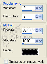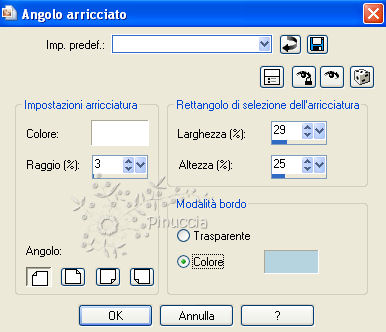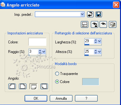 qui puoi trovare qualche risposta ai tuoi dubbi. Se l'argomento che ti interessa non è presente, ti prego di segnalarmelo. Occorrente: Un tube a scelta. Il resto del materiale qui Il tube usato è mio (da una foto trovata in rete). Il materiale scrap utilizzato è di Leitis Apri tutto il materiale in PSP. Apri una nuova trasparente 600 x 600 pixels. Imposta il colore di primo piano con un colore blu (il mio #a7c0db). Riempi l'immagine trasparente con il colore di primo piano.Apri element(13) e vai a Modifica>Copia. Torna al tuo lavoro e vai a Modifica>Incolla come nuovo livello. Apri element(71) e vai a Modifica>Copia. Torna al tuo lavoro e vai a Modifica>Incolla come nuovo livello. Spostalo in basso a sinistra.Livelli>Nuovo livello raster. Riempi il livello con il colore bianco.Selezione>Seleziona tutto. Apri water 4 e vai a Modifica>Copia. Torna al tuo lavoro e vai a Modifica>Incolla nella selezione. Selezione>Deseleziona. Immagine>Ridimensiona, all'85%, tutti i livelli non selezionato, ricampionamento bicubica. ![]() Effetti>Effetti 3D>sfalsa ombra, con i seguenti settaggi, colore nero. ![]() Effetti>Effetti di immagine>Angolo arricciato. seleziona angolo in alto a sinistra, con il colore #b6d3e0: ![]() Ripeti Effetti>Effetti di immagine>Angolo arricciato, selezionando angolo in basso a destra: ![]() Apri water 3 e vai a Modifica>Copia. Torna al tuo lavoro e vai a Modifica>Incolla come nuovo livello. Spostalo in basso contro il bordo a destra.Livelli>Duplica. Immagine>Rifletti. Immagine>Capovolgi. Sposta questo livello in basso.![]() Apri element(44) e vai a Modifica>Copia. Torna al tuo lavoro e vai a Modifica>Incolla come nuovo livello. Spostalo in alto a destra.![]() Effetti>Effetti 3D>sfalsa ombra, con i seguenti settaggi, colore nero. ![]() Apri element(80) e vai a Modifica>Copia. Torna al tuo lavoro e vai a Modifica>Incolla come nuovo livello. Spostalo in alto a destra.Apri element(24) e vai a Modifica>Copia. Torna al tuo lavoro e vai a Modifica>Incolla come nuovo livello. Spostalo in alto a destra.Livelli>Disponi>Sposta giù. ![]() Effetti>Effetti 3D>sfalsa ombra, con i settaggi precedenti. Apri il tube e vai a Modifica>Copia. Torna al tuo lavoro e vai a Modifica>Incolla come nuovo livello. Spostalo a sinistra.Effetti>Effetti 3D>Sfalsa ombra, con i seguenti settaggi, colore nero. ![]() Apri water 6 e vai a Modifica>Copia. Torna al tuo lavoro e vai a Modifica>Incolla come nuovo livello. Spostalo in basso sotto il piedi della donna.Livelli>Disponi>Sposta giù. ![]() Immagine>Aggiungi bordatura, 1 pixel, simmetriche, con il colore blu. Aggiungi il tuo nome e/o il tuo watermark. Per il mio testo ho usato il font Al HairBrained. Livelli>Unisci>Unisci tutto e salva in formato jpg. Se vuoi creare l'animazione Copia il tuo lavoro: Modifica>Copia. Apri Animation Shop e vai a Modifica>Incolla>Incolla cme nuova animazione. Modifica>Duplica e ripeti finchè non avrai 12 fotogrammi. Clicca sul primo fotogramma per selezionarlo e vai a Modifica>Seleziona tutto. Apri l'animazione "Bird Flying", anche questa composta da 12 fotogrammi. Clicca sul primo fotogramma per selezionarlo e vai a Modifica>Seleziona tutto. Modifica>Copia. Attiva il tuo lavoro e vai a Modifica>Incolla>Incolla nel fotogramma selezionato. Posiziona la colomba nell'area bianca e, quando sei certo di aver trovato la posizione corretta, rilascia il tasto del mouse. L'animazione non ha lo sfondo trasparente: posizionandola, dovrai cercare di non coprire le aree colorate. Animazione>Proprietà fotogramma e imposta la velocità a 15. ![]() Controlla il risultato cliccando su Visualizza e salva in formato gif.Per questo esempio ho usato un tube di Macha. ![]()
