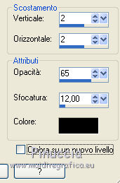 4. Apri glass e vai a Modifica>Copia.Torna al tuo lavoro e vai a Modifica>Incolla come nuovo livello. Spostalo in alto a sinistra.![]() 5. Apri doodle e vai a Modifica>Copia. Torna al tuo lavoro e vai a Modifica>Incolla come nuovo livello. Spostalo a sinistra e un po' più in alto.6. Effetti>Effetti 3D>Sfalsa ombra, colore nero. ![]() 7. Apri il tuo tube e vai a Modifica>Copia. Torna al tuo lavoro e vai a Modifica>Incolla come nuovo livello. Spostalo a destra.Effetti>Effetti 3D>Sfalsa ombra, con i settaggi precedenti. 8. Apri grass e vai a Modifica>Copia. Torna al tuo lavoro e vai a Modifica>Incolla come nuovo livello. Spostalo in basso e un po' più a sinistra.Effetti>Effetti 3D>Sfalsa ombra, con i settaggi precedenti. 9. Apri bottom e vai a Modifica>Copia. Torna al tuo lavoro e vai a Modifica>Incolla come nuovo livello. Spostalo in basso.10. Apri leaves e vai a Modifica>Copia. Torna al tuo lavoro e vai a Modifica>Incolla come nuovo livello. Sposta anche questo elemento in basso.Effetti>Effetti 3D>Sfalsa ombra, con i settaggi precedenti. 11. Apri stack e vai a Modifica>Copia. Torna al tuo lavoro e vai a Modifica>Incolla come nuovo livello. Spostalo in basso a sinistra.Effetti>Effetti 3D>Sfalsa ombra, con i settaggi precedenti. 12. Apri vase e vai a Modifica>Copia. Torna al tuo lavoro e vai a Modifica>Incolla come nuovo livello. Sposta anche questo elemento in basso a sinistra.Effetti>Effetti 3D>Sfalsa ombra, con i settaggi precedenti. 13. Apri bowl e vai a Modifica>Copia. Torna al tuo lavoro e vai a Modifica>Incolla come nuovo livello. Spostalo in basso a sinistra.![]() Effetti>Effetti 3D>Sfalsa ombra, con i settaggi precedenti. 14. Aggiungi il tuo nome e/o il tuo watermark su un nuovo livello. Per il mio esempio ho usato il font Mojacalo Relief 15. Livelli>Unisci>Unisci tutto e salva in formato jpg. ![]() Se hai problemi o dubbi, o trovi un link non funzionante, o anche soltanto per un saluto, scrivimi. |
