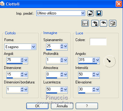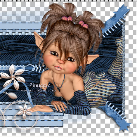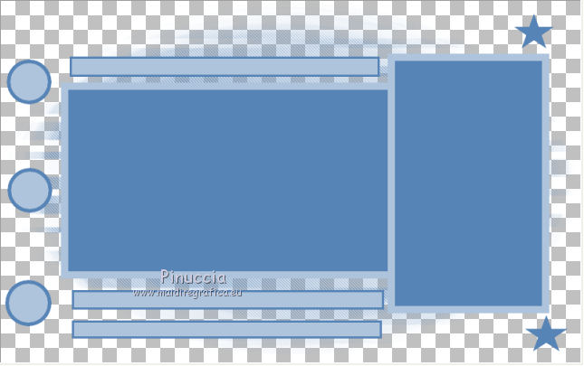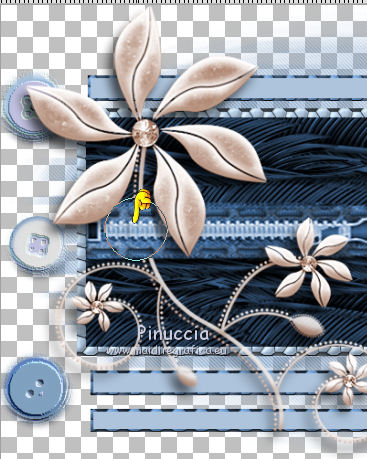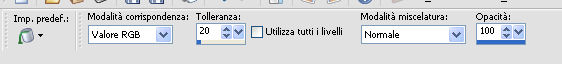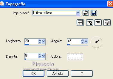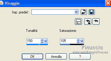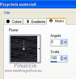qui puoi trovare qualche risposta ai tuoi dubbi. Se l'argomento che ti interessa non è presente, ti prego di segnalarmelo. Occorrente: Un tube a scelta. Il resto del materiale qui Il tube utilizzato è di Leilane. Il template è di MPD©Designs. ![]() Apri il template, che sarà la base del tuo lavoro. Elimina il livello superiore del logo. Scegli un colore dal tuo tube - per l'esempio #5885b9, e prendi nota dei valori di Tonalità (H) e Saturazione (S) di questo colore. Per l'esempio. ![]() Attiva il livello Gruppo-Raster 1. Regola>Tonalità e Saturazione>Viraggio, e trascrivi i valori annotati nelle rispettive caselle. ![]() Ripeti il Viraggio su tutti gli altri livelli. ![]() Attiva il livello Raster 1. Effetti>Effetti di trama>Ciottoli. ![]() Ripeti l'Effetto Ciottoli sui livelli Raster 3, Raster 5, Raster 7 e Raster 9. Passa il colore di sfondo a Motivi e seleziona il motivo Piume (standard in PSP). ![]() Attiva il livello Raster 2. Riempi il livello con il motivo di sfondo.Attenzione, per riempire soltanto il rettangolo, devi impostare la modalità di corrispondenza in Valore RGB. ![]() Regola>Tonalità e saturazione>Viraggio, con i settaggi precedenti. Attiva il livello Raster 4. Riempi il livello con il motivo di sfondo.Regola>Tonalità e saturazione>Viraggio, con i settaggi precedenti. Attiva il livello superiore. Apri zipper e vai a Modifica>Copia. Torna al tuo lavoro e vai a Modifica>Incolla come nuovo livello. Spostalo a sinistra contro il bordo.Apri stiches e vai a Modifica>Copia. Torna al tuo lavoro e vai a Modifica>Incolla come nuovo livello. Spostalo un po' più a sinistra.![]() Apri knoop 1 e vai a Modifica>Copia. Torna al tuo lavoro e vai a Modifica>Incolla come nuovo livello. Spostalo a sinistra, sul piccolo cerchio in alto.Effetti>Effetti artistici>Topografia. ![]() Apri knoop 2 e vai a Modifica>Copia. Torna al tuo lavoro e vai a Modifica>Incolla come nuovo livello. Spostalo a sinistra, sul piccolo cerchio al centro.Effetti>Effetti artistici>Topografia, con i settaggi precedenti. Apri knoop 3 e vai a Modifica>Copia. Torna al tuo lavoro e vai a Modifica>Incolla come nuovo livello. Spostalo a sinistra, sul piccolo cerchio in basso.Effetti>Effetti artistici>Topografia, con i settaggi precedenti. ![]() Apri Gentleflowers e vai a Modifica>Copia. Torna al tuo lavoro e vai a Modifica>Incolla come nuovo livello. Spostalo a sinistra.Scegli un altro colore in armonia con il lavoro. Regola>Tonalità e Saturazione>Viraggio, con i valori corrispondenti al nuovo colore. Attiva lo strumento Gomma ![]() e cancella la parte dello stello sopra il nastro. ![]() Apri strik e vai a Modifica>Copia. Torna al tuo lavoro e vai a Modifica>Incolla come nuovo livello. Spostalo a sinistra e un po' più in basso.Effetti>Effetti 3D>Sfalsa ombra, colore nero. ![]() Attiva lo strumento Gomma ![]() e cancella i piccoli pezzi del nastro che non devono vedersi. ![]() Dovresti avere questo. ![]() Apri il tuo tube e vai a Modifica>Copia. Torna al tuo lavoro e vai a Modifica>Incolla come nuovo livello. Immagine>Ridimensiona, se e quanto necessario, tutti i livelli non selezionato. Spostalo a destra.Cancella la parte del tube esterna alla cornice.![]() Effetti>Effetti 3D>Sfalsa ombra, con i settaggi precedenti. Attiva i livelli Raster 3 e Raster 4, e cancella la parte di questi livelli sotto il tube.![]() Risultato. ![]() Sposta le stellette dei livelli Raster 17 e Raster 18.Effetti>Effetti 3D>sfalsa ombra, con i settaggi precedenti. Se vuoi, aggiungi elementi decorativi al tuo lavoro. Per il mio esempio ho usato un pennello. Aggiungi il tuo nome e/o il tuo watermark su un nuovo livello. Per il mio esempio ho usato il font John Handy LET. Facoltativo Livelli>Nuovo livello raster. Riempi il livello con il colore bianco.Livelli>Disponi>Porta sotto. Immagine>Aggiungi bordatura, 1 pixel, simmetriche, con un colore scuro scelto dall'immagine Salva in formato jpg. ![]() Se hai problemi o dubbi, o trovi un link non funzionante, o anche soltanto per un saluto, scrivimi. |