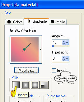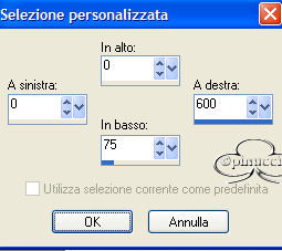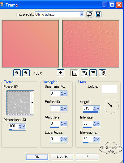 qui puoi trovare qualche risposta ai tuoi dubbi. Se l'argomento che ti interessa non è presente, ti prego di segnalarmelo. Materiale: qui I tubes che ho usato vengono dai gruppi High_Standard_Tubes e Top_Design_Tubes (chiusi) Metti il gradiente nella cartella Gradienti e i pennelli nella cartella Pennelli. Apri i tubes in PSP. Apri una nuova immagine trasparente 600 x 450 pixels e riempila con il gradiente tp_Sky After Rain, con i seguenti settaggi:![]() Effetti>Effetti di trama>Trama, clicca sul triangolino indicato dalla manina per aprire il menu cerca e seleziona la trama Plastic 2: ![]() con questi settaggi: ![]() Livelli>Nuovo livello raster. Attiva lo strumento Selezione ![]() Selezione personalizzata con questi settaggi:![]() Riempi la selezione con il gradiente.Effetti>Effetti 3D>Sfalsa ombra, con i seguenti settaggi, colore nero: ![]() Selezione>Nessuna selezione. Livelli>Duplica. Immagine>Capovolgi. Apri il file della cintura (hs_element straps) e vai a Modifica>Copia. Torna al tuo lavoro e vai a Modifica>Incolla>Incolla come nuovo livello. Apri il file dell'orologio (hs_element) e vai a Modifica>Copia. Torna al tuo lavoro e vai a Modifica>Incolla>Incolla come nuovo livello. Spostalo a sinistra, tra le due borchie centrali, come nell'esempio:![]() Livelli>Duplica. Livelli>Disponi>Sposta giù. Ripeti Livelli>Disponi>Sposta giù. Così il livello si troverà sotto il livello della cintura. Posizionati sul livello superiore. Attiva lo strumento Gomma e cancella il piccolo pezzo di catena,vedi l'esempio. ![]() Effetti>Effetti 3D>Sfalsa ombra, con i settaggi precedenti. Attiva il livello inferiore. Apri il tube Goldforlove e vai a Modifica>copia. Torna al tuo lavoro e vai a Modifica>Incolla>Incolla come nuovo livello. Puoi lasciarlo come si trova. Apri il tube dell'uomo e vai a Modifica>Copia. Torna al tuo lavoro e vai a Modifica>Incolla>Incolla come nuovo livello. Spostalo a sinistra.Nella paletta dei livelli abbassa l'opacità al 40%. Attiva lo strumento Gomma e cancella la parte del tubeche si trova sul lato destro dell'orologio. ![]() Posizionati sul livello superiore. Apri il tube della donna e vai a Modifica>Copia. Torna al tuo lavoro e vai a Modifica>Incolla>incolla come nuovo livello. Spostalo a destra.Attiva lo strumento Penna e passa il colore di primo piano su un Motivo dorato.Scegli una linea di stile: Diamondline_kris, dimensione 2 e traccia due linee sui due lati della tag. ![]() un piccolo consiglio: tieni premuto il tasto shift, così sarai sicuro che la linea sarà diritta. Cambia il colore di primo piano su #a57285. Attiva lo strumento pennello e cerca il pennello agibrush-wastedyears.Applicalo cliccando una volta sulla sinistra. Cerca il pennello agibrush-wastedtears e applicalo cliccando una volta a destra. Livelli>Unisci>Unisci tutto. Aggiungi il tuo nome e il watermark sulla tag e hai finito. ![]() ![]() Se hai problemi o dubbi, o trovi un link non funzionante, o anche soltanto per un saluto, scrivimi. Luglio 2006 |
