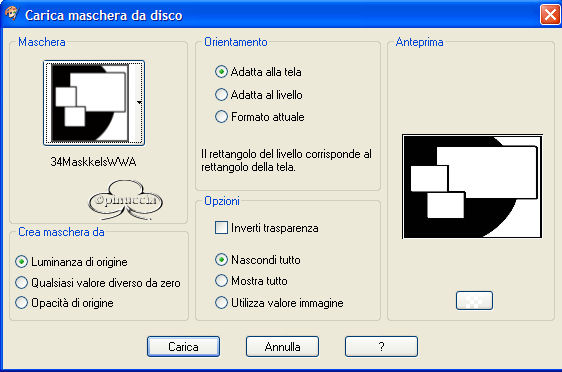qui puoi trovare qualche risposta ai tuoi dubbi. Se l'argomento che ti interessa non è presente, ti prego di segnalarmelo. Materiale qui Il tube viene dal gruppo yahoo High_Standard_Tubes Apri il tube in PSP, metti la maschera nella cartella maschere e il pennello nella cartella pennelli. Scegli un bel colore dal tube come colore di primo piano (io ho scelto #26749c) e il nero come colore di sfondo. Apri una nuova immagine trasparente 600 x 450 pixels e riempila con il colore di primo piano.Livelli>Nuovo livello raster. Riempi il nuovo livello con il nero.Livelli>Carica/salva maschera>Carica maschera da disco cerca e carica la maschera 34MaskkelsWWA. ![]() Attiva lo strumento Bacchetta magica e seleziona