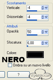 il grande rettangolo nero.Apri il tube e vai a Modifica>Copia. Torna al tuo lavoro e vai a Modifica>Incolla>Incolla nella selezione. Selezione>Nessuna selezione. Livelli>Unisci>Unisci gruppo. Attiva lo strumento pennello ![]() e cerca il pennello blackengrid2sides-kris. Imposta il colore di primo piano su un altro colore del tube. Io ho scelto #ce5e39. Applica il pennello a sinistra nell'angolo in alto, contro il bordo nero (sopra e a sinistra). ![]() Apri il tube e vai a Modifica>Copia. Torna al tuo lavoro e vai a Modifica>Incolla>Incolla come nuovo livello. Immagine>Rifletti. Spostalo in basso.Effetti>Effetti 3D>Sfalsa ombra, con i seguenti settaggi, colore nero: ![]() Attiva nuovamente lo strumento Pennello ![]() e cerca il pennello Deftones01Danetta[7-2-06]. Applica il testo una sola volta al centro del rettangolo più piccolo. Livelli>Unisci>Unisci tutto. Aggiungi il tuo nome e il watermark e hai finito. Per favore, lascia intatto il watermark del tube. ![]() Se hai problemi o dubbi, o trovi un link non funzionante, o anche soltanto per un saluto, scrivimi. Luglio 2006 |