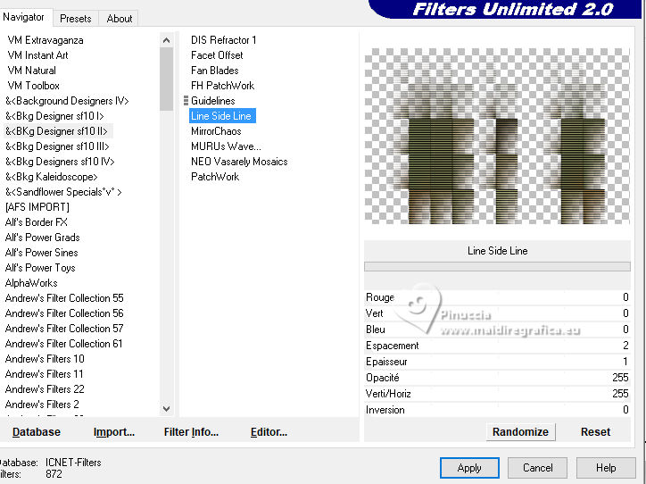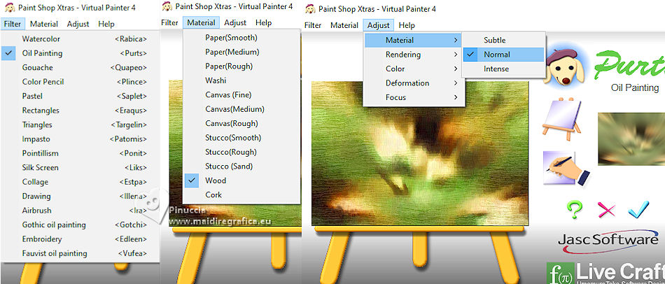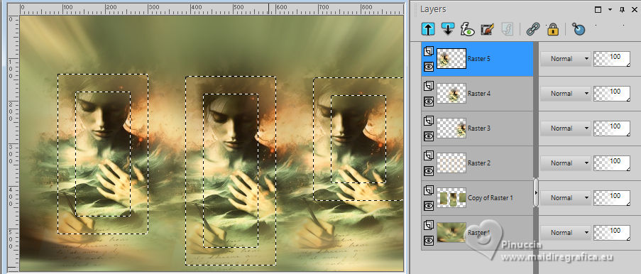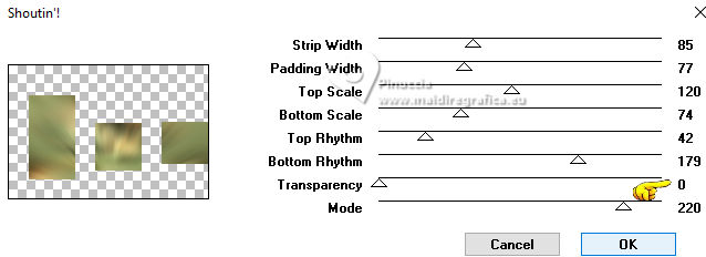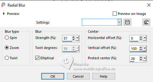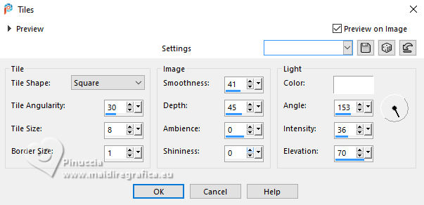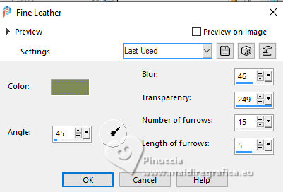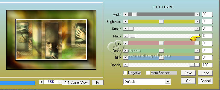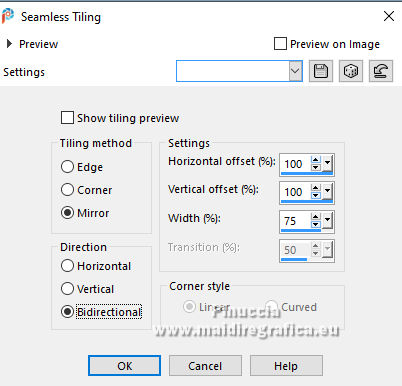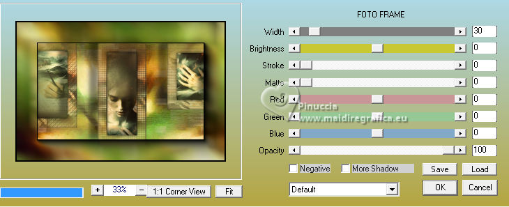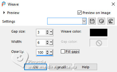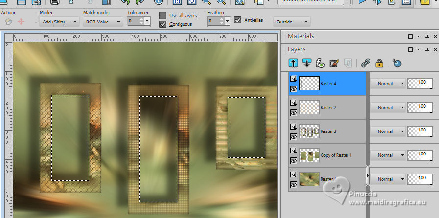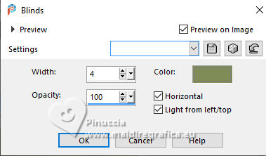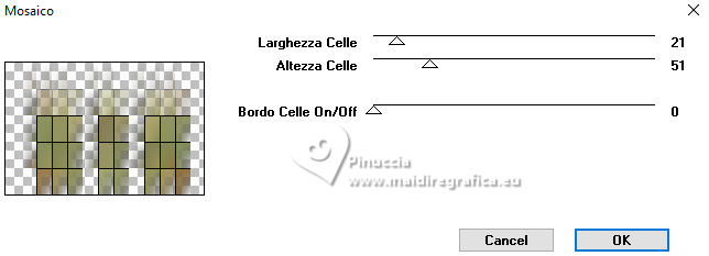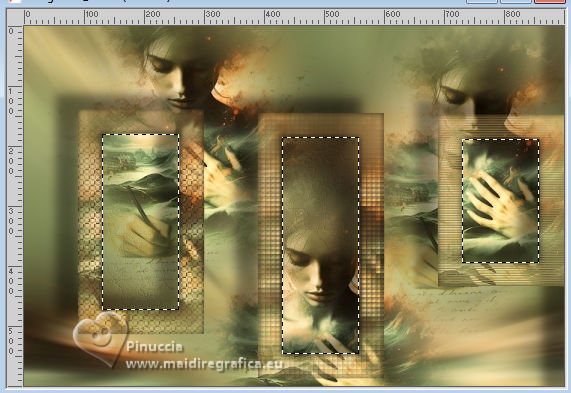 For this tutorial, you will need: ![]() For the tube thanks PqnaAlice (The links of the tubemakers here). ![]() consult, if necessary, my filter section here Filters Unlimited 2.0 here Factory Gallery D - Shoutin'! here &<Bkg Designer sf10II> - Line Side Line (to import in Unlimited) here AAA Frames - Foto Frame here Italian Editors Effect - Mosaico here Virtual Painter 4 here Filters Factory Gallery and Italian Editors can be used alone or imported into Filters Unlimited. (How do, you see here) If a plugin supplied appears with this icon ![]() You can change Blend Modes according to your colors. ![]() 1. Choose 2 colors to works. Set your foreground color to #808c58, and your background color to #fbb565. ![]() 2. Open a new transparent image 900 x 600 pixels. Flood Fill the transparent image with your foreground color.Selections>Select All. 3. Open the misted 1094MulherByPqnaAlice ![]() Erase the watermark and go to Edit>Copy. Go back to your work and go to Edit>Paste Into Selection. Selections>Select None. 4. Effects>Image Effects>Seamless Tiling - default settings. ![]() Adjust>Blur>Radial Blur. ![]() 5. Layers>Duplicate. Effects>Plugins>Filter Factory Gallery D - Shoutin'! ![]() 6. Selections>Select All. Selections>Float. Selections>Defloat. Selections>Modify>Select Selection Borders ![]() 7. Layers>New Raster Layer. Reduce the opacity of your Flood Fill Tool to 20%. Flood Fill the selection with your background color.![]() Note: Set again the opacity of your Flood Fill Tool to 100%. 8. Edit>Paste as new layer - the tube 1094MulherByPqnaAlice is still in memory. Move the tube to fit the left frame.Again Edit>Paste as new layer, and snap it to the center frame. Another time Edit>Paste as new layer, and snap it to the right frame. ![]() 9. Selections>Invert. You are on the layer 5. Press CANC on the keyboard ![]() Activate the layer 4 and press again CANC on the keyboard. Activate the layer 3 and press again CANC on the keyboard. ![]() 10. Selections>Invert. You are on the layer Raster 3. Effects>Texture Effects>Blinds, foreground color. ![]() Adjust>Sharpness>Sharpen. 11. Activate the layer Raster 4. Effects>Texture Effects>Tiles. ![]() 12. Activate the layer Raster 5. Effects>Texture Effects>Weave weave color: black #000000. ![]() 13. Keep selected. Layers>Merge>Merge Down - 2 times. Layers>Arrange>Move Down. ![]() 14. Effects>3D Effects>Drop Shadow, color black #000000. ![]() 15. Activate the layer Raster 2. Layers>New Raster Layer. Effects>3D Effects>Cutout. ![]() 16. Selections>Select None. Activate your Magic Wand Tool ![]() Click in the frames to select them. ![]() 17. Activate the layer Raster 1. Selections>Promote Selection to Layer. Layers>Arrange>Move Up. Effects>Texture Effects>Fine Leather, foreground color. ![]() 18. The tube 1094MulherByPqnaAlice is always in memory: Edit>Paste As New Layer. Place a part of the tube on the left rectangle.Again Edit>Paste As New Layer, and place another part on the central rectangle.Again Edit>Paste As New Layer and place another part on the right rectangle.![]() 19. Layers>Merge>Merge Down - 2 times. Selections>Invert. Press CANC on the keyboard. 20. Selections>Invert. Layers>New Raster Layer. Effects>3D Effects>Cutout. ![]() Selections>Select None. 21. Activate the layer Copy of Raster 1. Effects>Reflection Effects>Rotating Mirror. ![]() 22. Effects>Image Effects>Seamless Tiling. ![]() 23. Effects>Plugins>Italian Editors Effect - Mosaico. ![]() 24. Effects>Plugins>Filters Unlimited 2.0 - &<Bkg Designer sf10II> - Line Side Line, default settings. ![]() Change the Blend Mode of this layer to Lighten, or to your liking. Effects>3D Effects>Drop Shadow, color black #000000. ![]() 25. Activate the layer Raster 1. Effects>Plugins>Virtual Painter - Virtual Painter 4. ![]() 26. Close the two bottom layers: Copy of Raster 1 and Raster 1. Activate the layer above. Layers>Merge>Merge Visible. Pick Tool ![]() Position X: -4,00, Position Y: -54,00. ![]() Open the closed layers: Layers>View>All. Layers>Merge>Merge Visibile. 27. Effects>Plugins>AAA Frames - Foto Frame. ![]() 28. Effects>Plugins>AAA Frames - Foto Frame. ![]() 29. Open tituloSim_BySoxikibem ![]() Erase the watermark and go to Edit>Copy. Go back to your work and go to Edit>Paste As New Layer. Pick Tool ![]() Position X: 42,00 - Position Y: 147,00. ![]() 30. Image>Resize, if you want. Sign your work. Save as jpg. For the tube of these versions thanks Béa ![]() Luz Cristina ![]() ![]() Your versions. Thanks ![]() Louise ![]() ![]() If you have problems or doubts, or you find a not worked link, or only for tell me that you enjoyed this tutorial, write to me. |