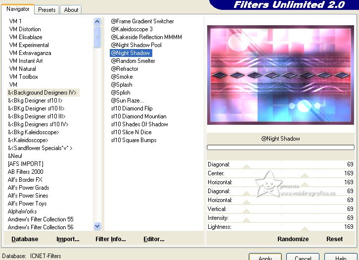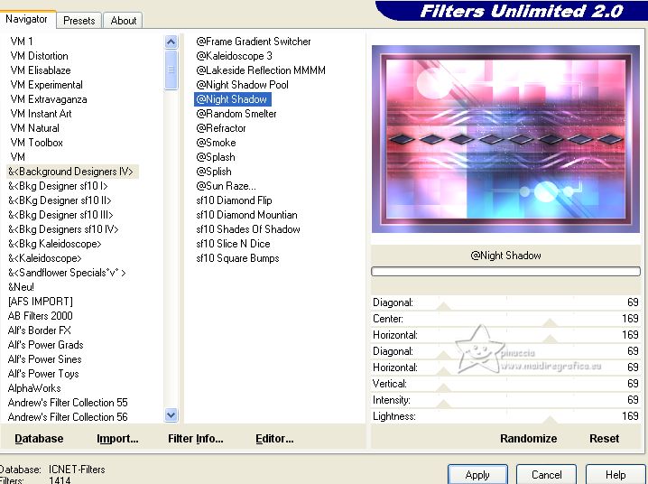 22. Effects>Plugins>Filters Unlimited 2.0 - &<Background Designers IV> - Night Shadow, default settings.